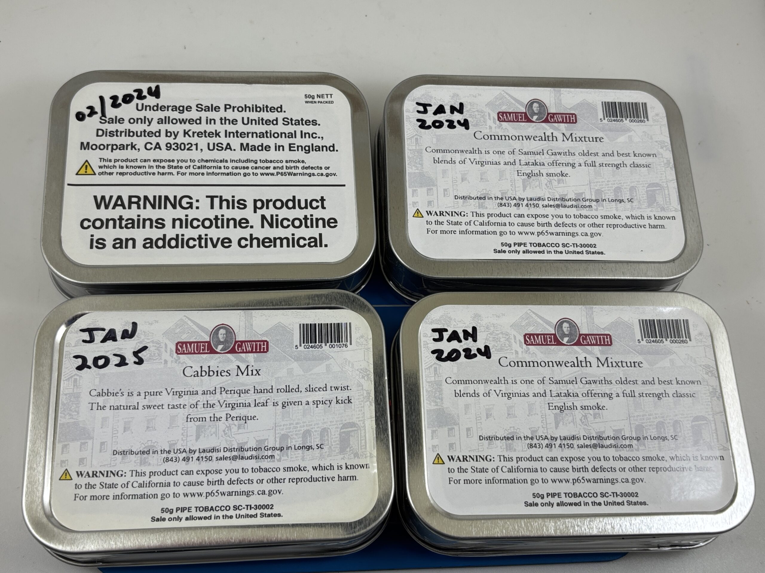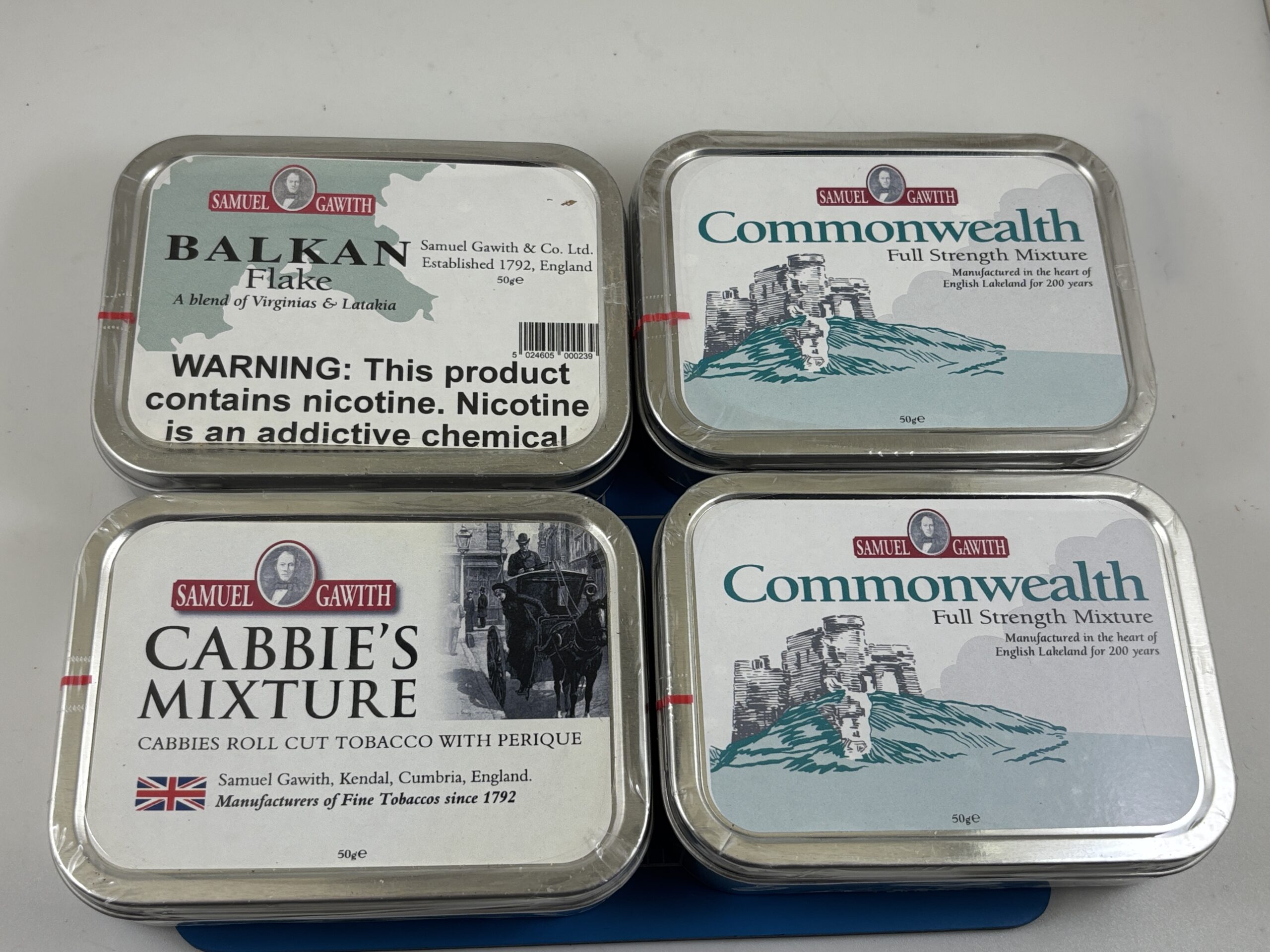 Lot of 4 Excellent Sealed Samuel Gawith Tobacco 50g. Tins. 2 Commonwealth, Balkan Flake, & Cabbie's Mixture.