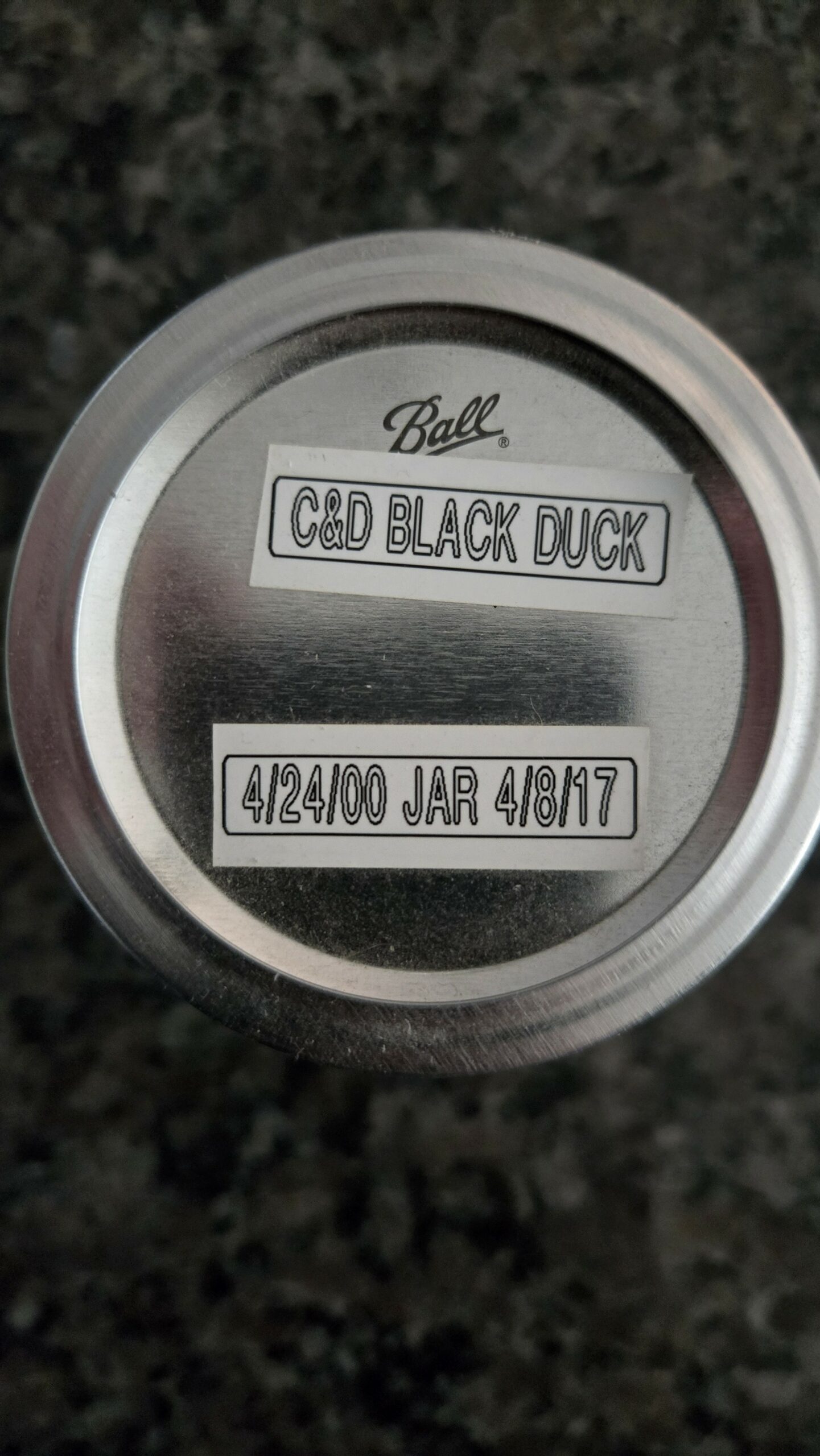 Sealed 2 oz. jar of Black Duck aged from 2000. Tin opened and jarred in 2017 from tin bulge. 26yrs old. Kept in temp controlled cellar.