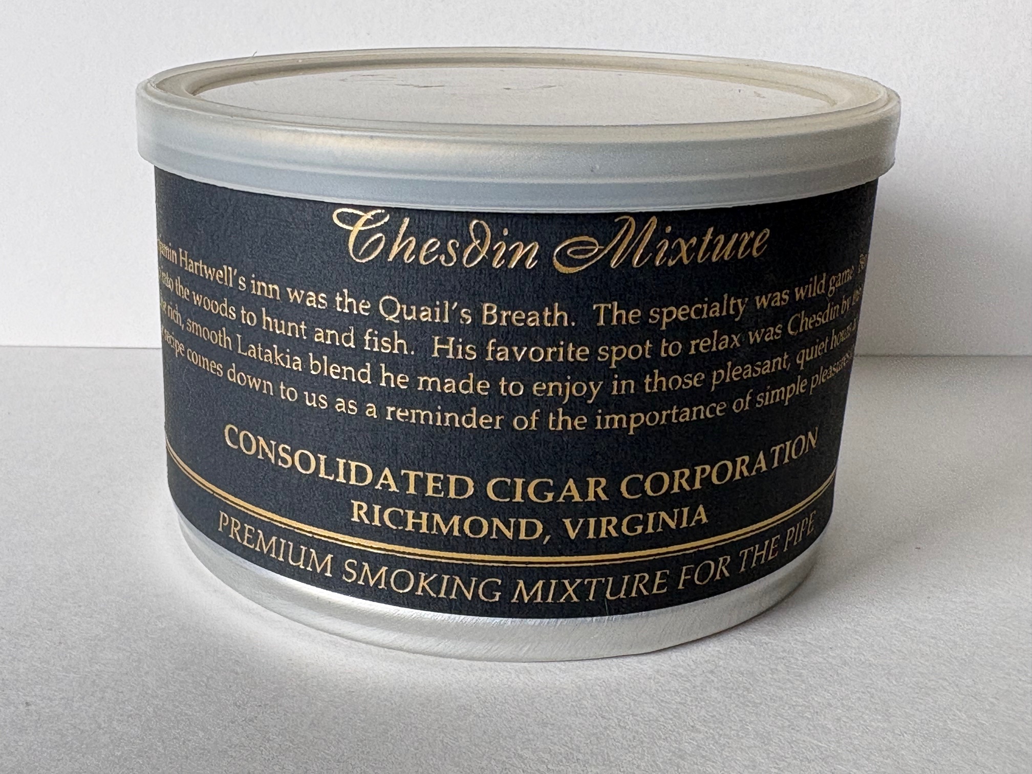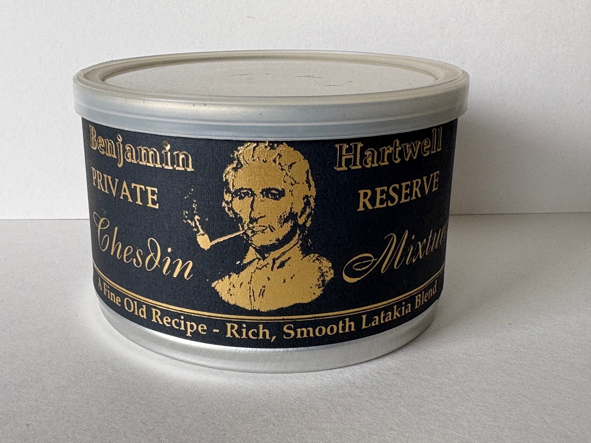 Opened tin of 1997 McClelland Benjamin Hartwell Chesdin Mixture approximately 1.6 ounces.