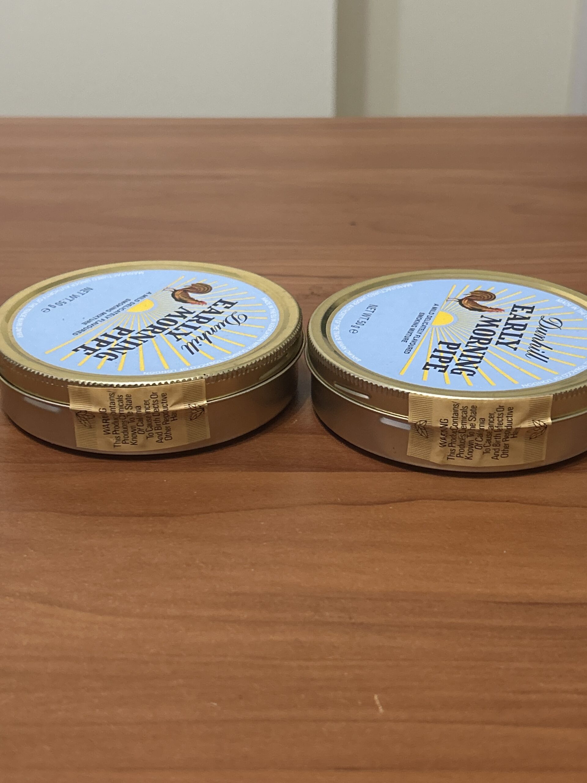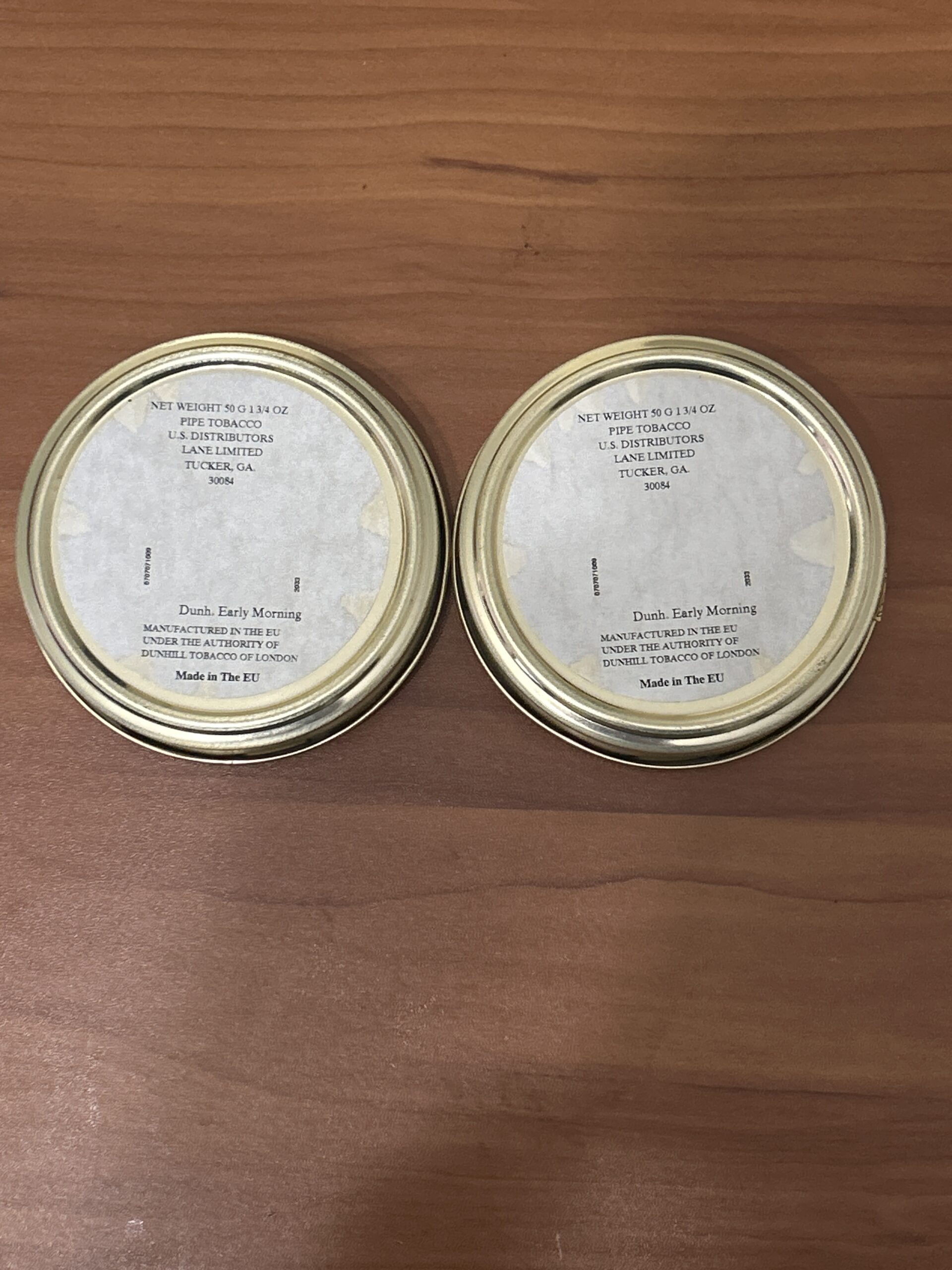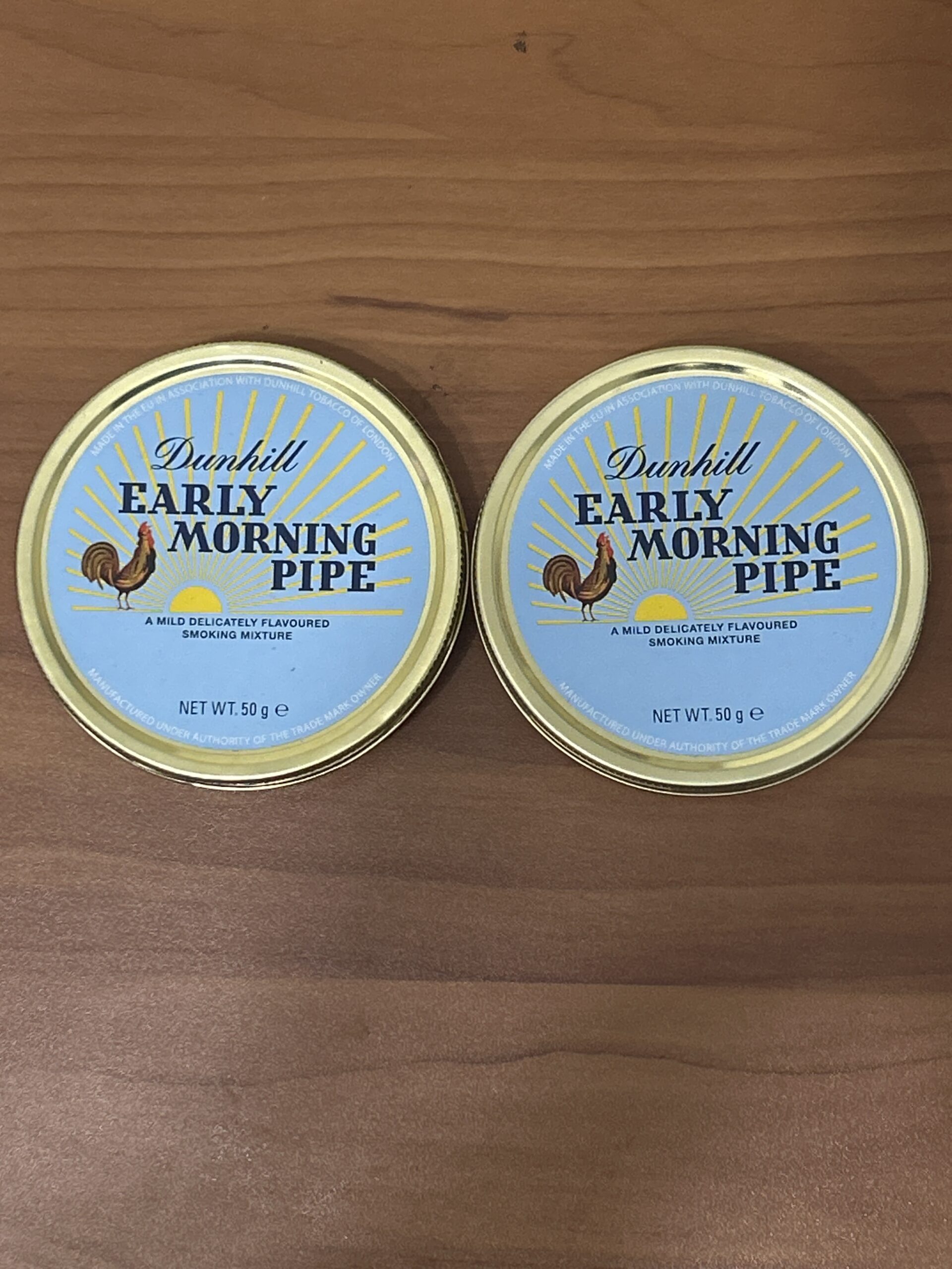 Dunhill, Early Morning Pipe (dated 2007, purchased 2010), two (2) 50 gr sealed tins. has some age on it, has been stored in a temperature and humidity controlled environment, 5 day no reserve auction