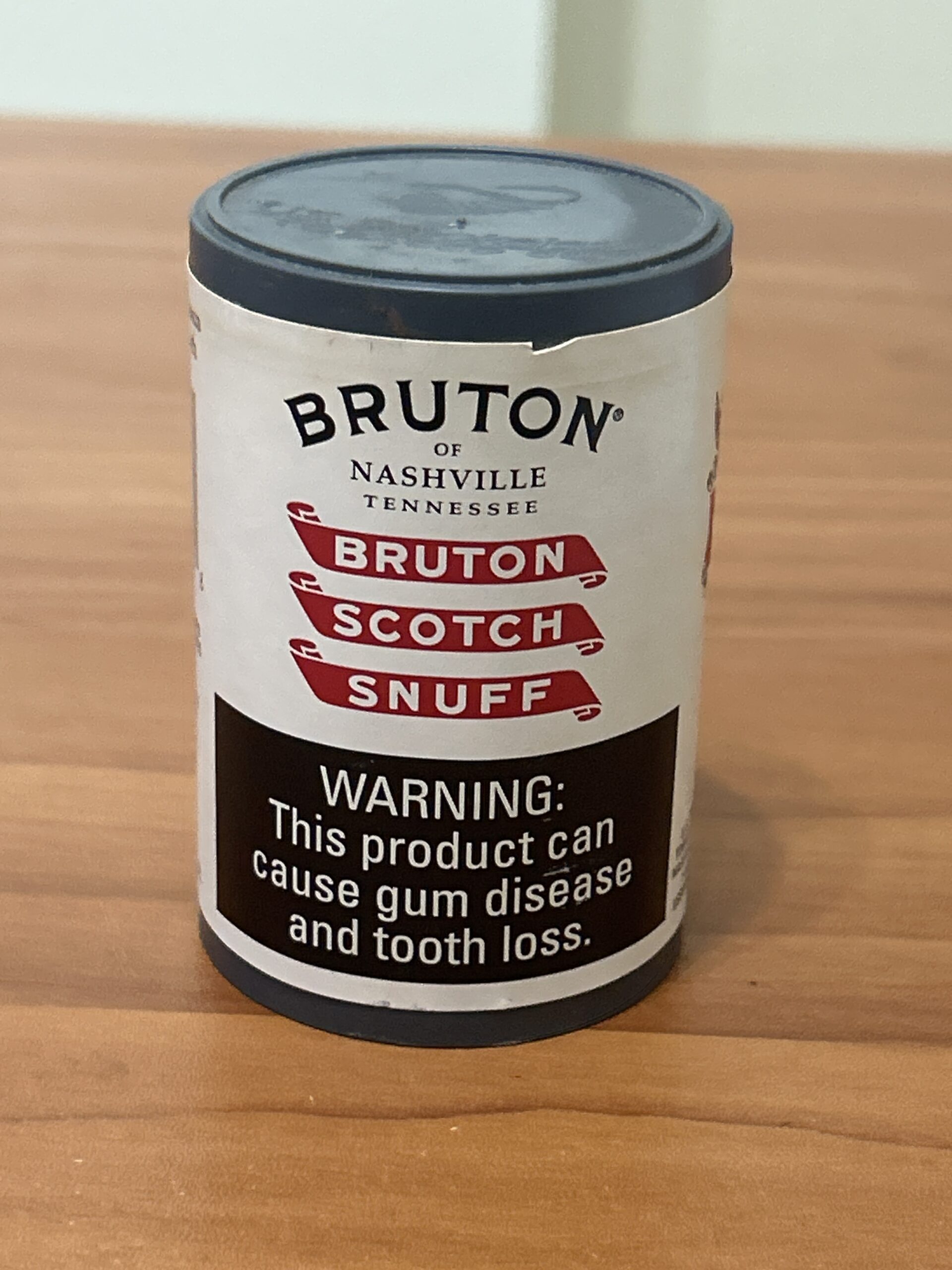 Bruton, Scotch Snuff (Nashville TN), 2.75 oz sealed tin, has some age on it, has been stored in the temperature and humidity controlled environment, 5 day no reserve auction
