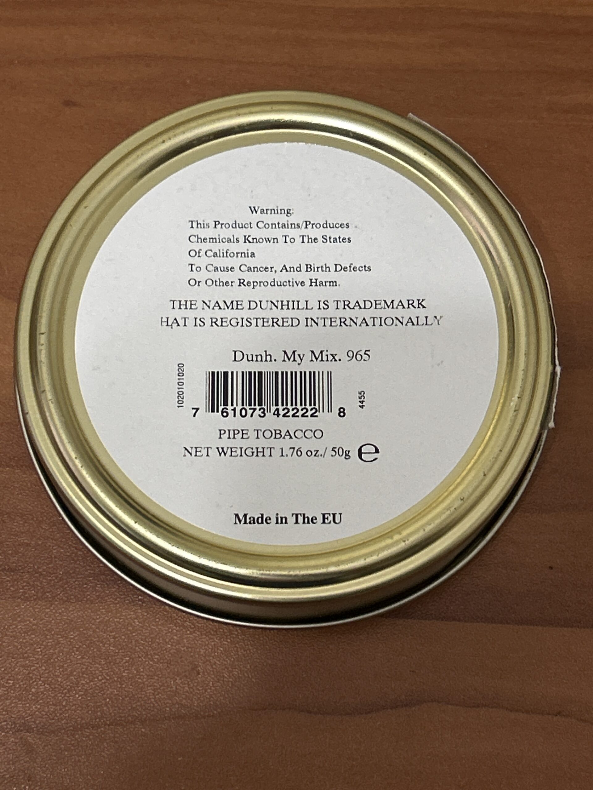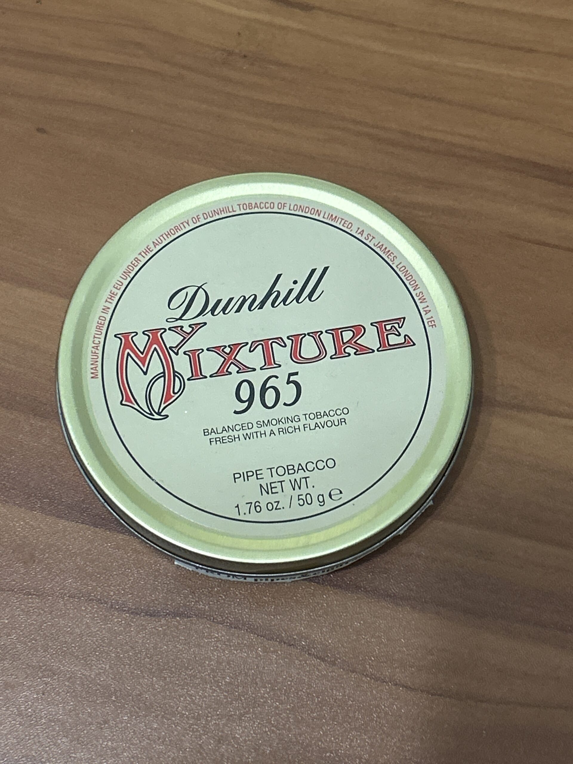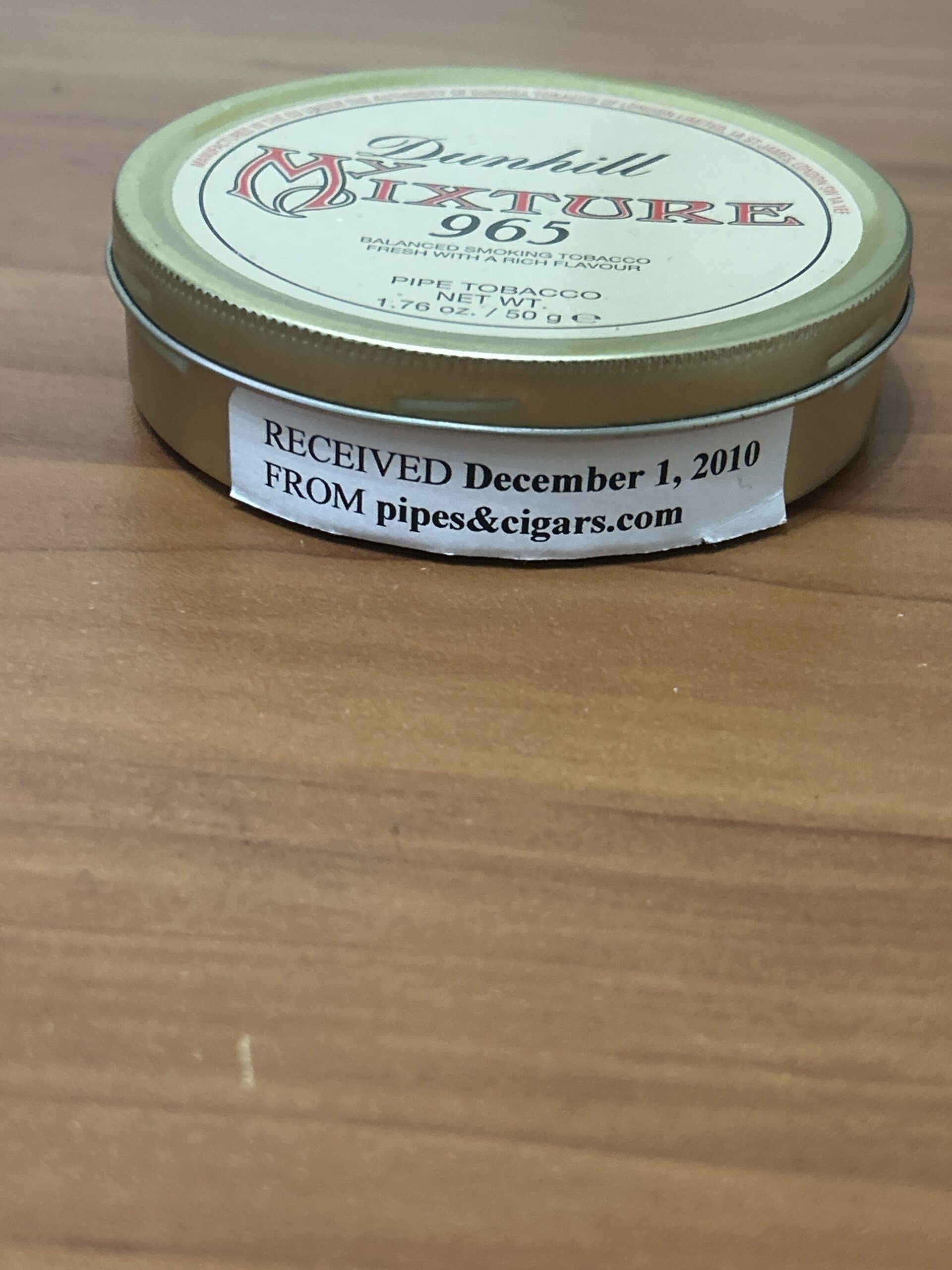 Dunhill, My Mixture 965 (dated 2010, purchased 2010), 50 gr sealed tin, has some age on it, has been stored in a temperature and humidity controlled environment, 5 day no reserve auction
