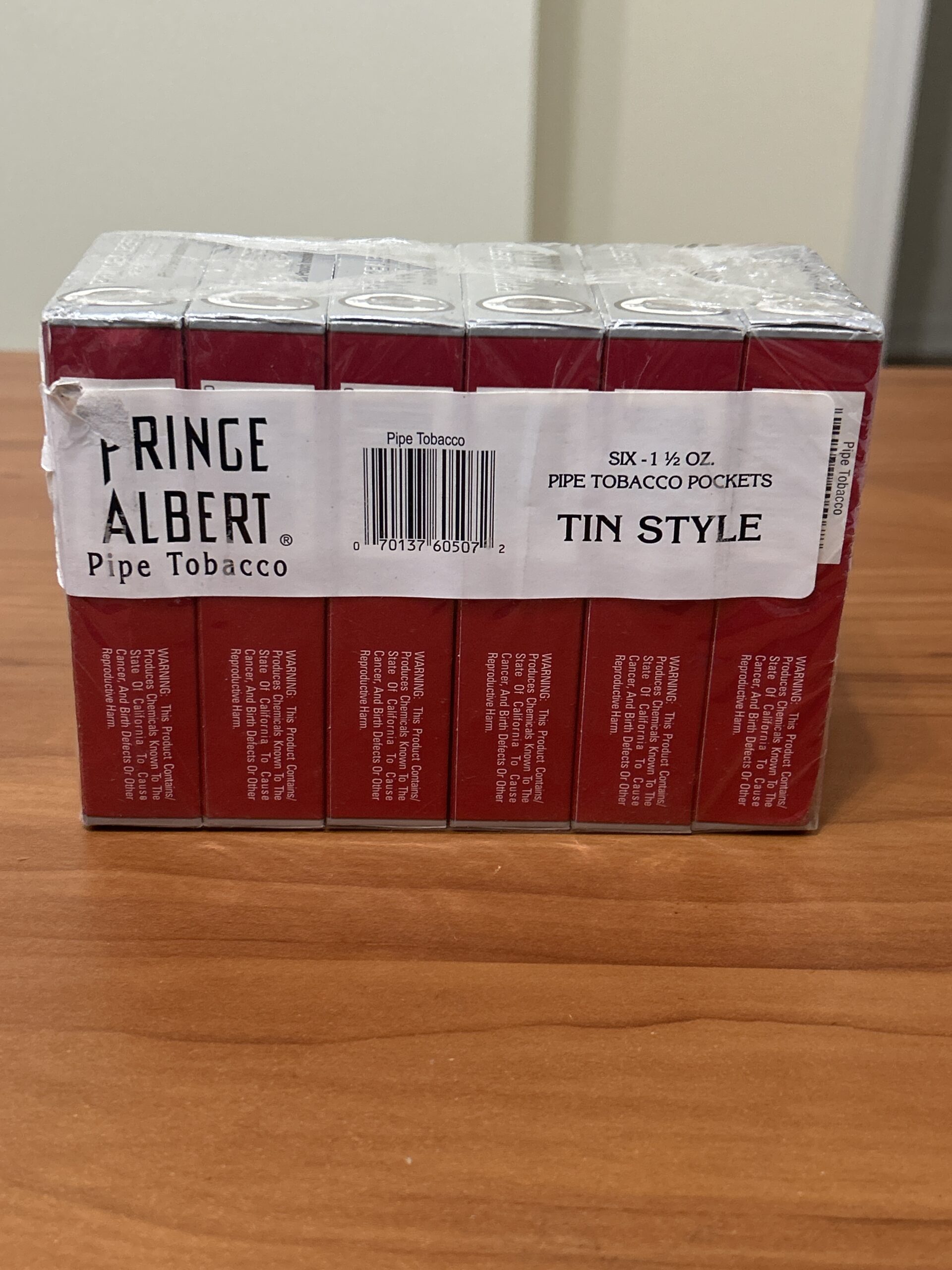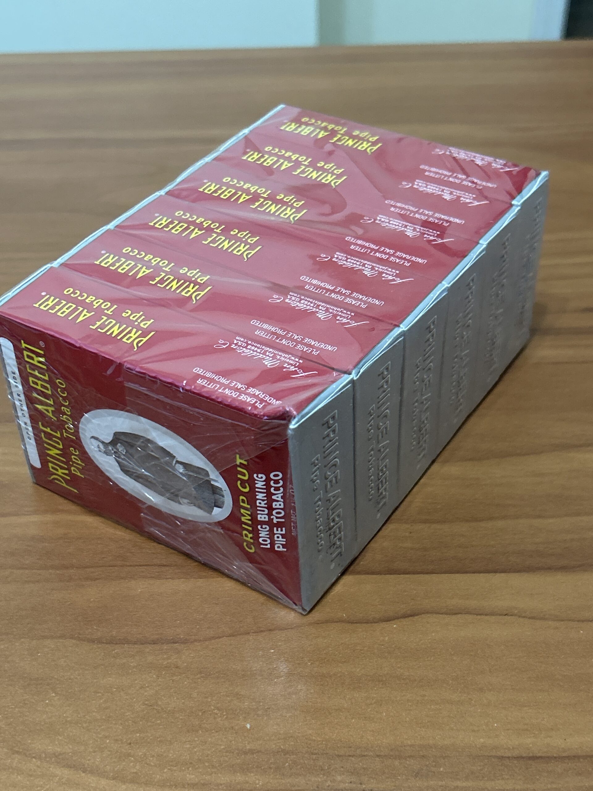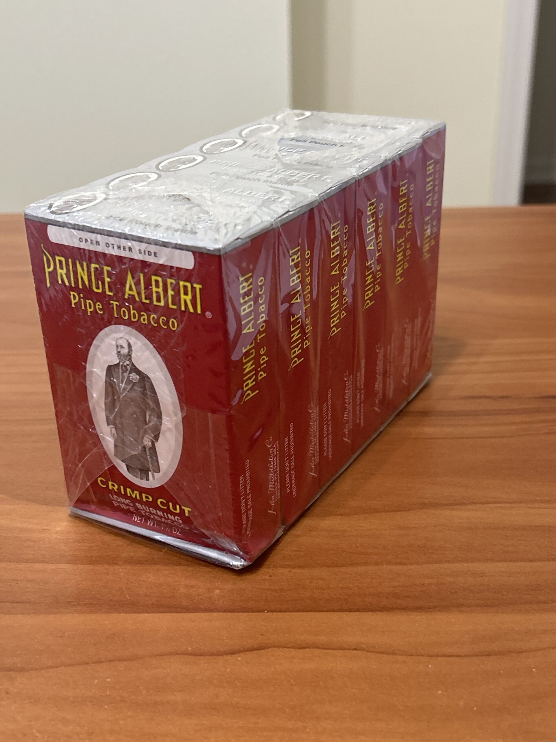 Prince Albert, Crimp Cut, by John Middleton Co, 6- 1.5 oz sealed boxes in factory sealed cellophane, has been stored in a temperature and humidity controlled environment. 5 day no reserve auction
