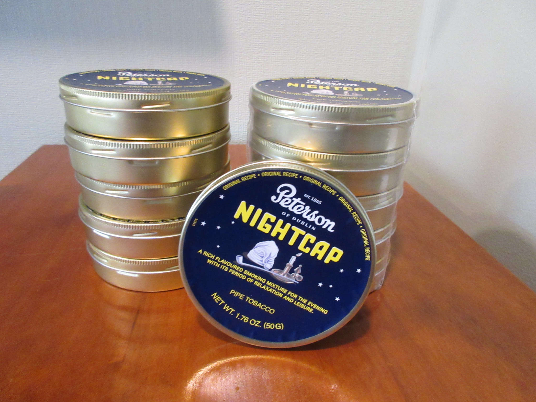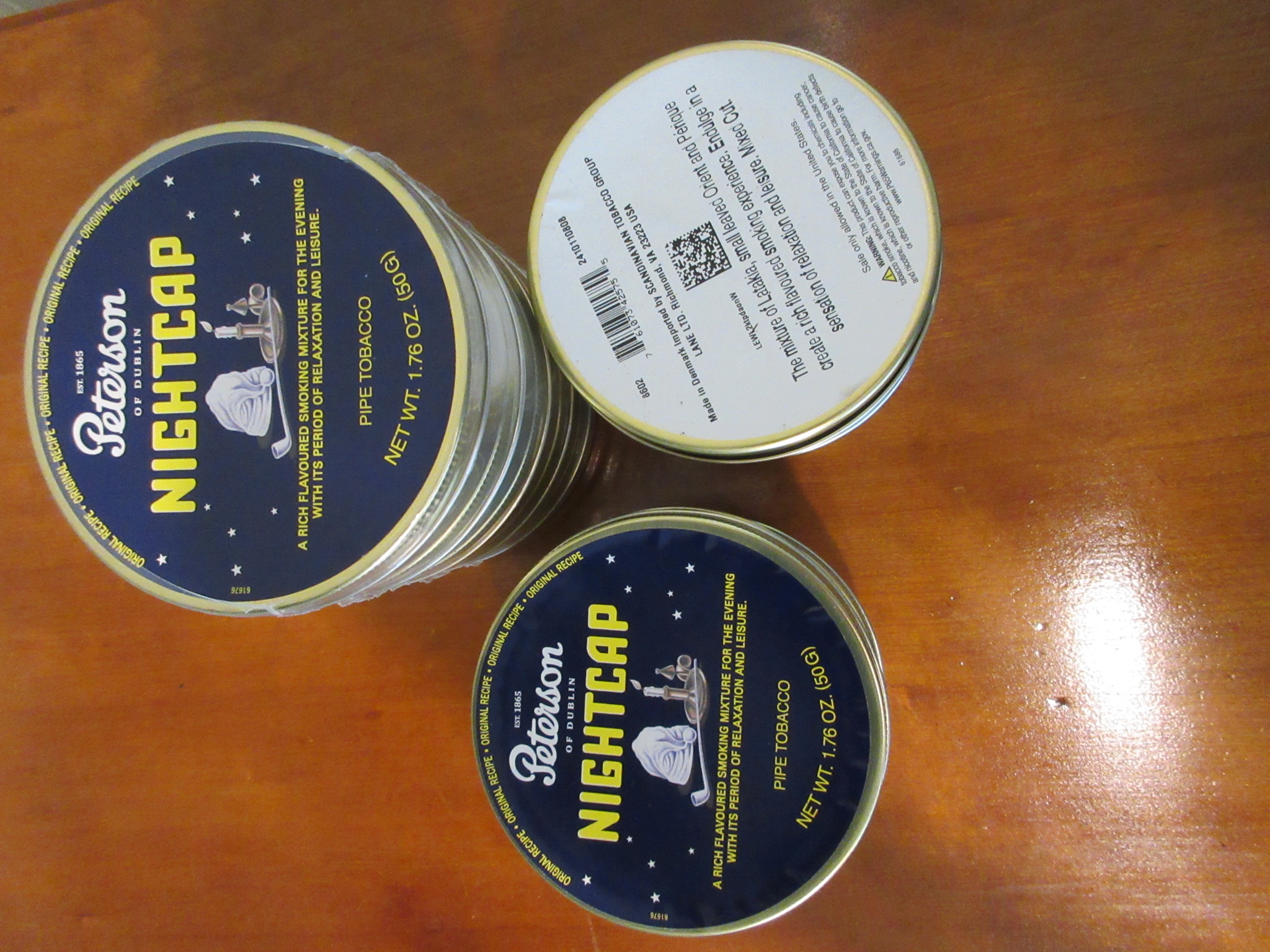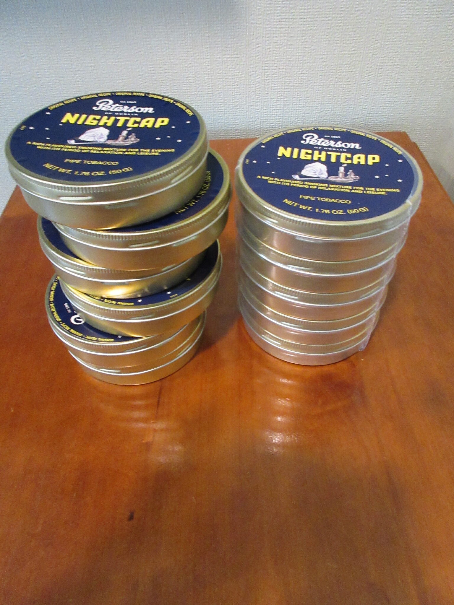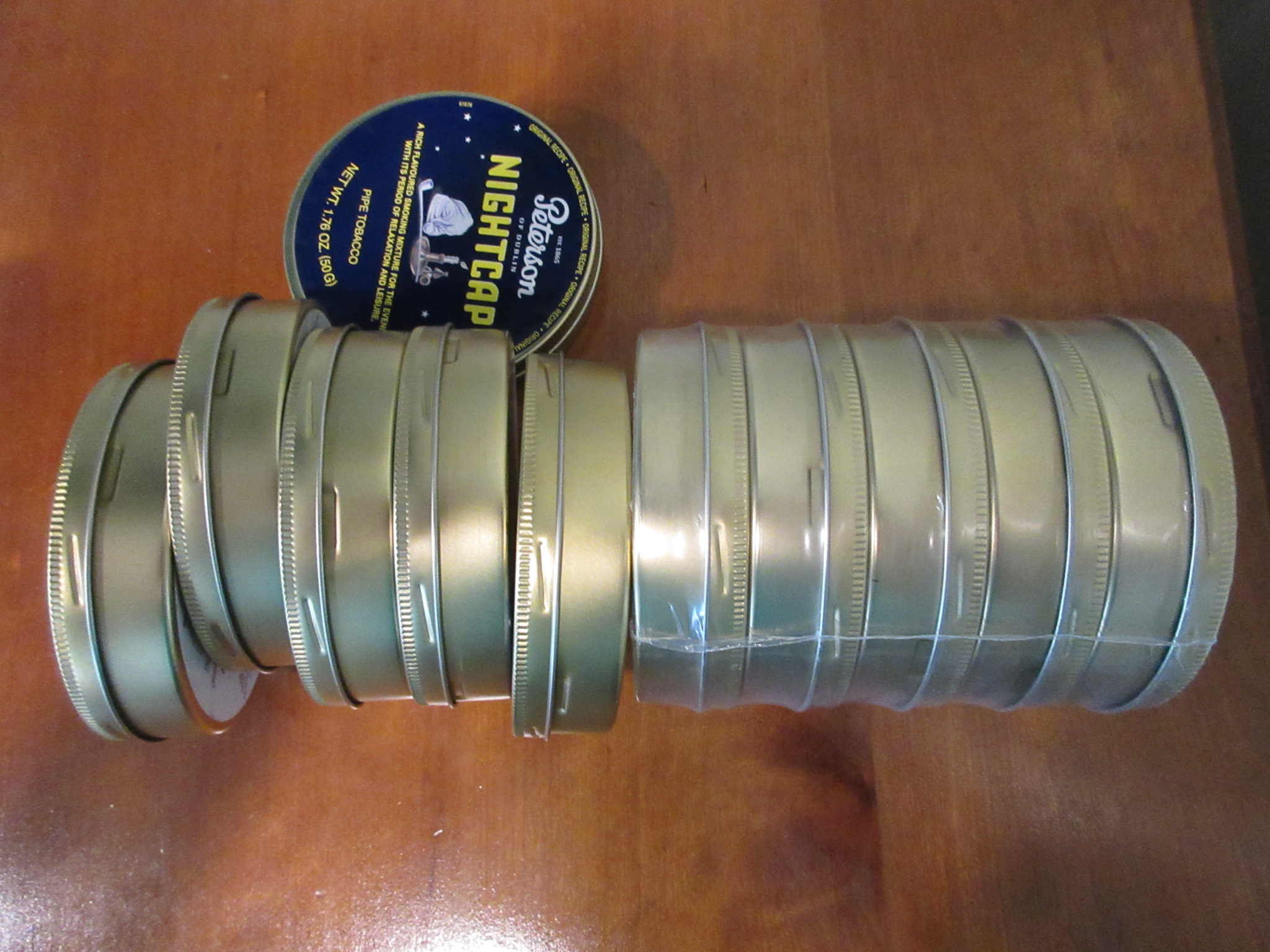 Eleven tins of Peterson's Nightcap: 5 wrapped, 6 loose.
