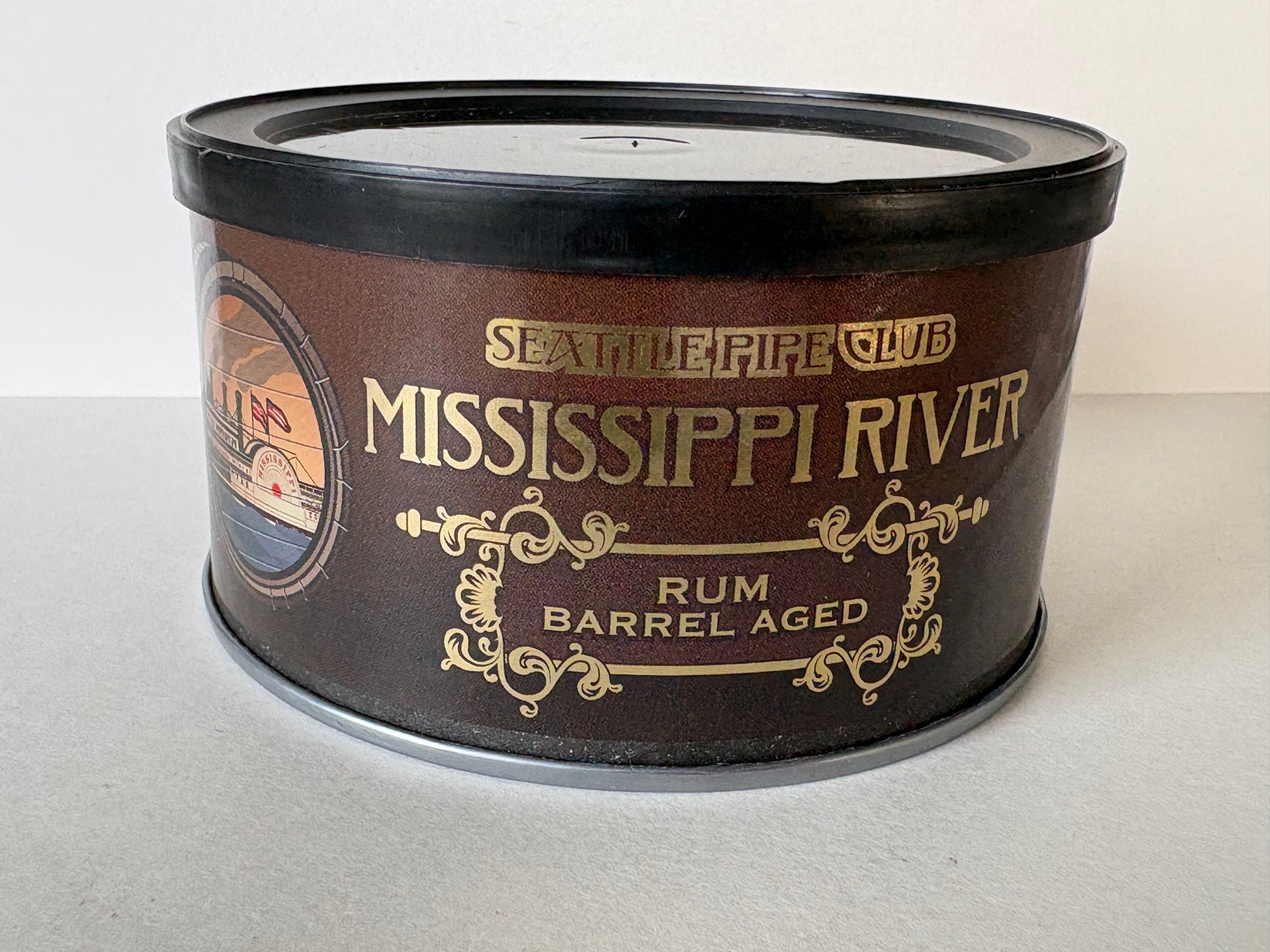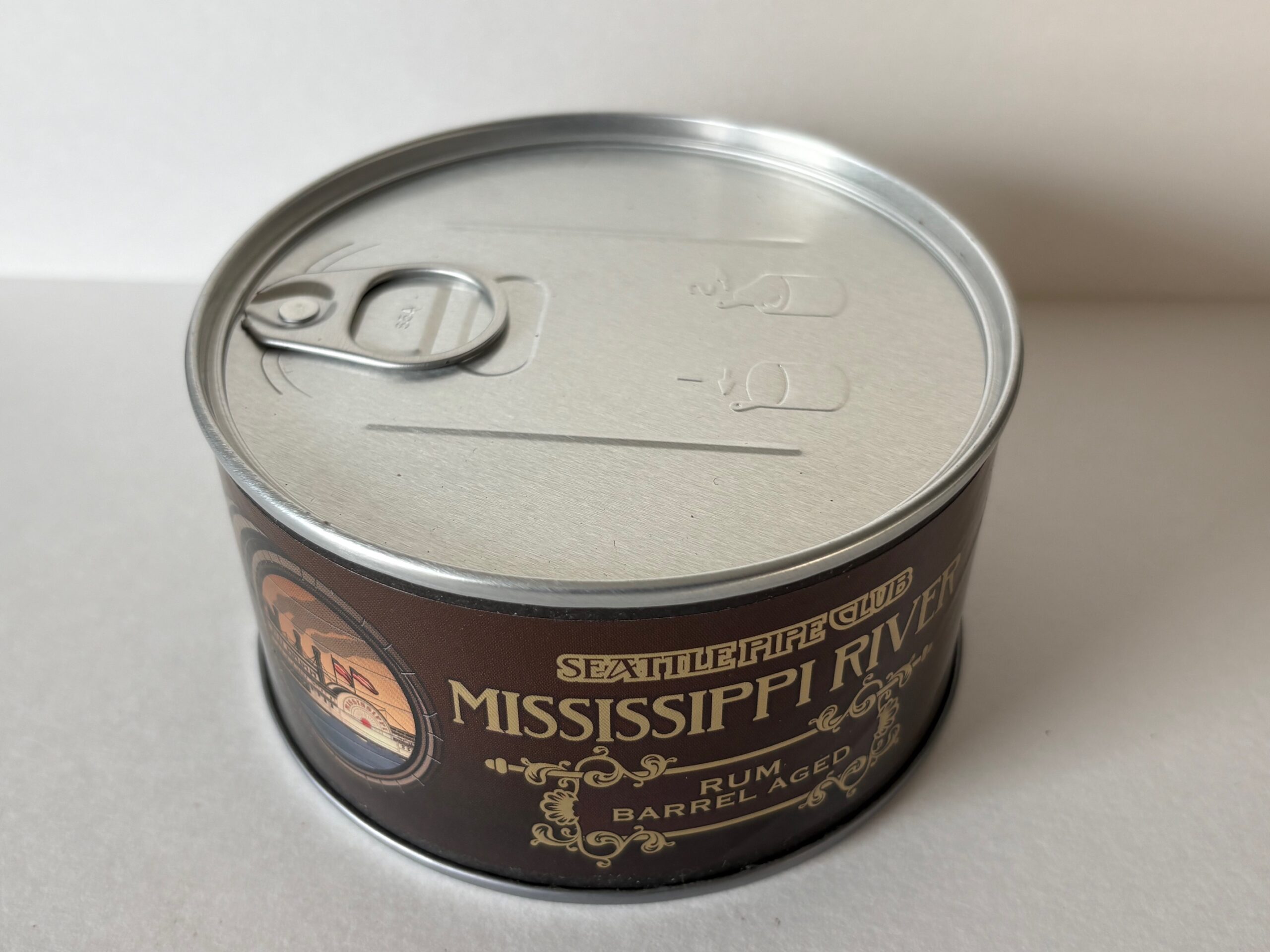 Unopened 2 ounce tin of 2020 Seattle Pipe Club Mississippi River Rum Barrel Aged.