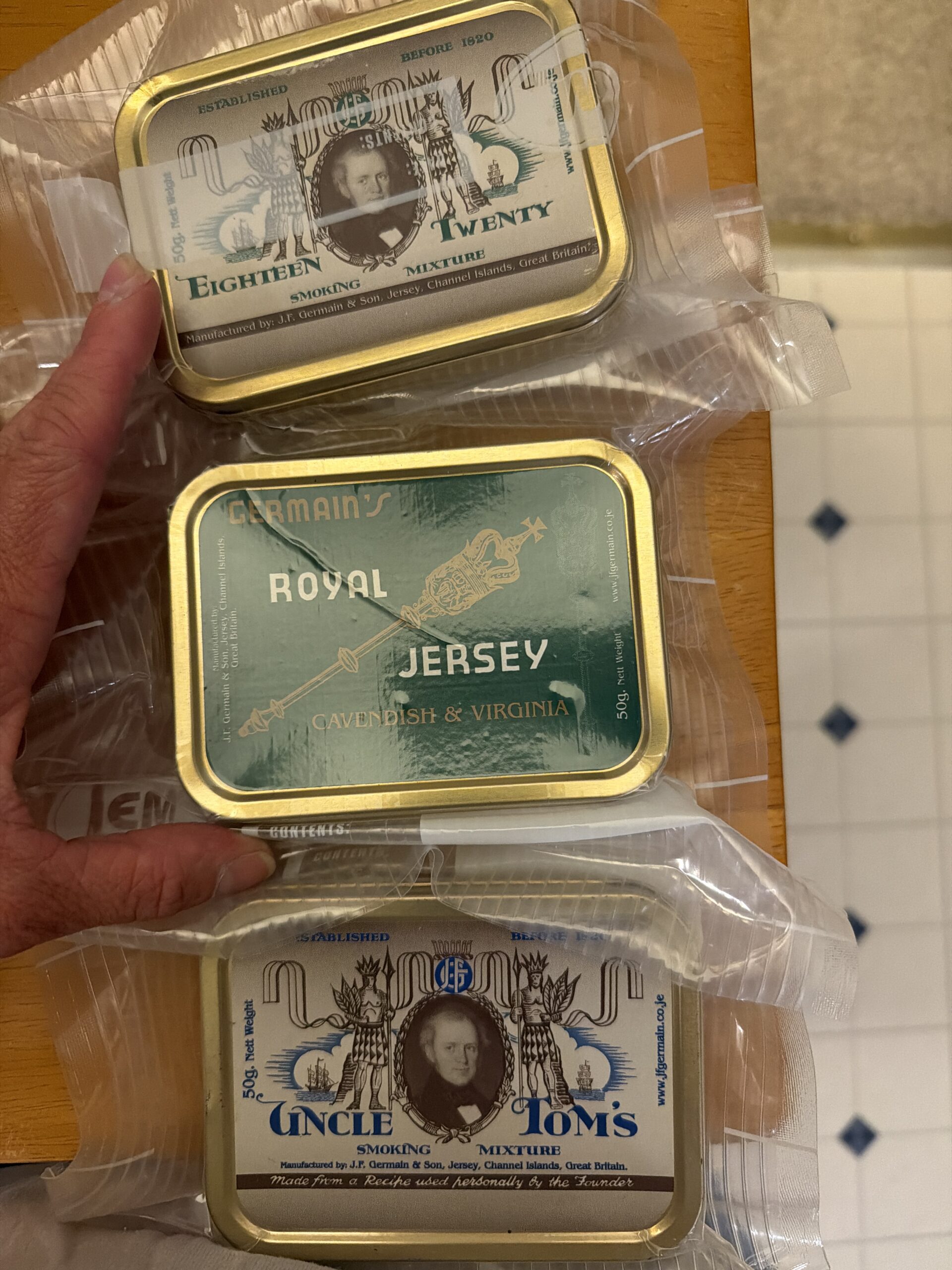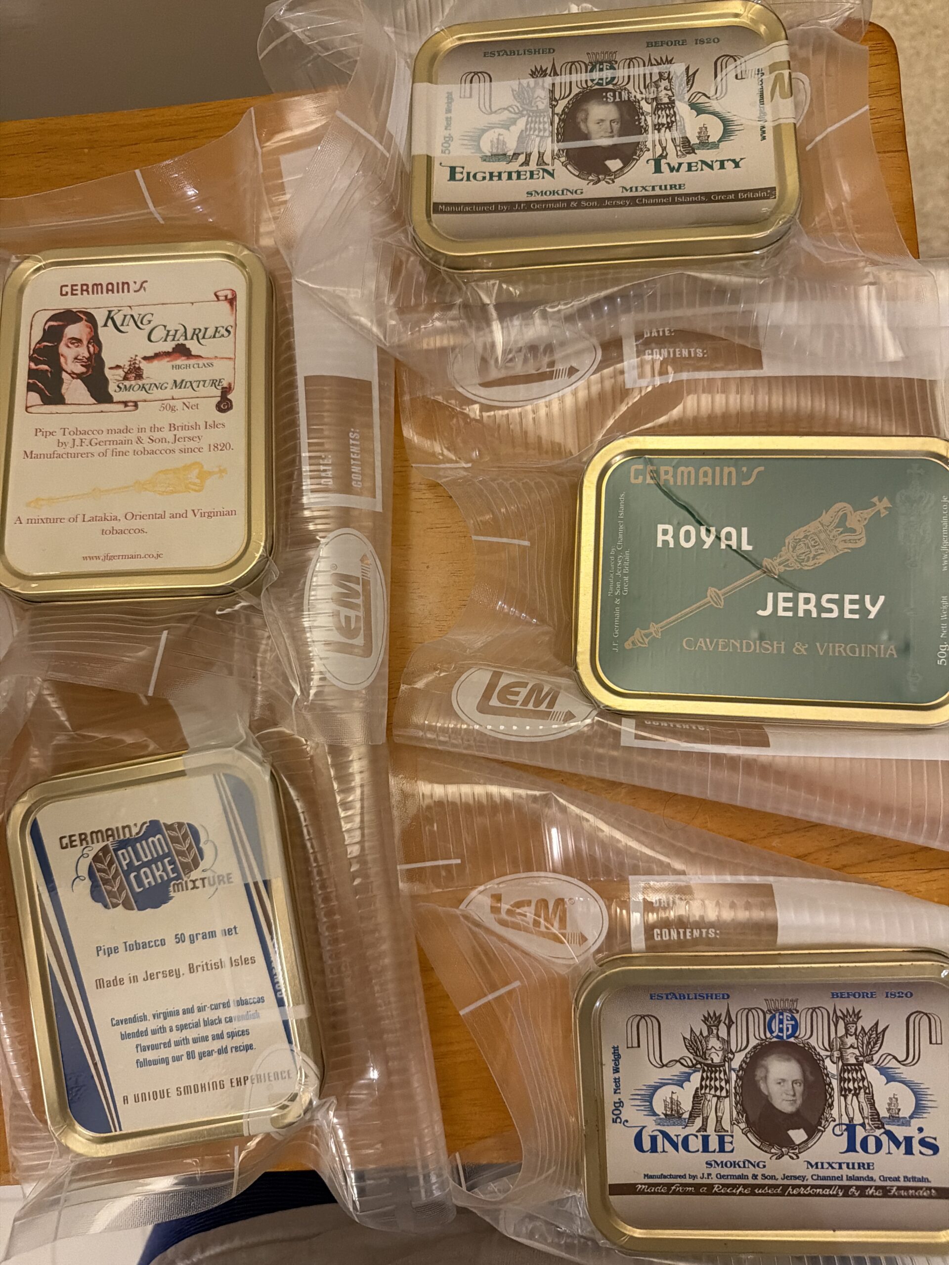 J. F. Germain & Son Smoking Mixture Pipe Tobacco, Uncle Tom’s, Eighteen Twenty, Royal Jersey, Plum Cake, King Charles
