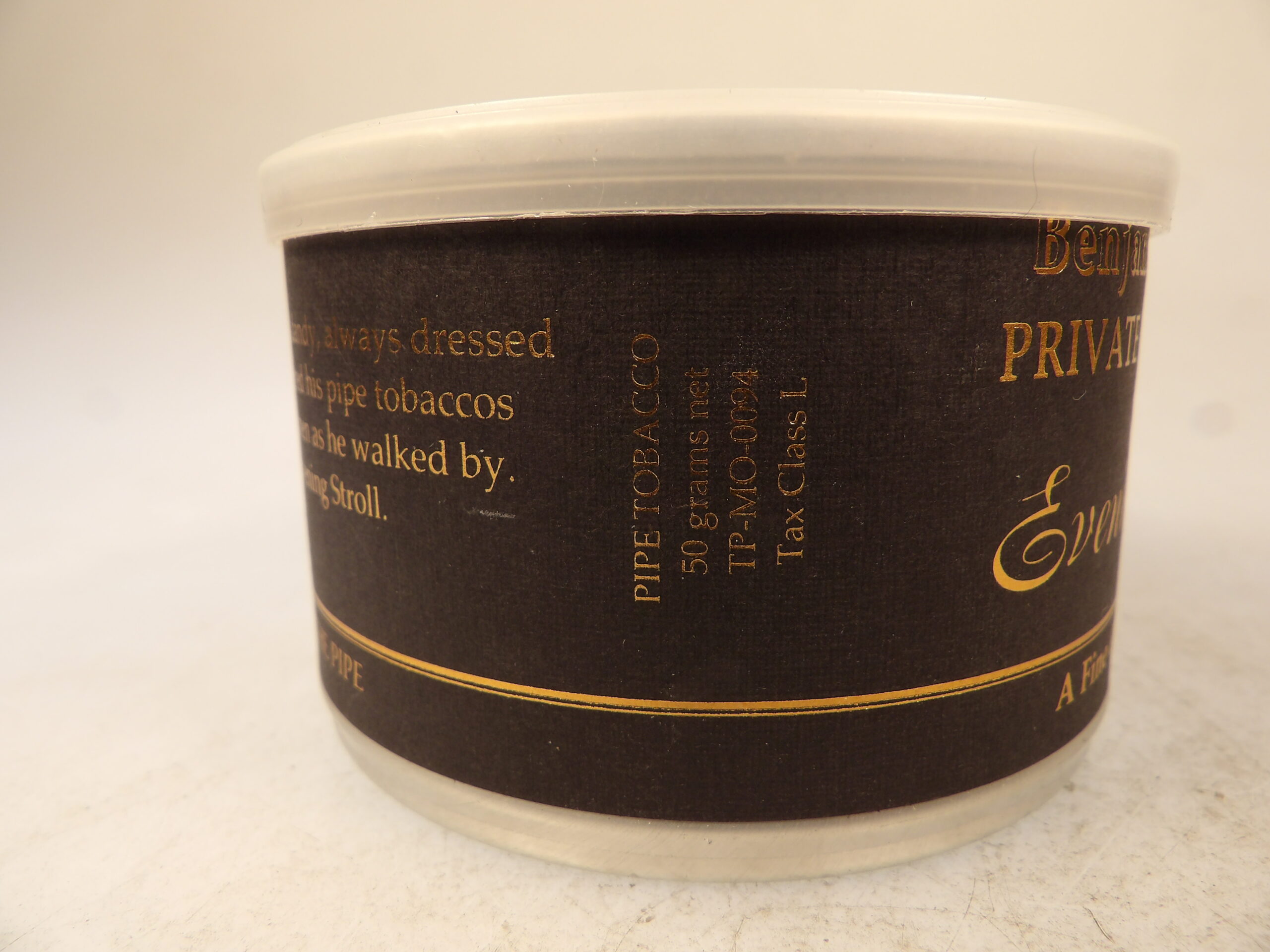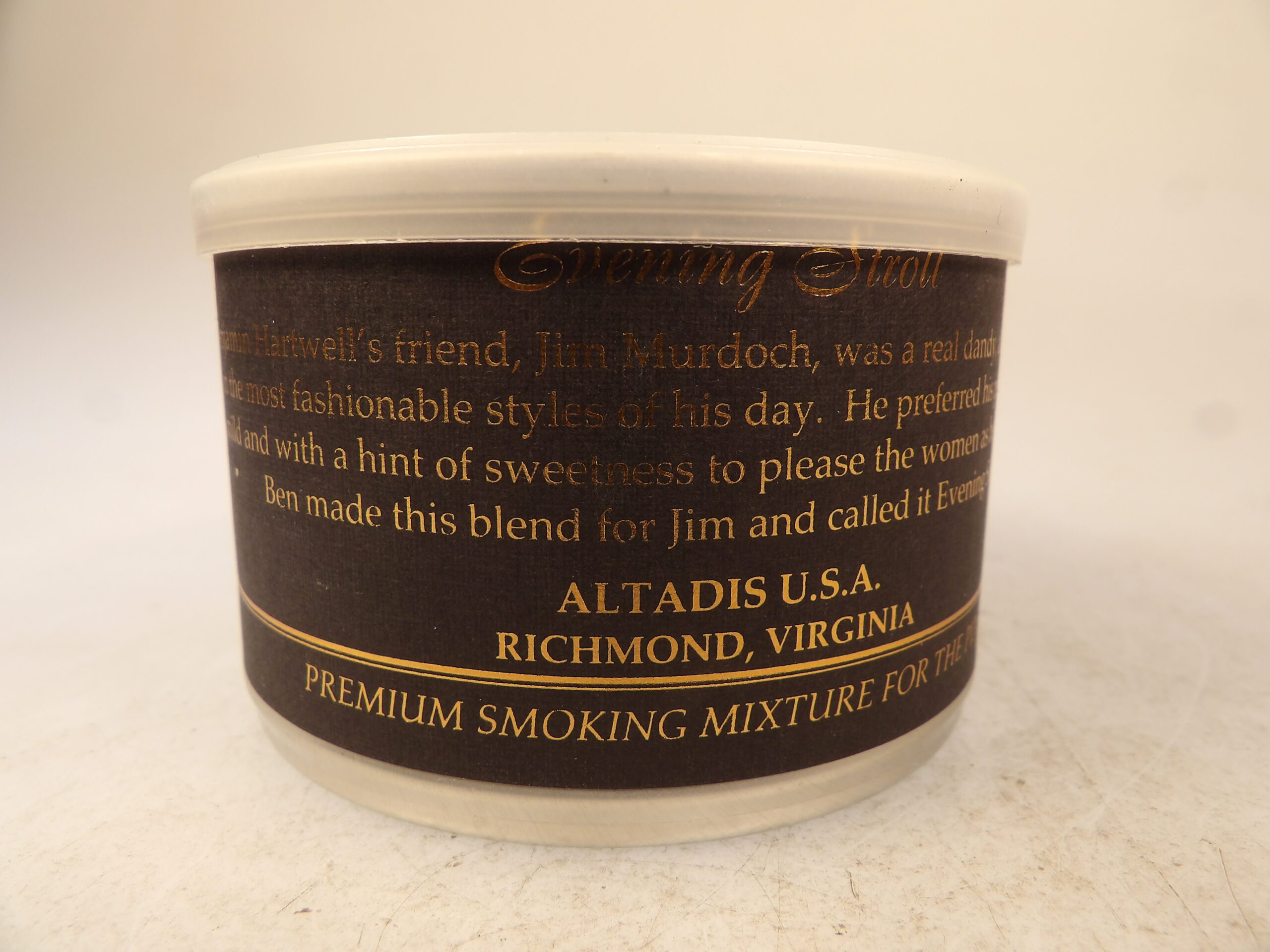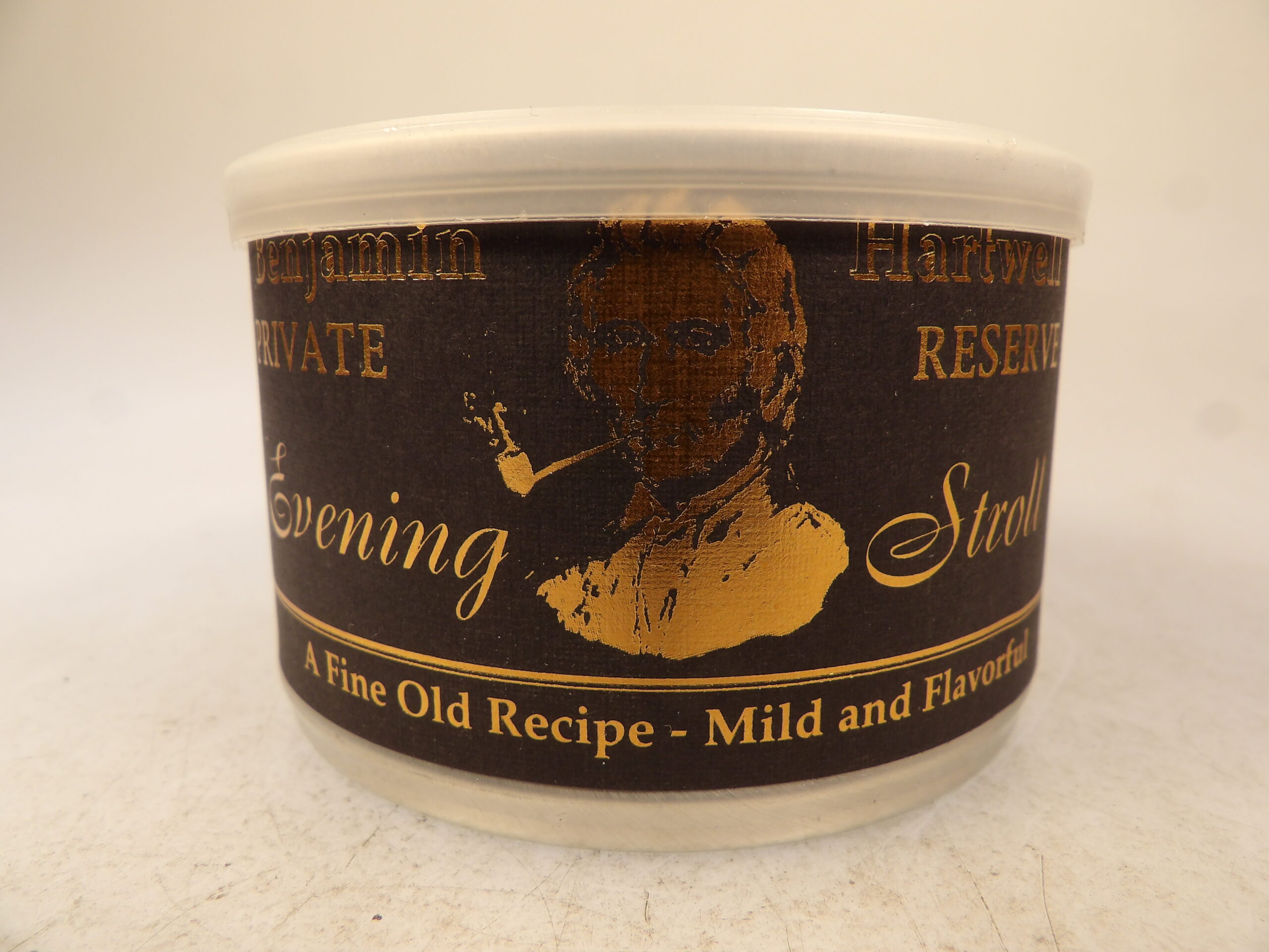 DESCRIPTION: Here is an auction for sale. It is a Vintage Collectible Benjamin Hartwell Evening Stroll 2 oz’s Pipe Tobacco Sealed Unopened Tin Made in USA. The Sealed Tin has never been opened from 2006. Mild Aromatic and flavorful Black Cavendish, Virginia Blend Benjamin Hartwell's friend, Jim Murdoch, was a real dandy, always dressed in the most fashionable styles of his day. He preferred his pipe tobaccos mild and with a hint of sweetness to please the women as he walked by. Ben made his blend for Jim and called it Evening Stroll. Good Luck Bidding and Thanks for Stopping by.
