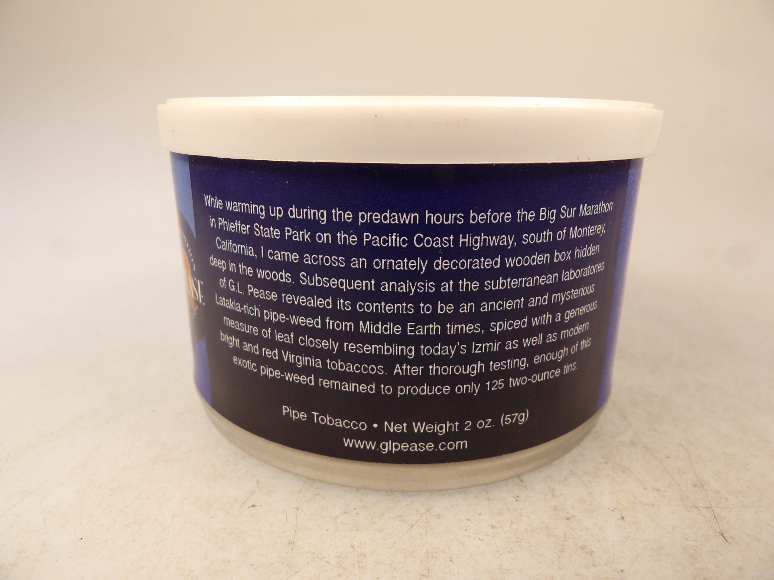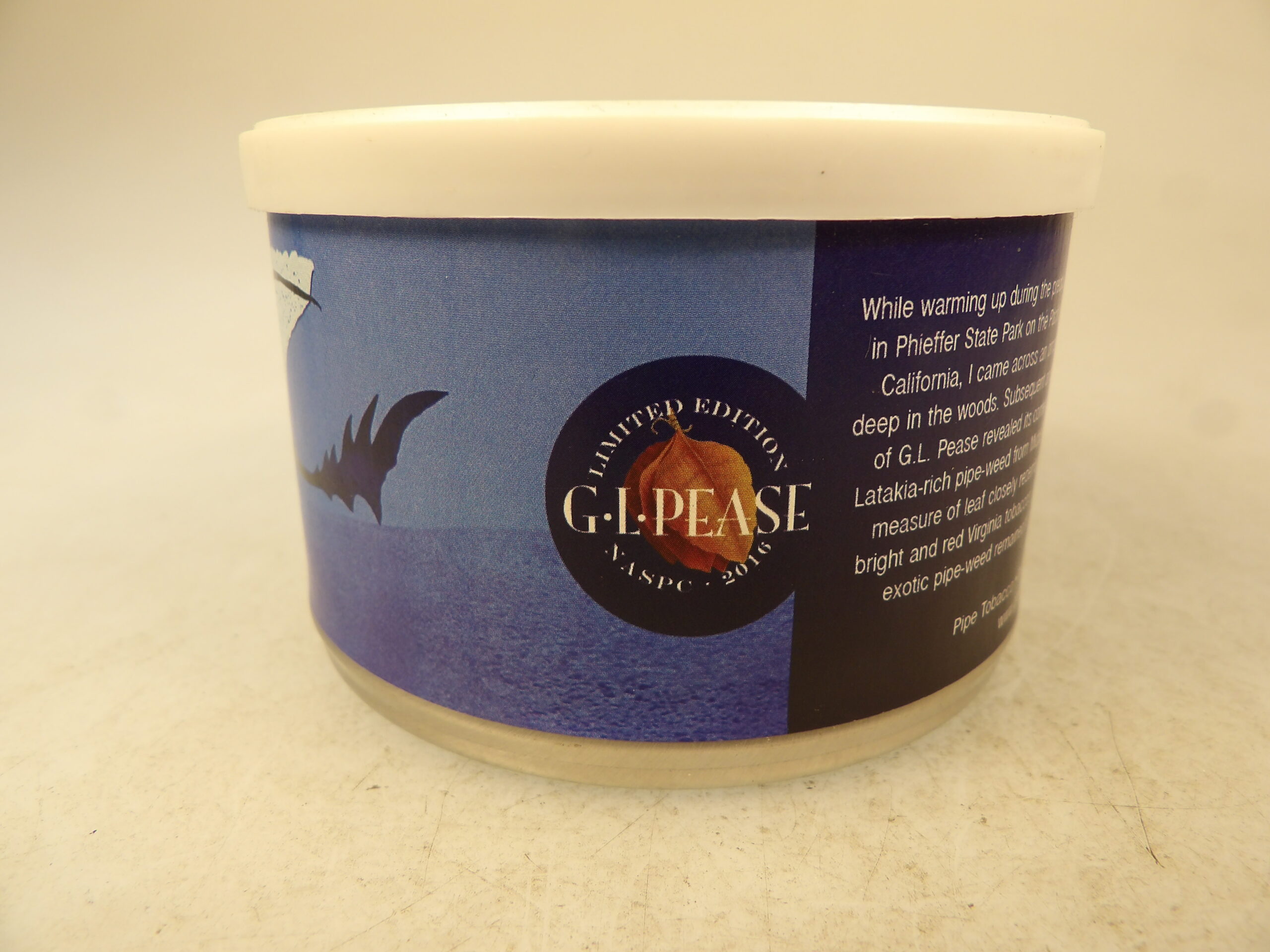 DESCRIPTION: Here is an auction for sale. It is a Vintage Collectible 16 Years Old G.L. Pease NASPC Night Wrath Blend 2 oz’s Sealed Pipe Tobacco Tin Annual 2016 Show. This tin is sealed and has never been opened. This tin is a limited blend tin produced for this year only during the NASPC 2016 annual show. While warming up during the predawn hours before the Big Sur Marathon in Pheiffer State Park on the Pacific Coast Highway, south of Monterey, California, I came across an ornately decorated wooden box hidden deep in the woods. Subsequent analysis at the subterranean laboratories of G.L. Pease revealed its contents to be an ancient and mysterious latakia rich pipe weed from Middle Earth times, spiced with a generous measure of leaf closely resembling today's Izmir as well as modern bright and red Virginia tobaccos. After thorough testing, enough of this exotic pipe weed remained to produce only 125 two-ounce tins. Notes: 2016 NASPC Show Limited Edition. Good Luck Bidding and Thanks for Stopping by.