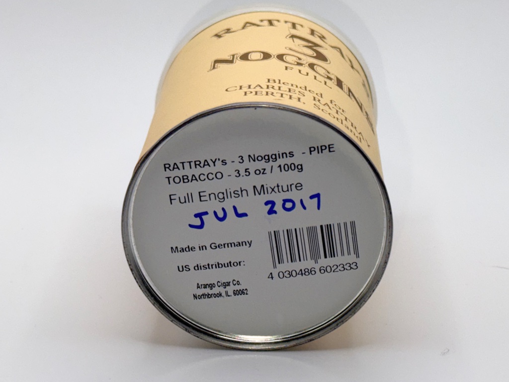 One unopened tin of Rattray's 3 Noggins from my private collection. Was purchased new by me in 2017 and cellared in the dark at a near constant 68 degrees ever since.