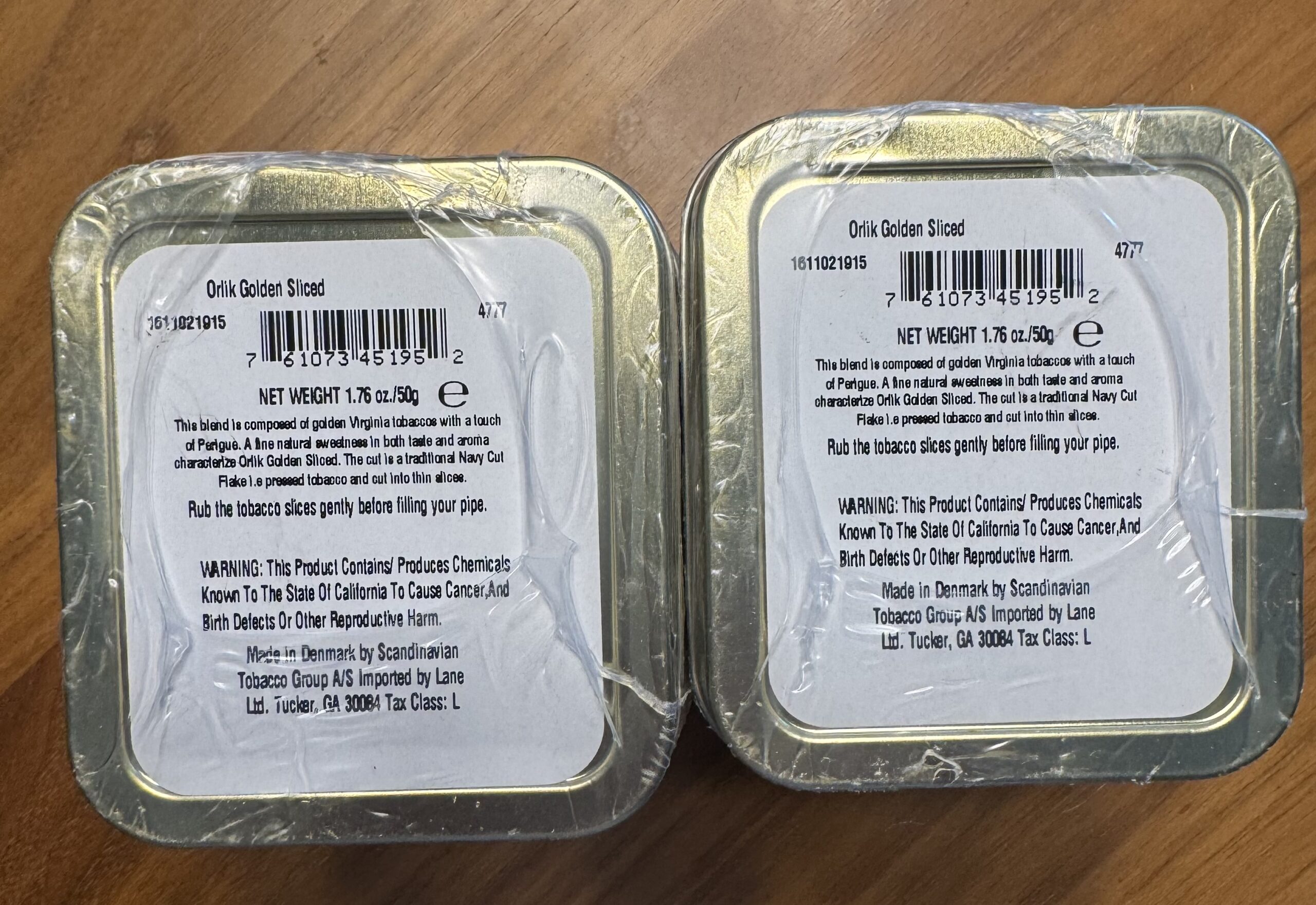 Ten 50g tins Orlik Golden Sliced. Sealed and wrapped 2016
