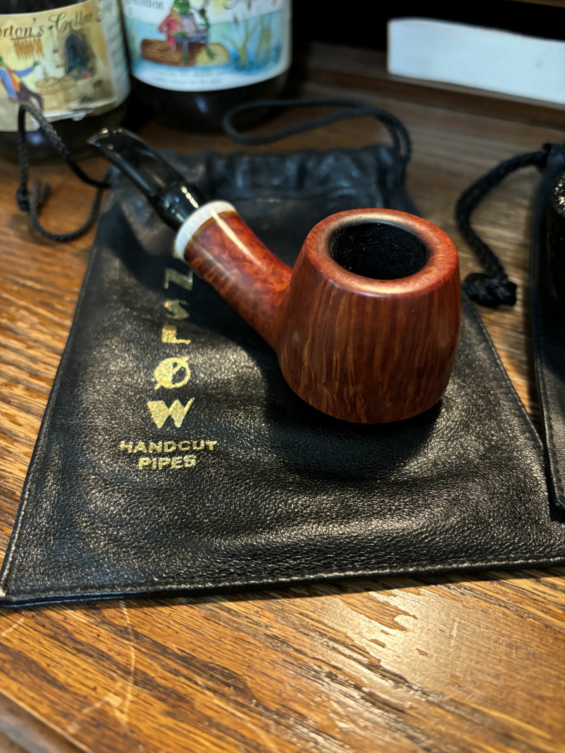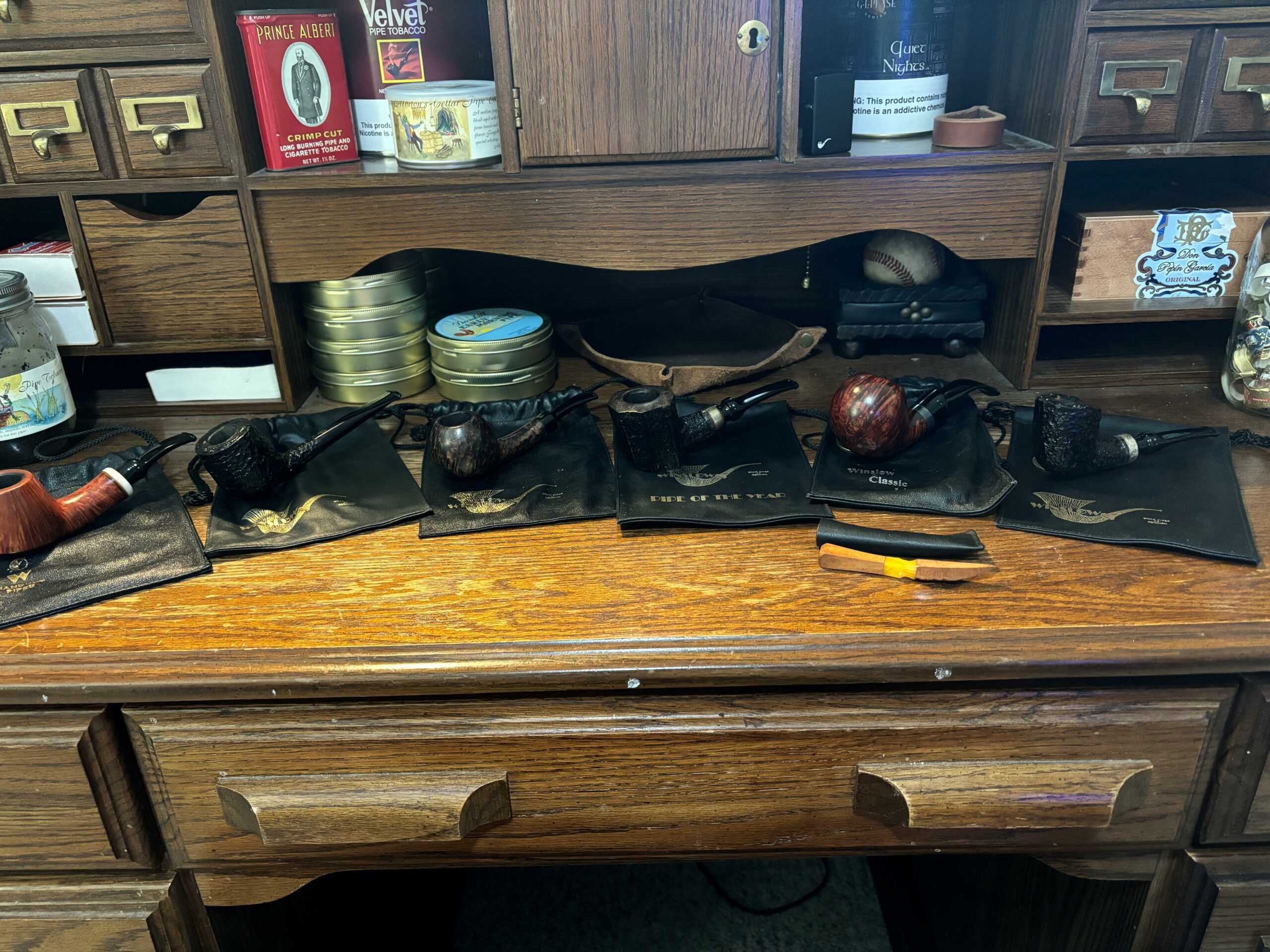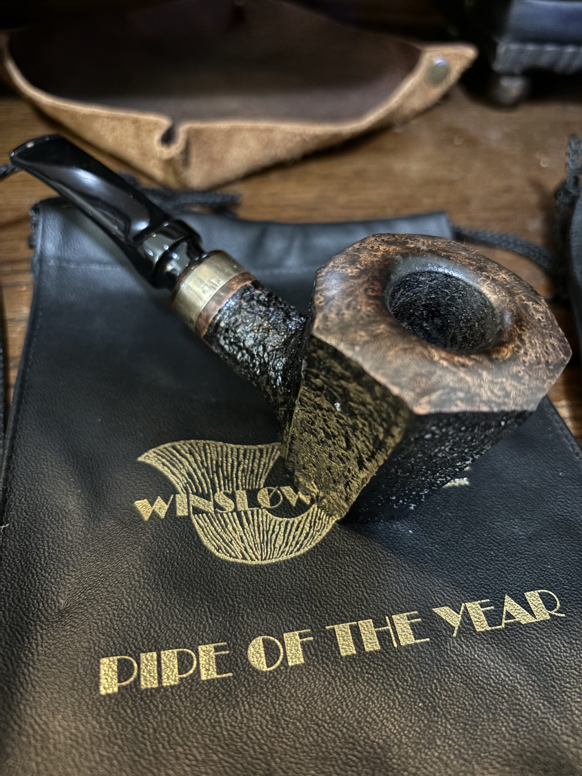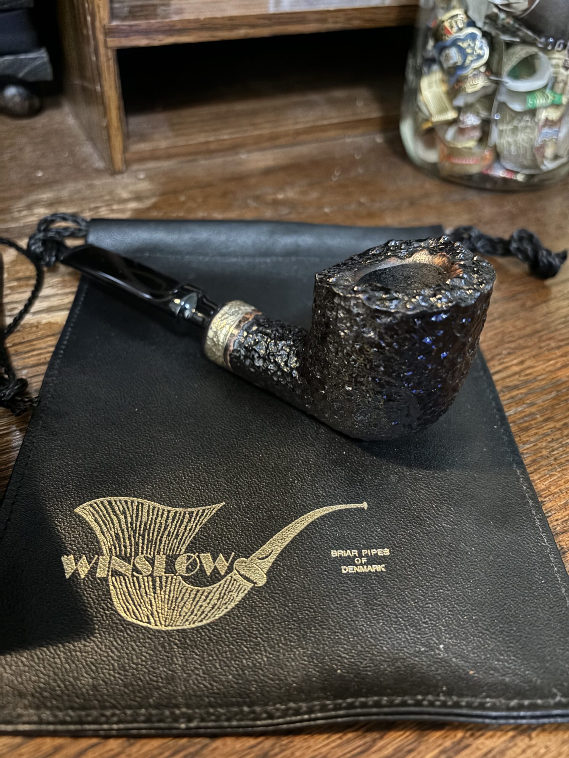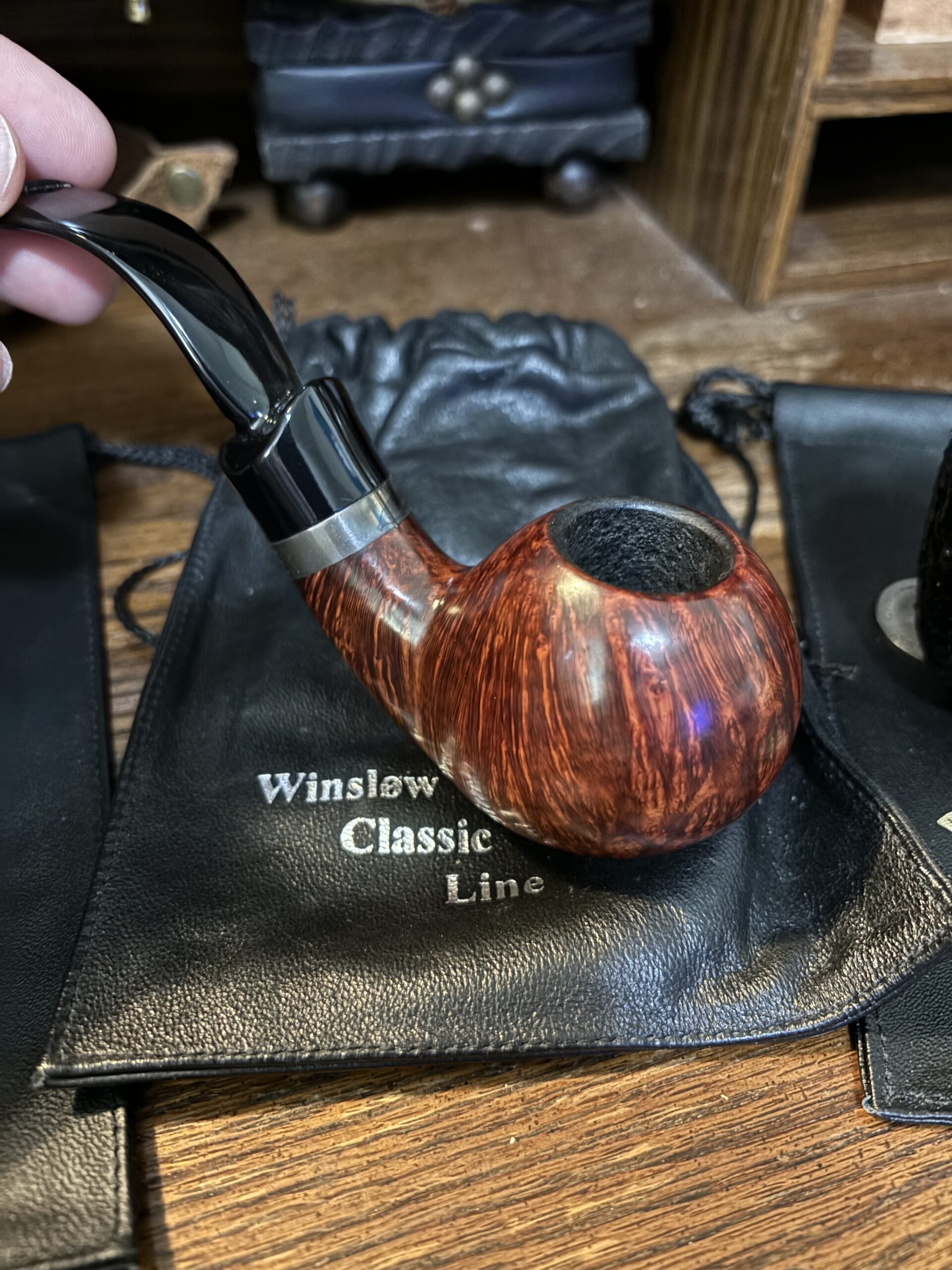Four pipes made by Poul Winslow: 2019 Pipe of the Year w/Silver (50th Aniv.) limited edition (040); Smooth Bent Pot (B), Rusticated Bent Dublin w/Silver (D), and Smooth Bent Apple w/Silver (B). Also, includes Winslow Leather Pipe Pouch for each pipe and one handmade Winslow Tamper.