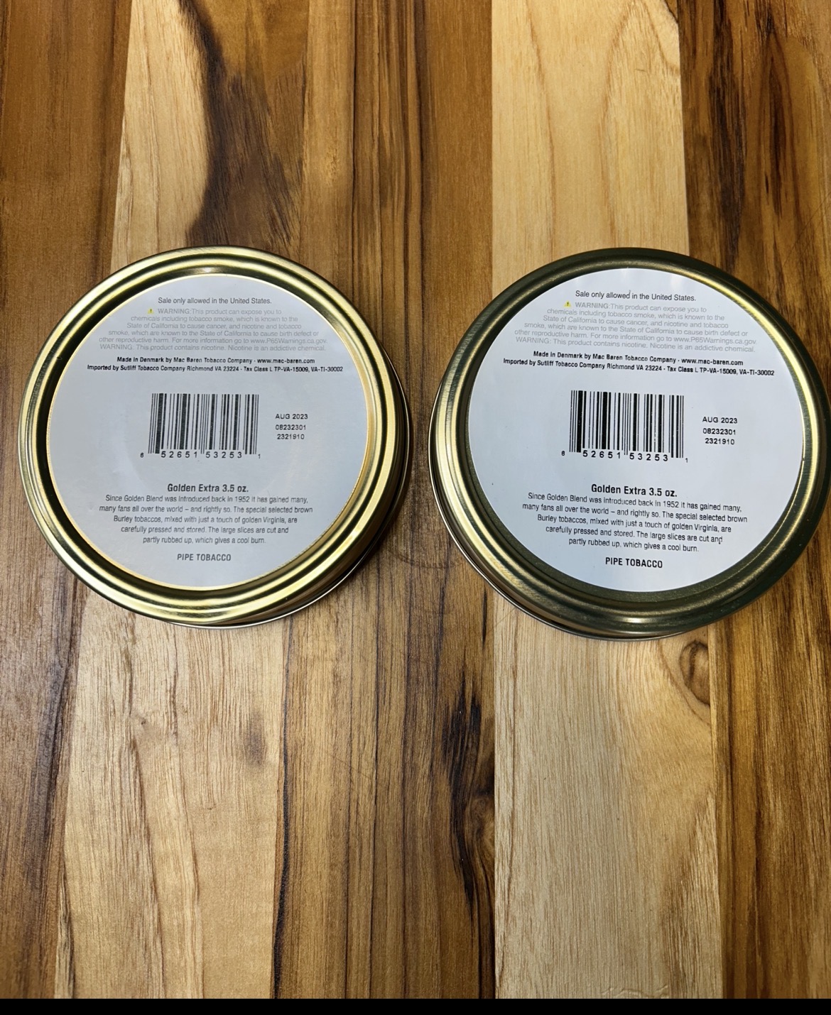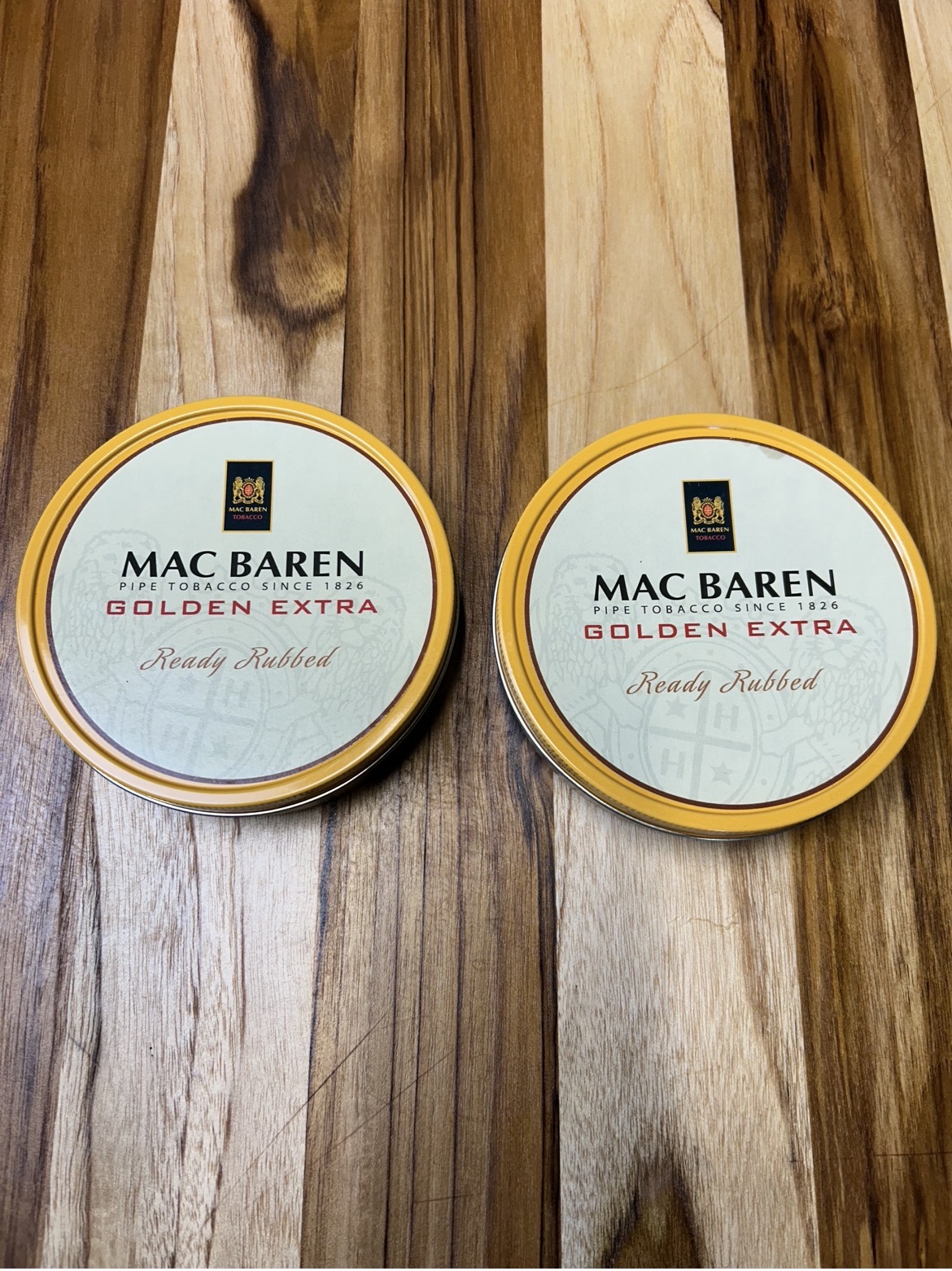 Two big 3.5 sealed tins of Mac Barens Golden Extra Ready Rubbed