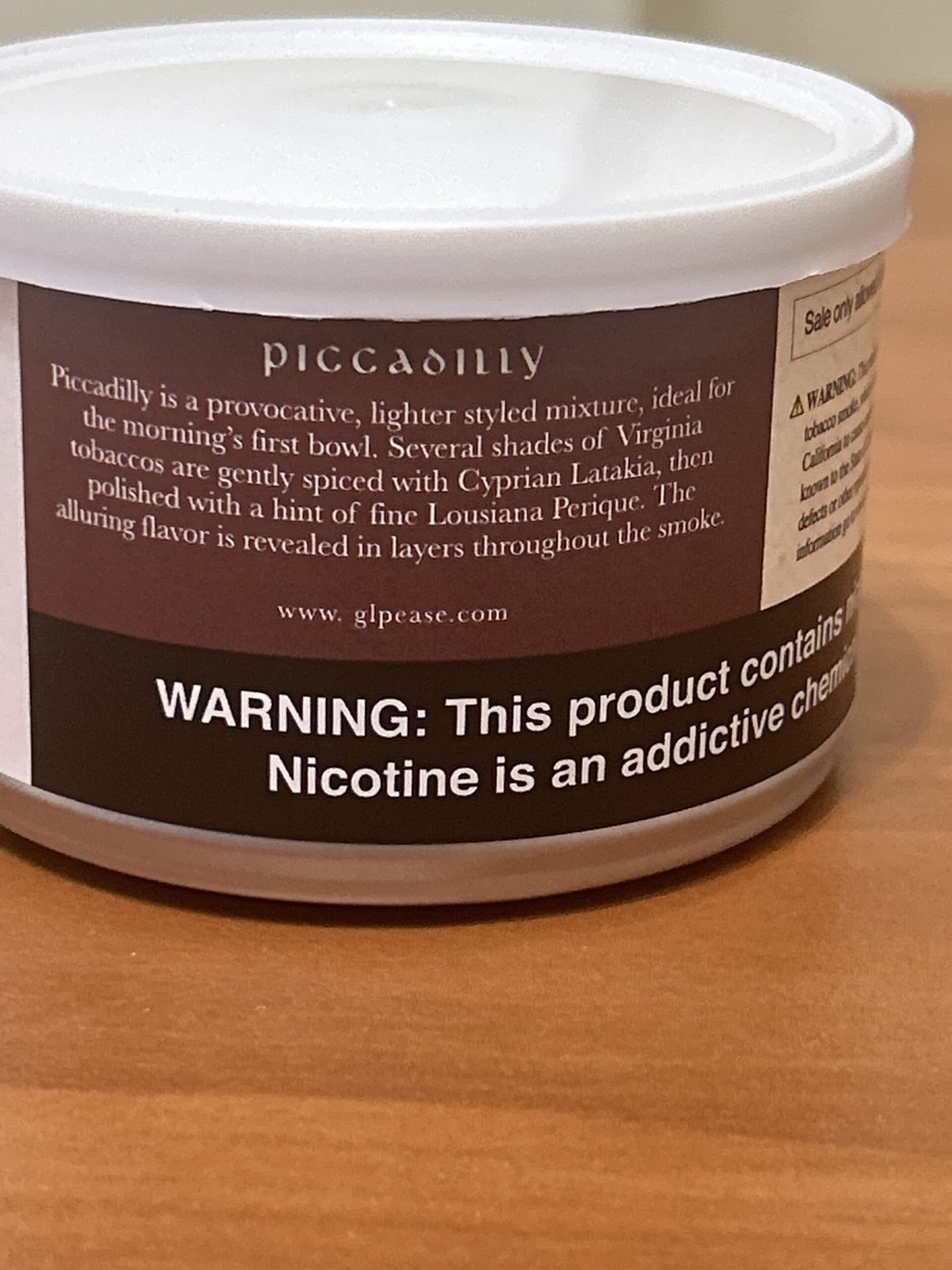 Piccadilly by G.L. Pease (dated 2020), 50 gr sealed bulging tin. Has been stored in a temperature and humidity controlled environment. 3 day no reserve auction.