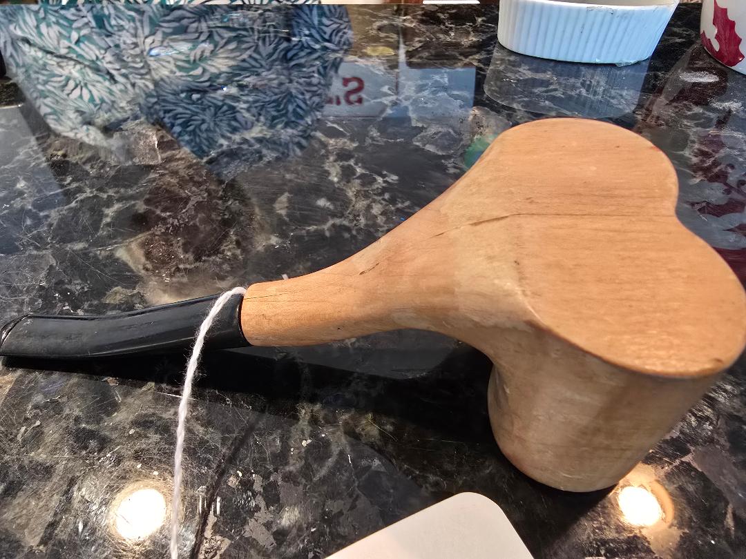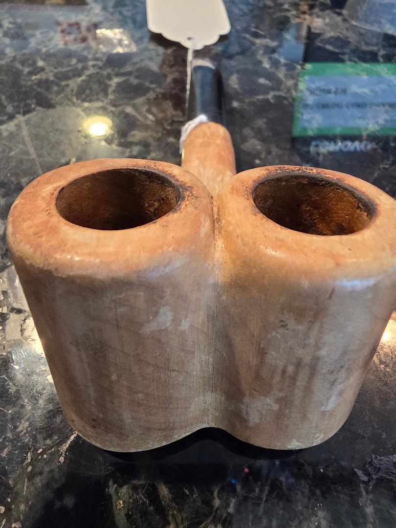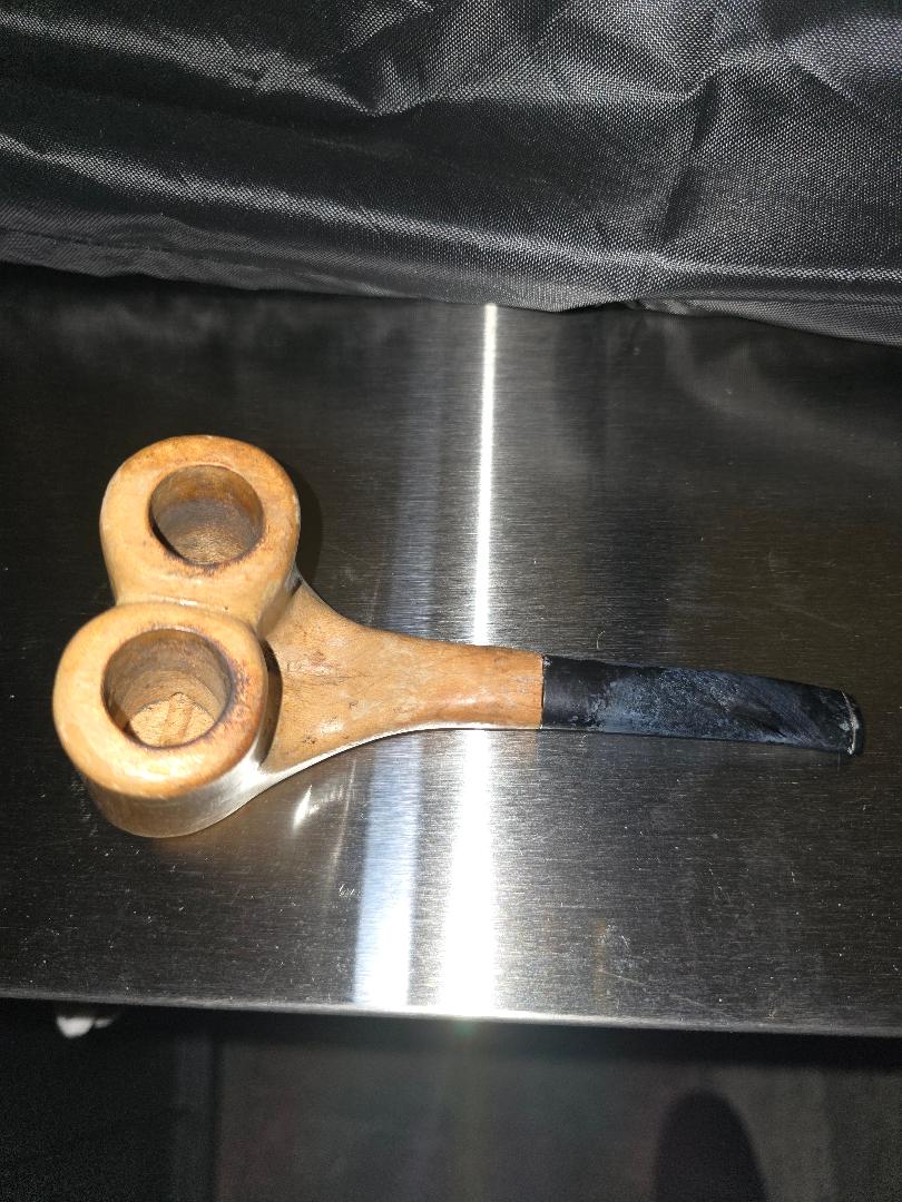Have you ever seen one ? I have not ! Very rare double bowl pipe. Absolutely cool and great for the pipe display or shelf. I don’t know much about it, came from an estate sale lot. Here’s what I can tell you, it has a good repair where the stem inserts into the bowls, it’s super cool looking and seems to be made well. I don’t know how it would smoke as I have not tried it .
