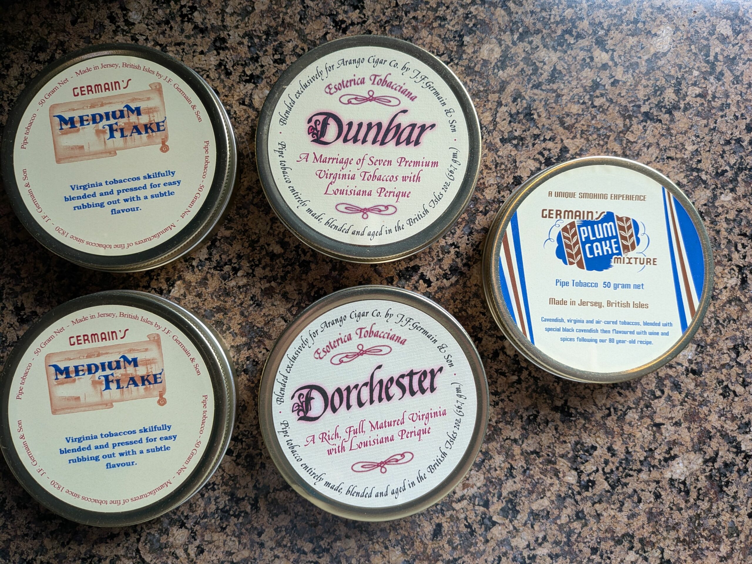 Germain's Plum Cake with code 1362H043 indicates a 2023 manufacture date. J.F. Germain & Son Plum Cake Mixture is a high-quality, traditional British tobacco featuring Virginia, Cavendish, and a subtle plum topping. It is generally described as a mild to medium "old aromatic" with a ribbon cut, notes of spiced wine and dark fruit, and very low tongue bite when smoked slowly.