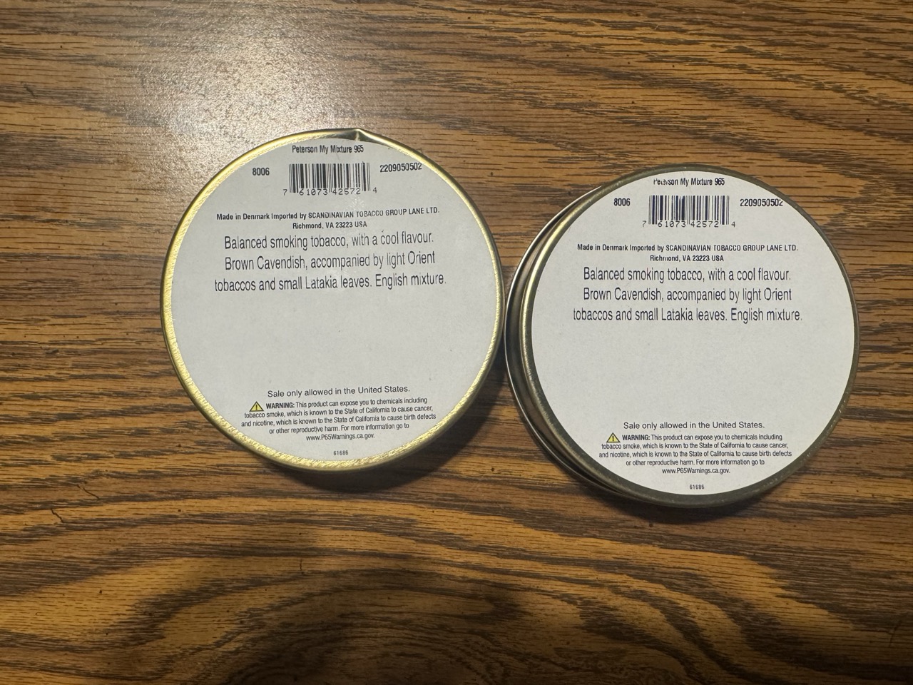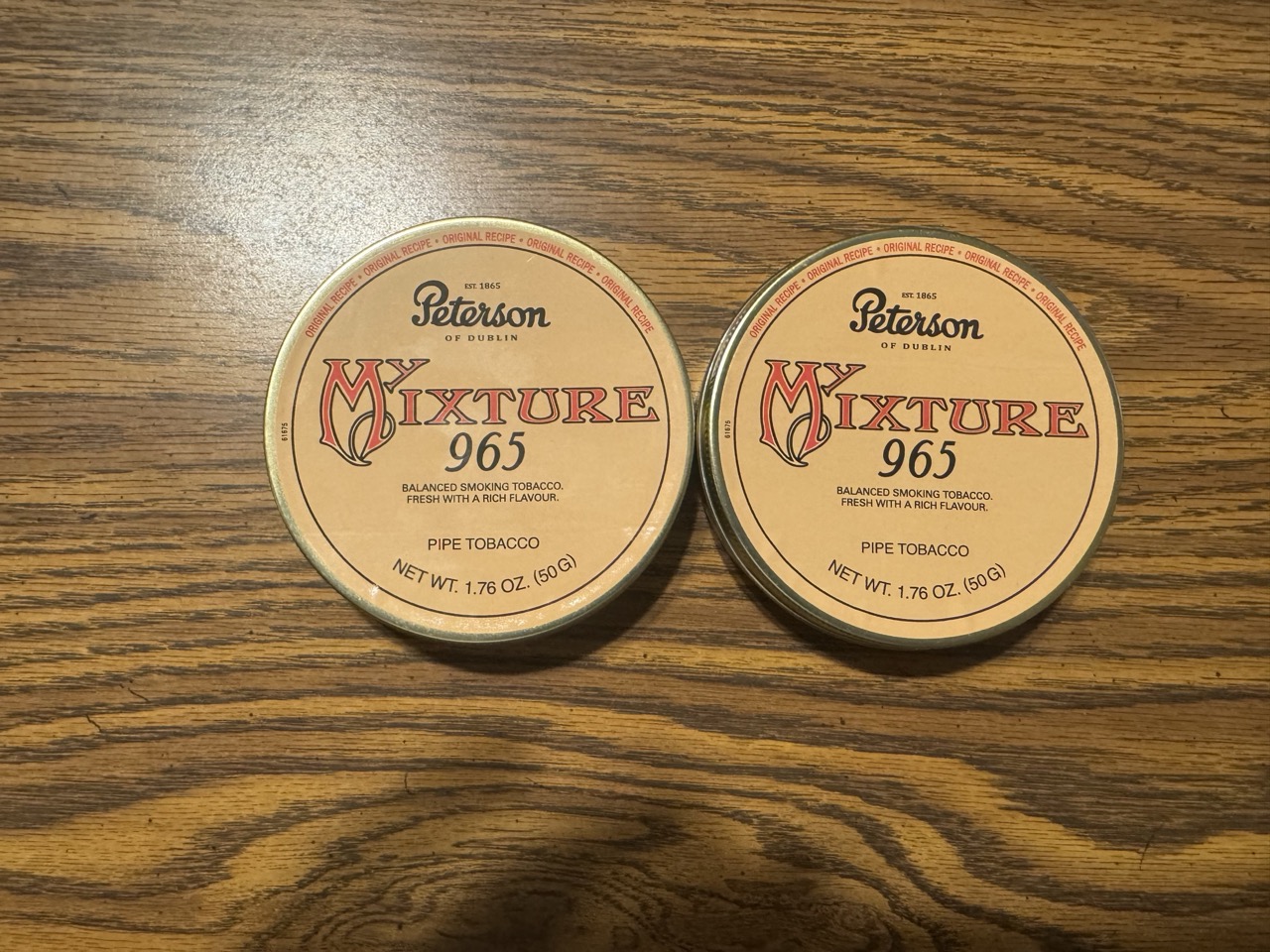 Of all of the Peterson tobaccos, My Mixture 965 is a true classic, even having been inducted into the Pipe Tobacco Hall of Fame. Great Virginias are blended with select Macedonian Orientals and a good amount of rich Latakia. What sets 965 apart is the addition of brown Cavendish, which deepens the blend and adds a subtle hint of mellow sweetness. One tin is dented but hasn’t but is still fully sealed. Lot of 2 tins.