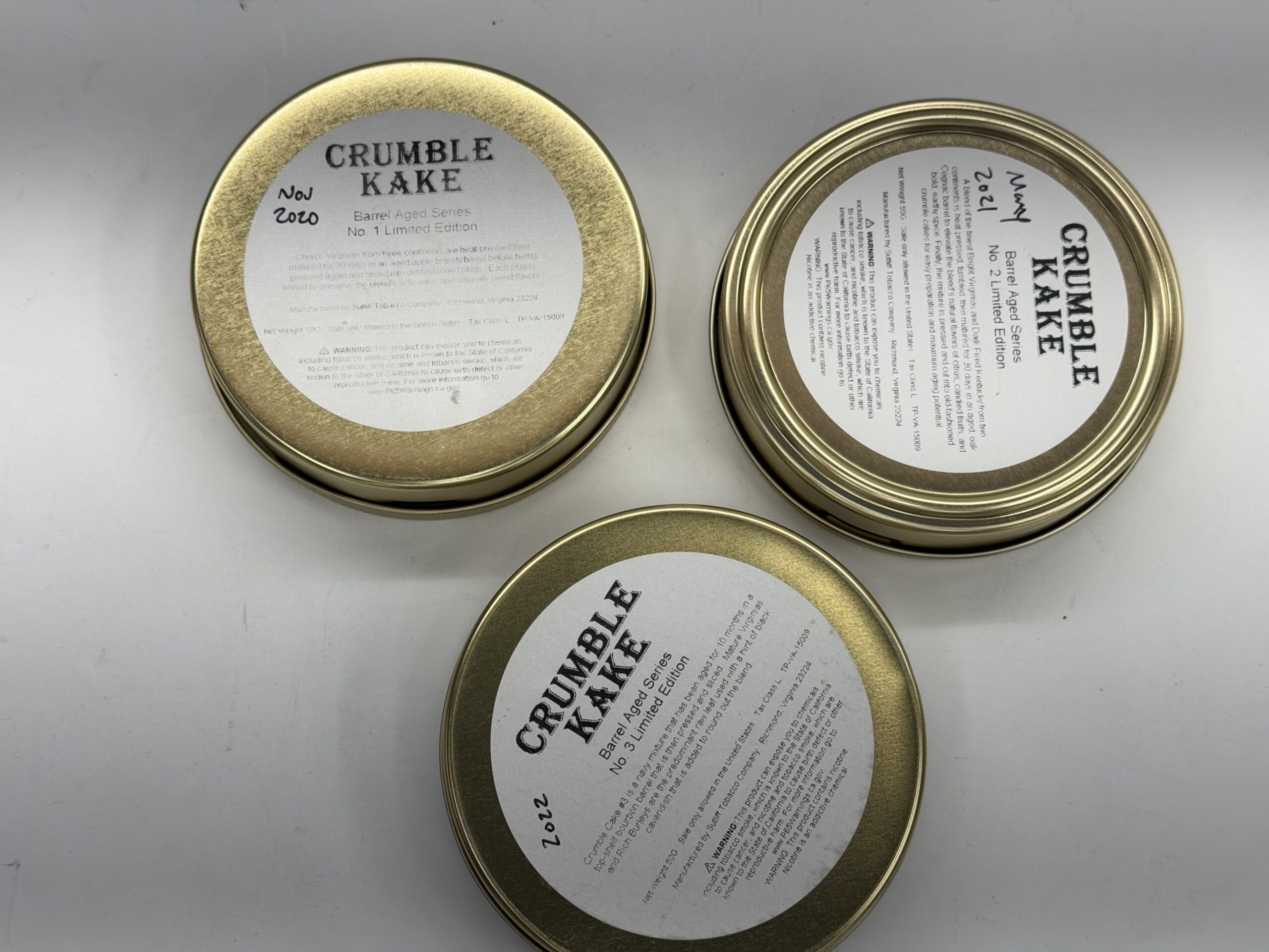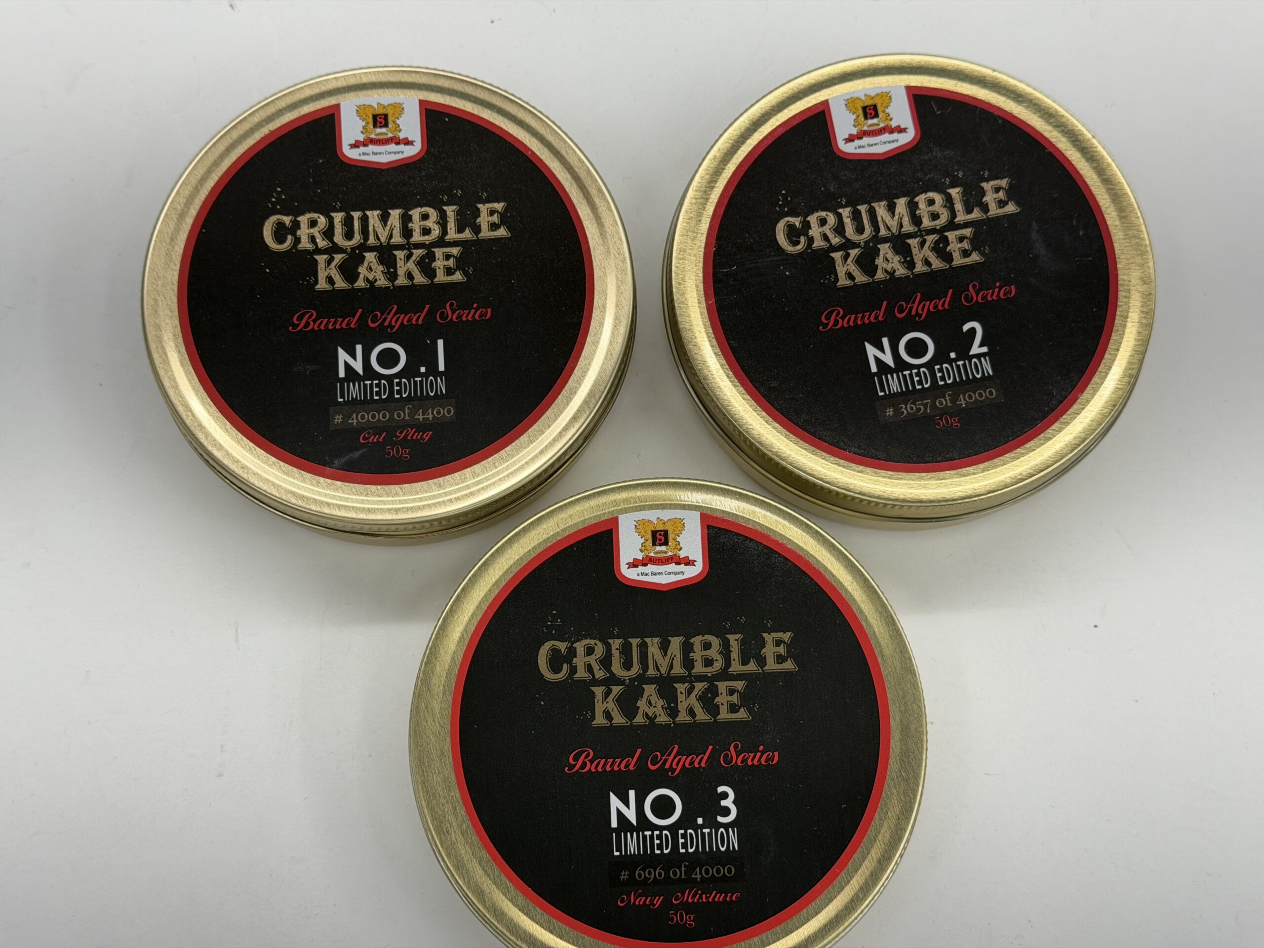 3x Tins of Sutliff Barrel Aged Series Limited Crumble Cake Numbers 1, 2 and 3 Limited Edition