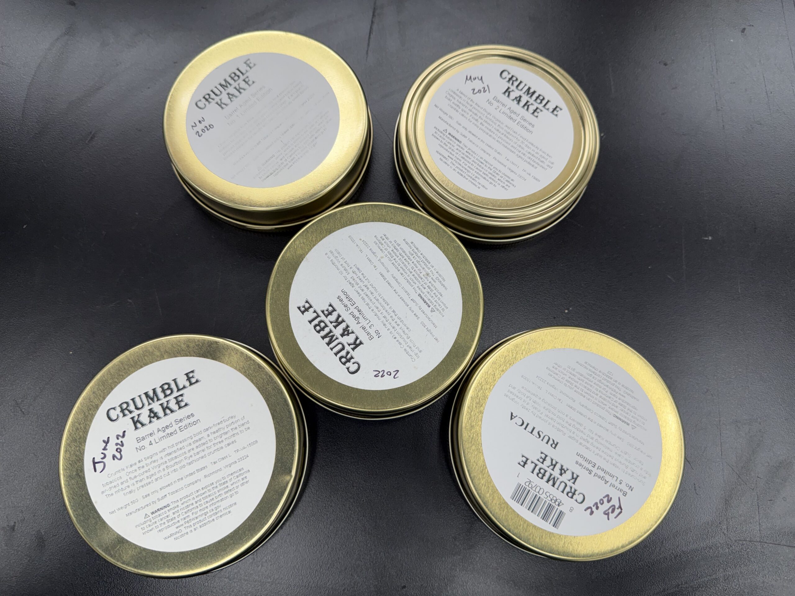 Listing Contains: 5x Tins of Sutliff Limited Barrel Aged Series, No's 1 thru 5, All 2020-22