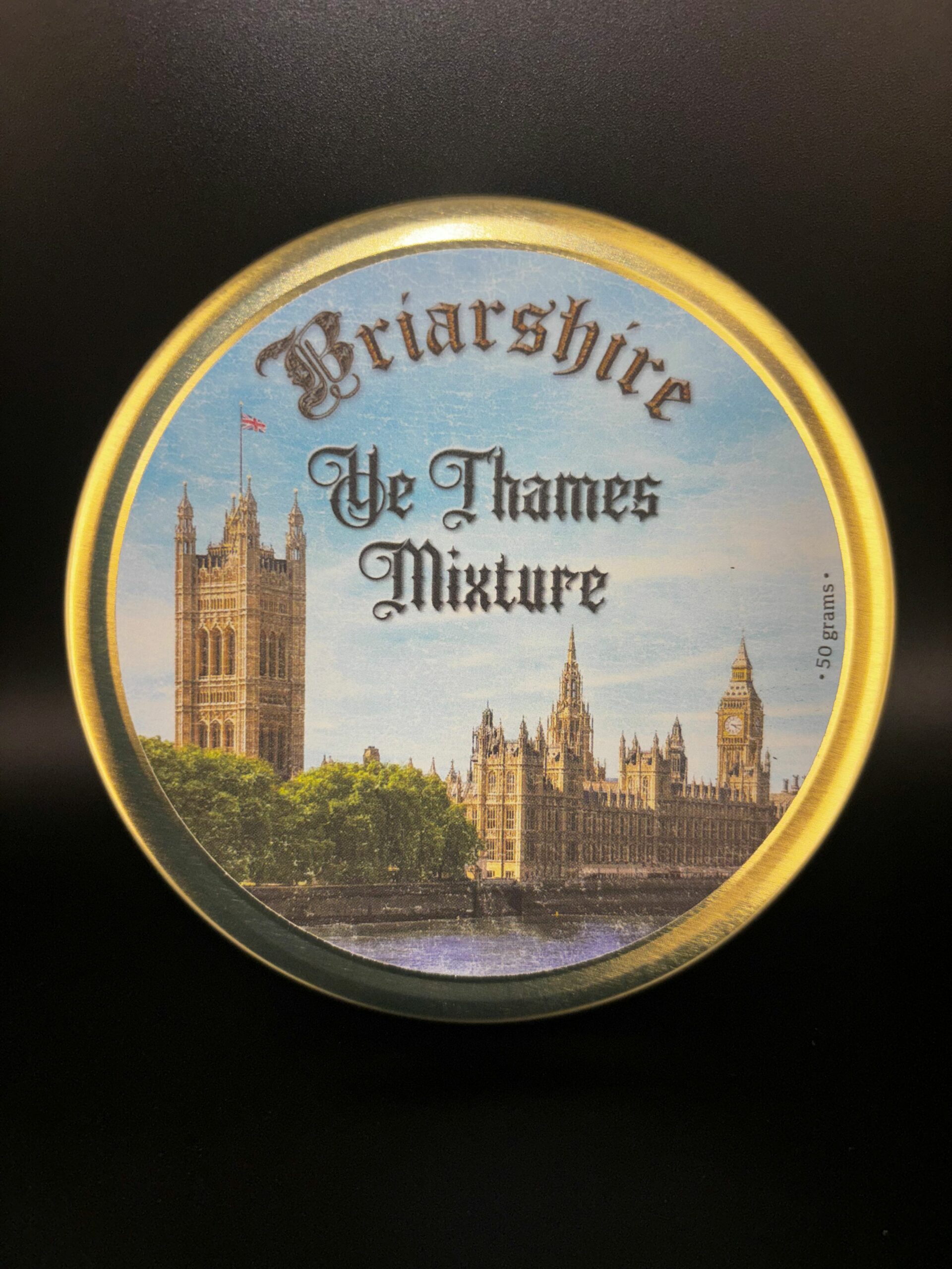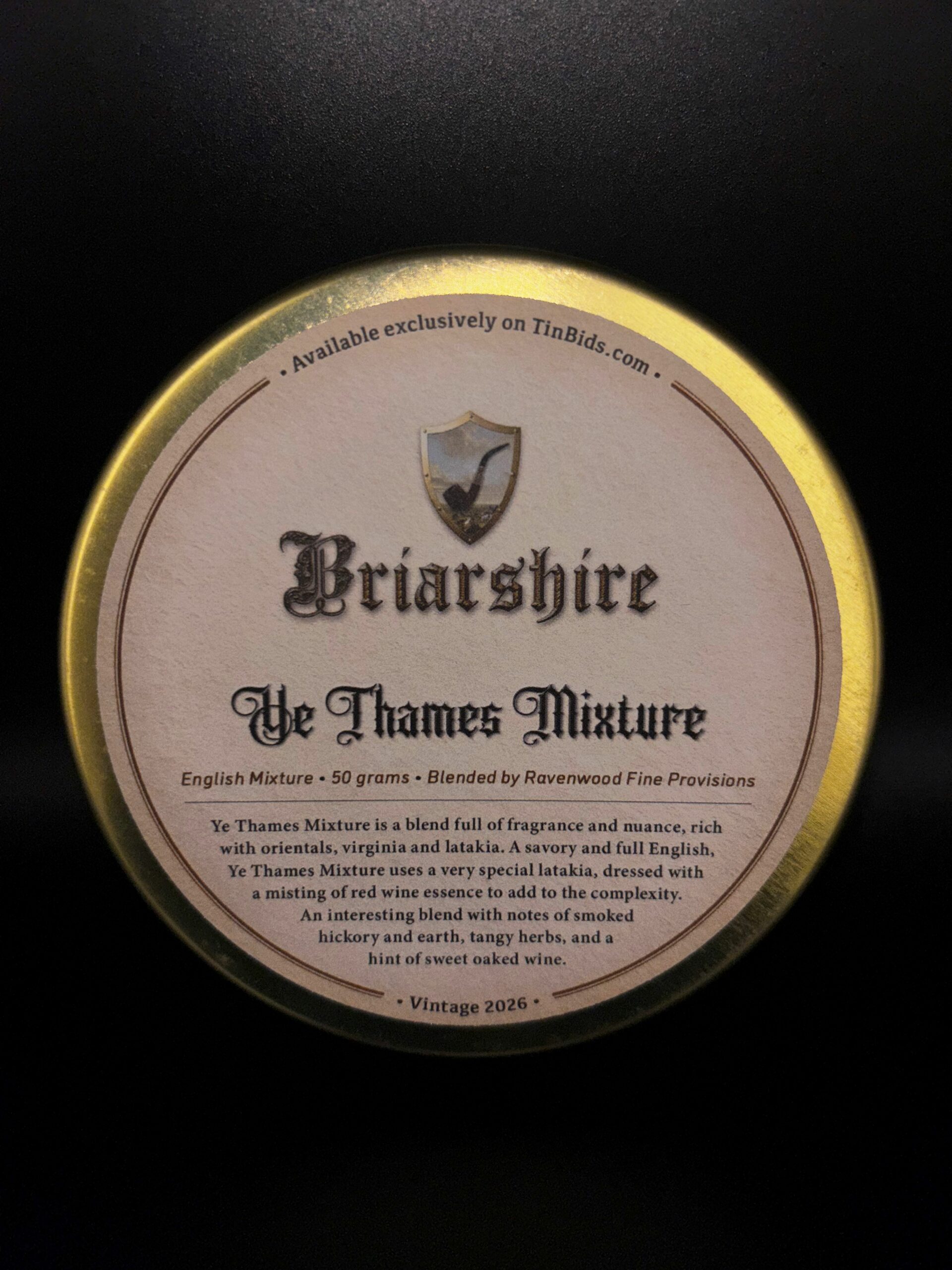 50g sealed tin of Briarshire's limited edition blend, Ye Thames Mixture blended by Ravenwood Fine Provisions. A blend full of fragrance and nuance, rich with orientals, Virginia and latakia. A savory and full English, Ye Thames Mixture uses a very special latakia, dressed with a misting of red wine essence to add to the complexity. An interesting blend with notes of smoked hickory and earth, tangy herbs, and a hint of sweet oaked wine. Available exclusively on TinBids.com and at The 2026 Chicago International Pipe Show.