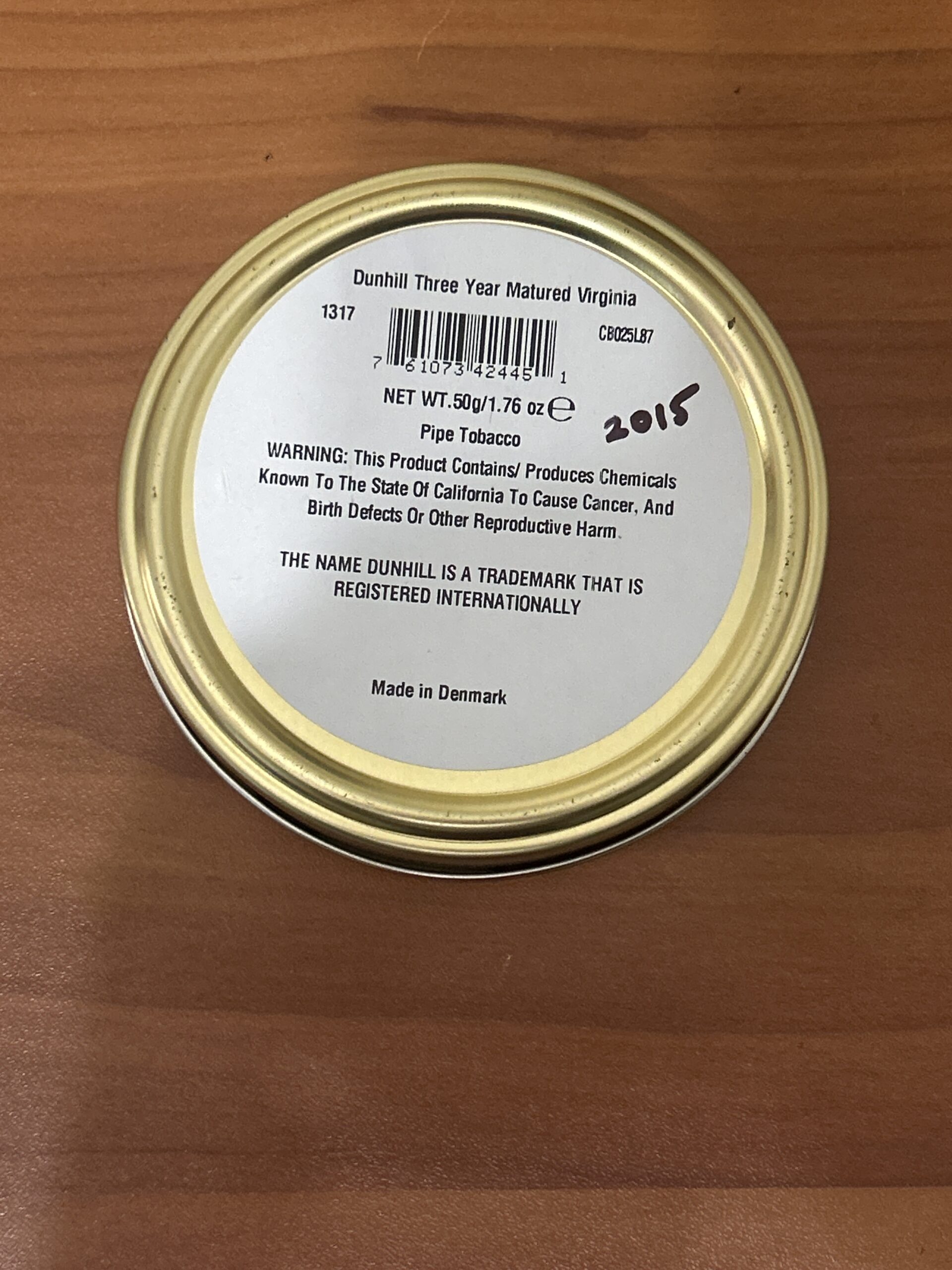 Dunhill, Three Year Matured Virginia, dated 2015, 50 gr sealed tin, has been stored in a temperature and humidity controlled environment, 3 day no reserve auction