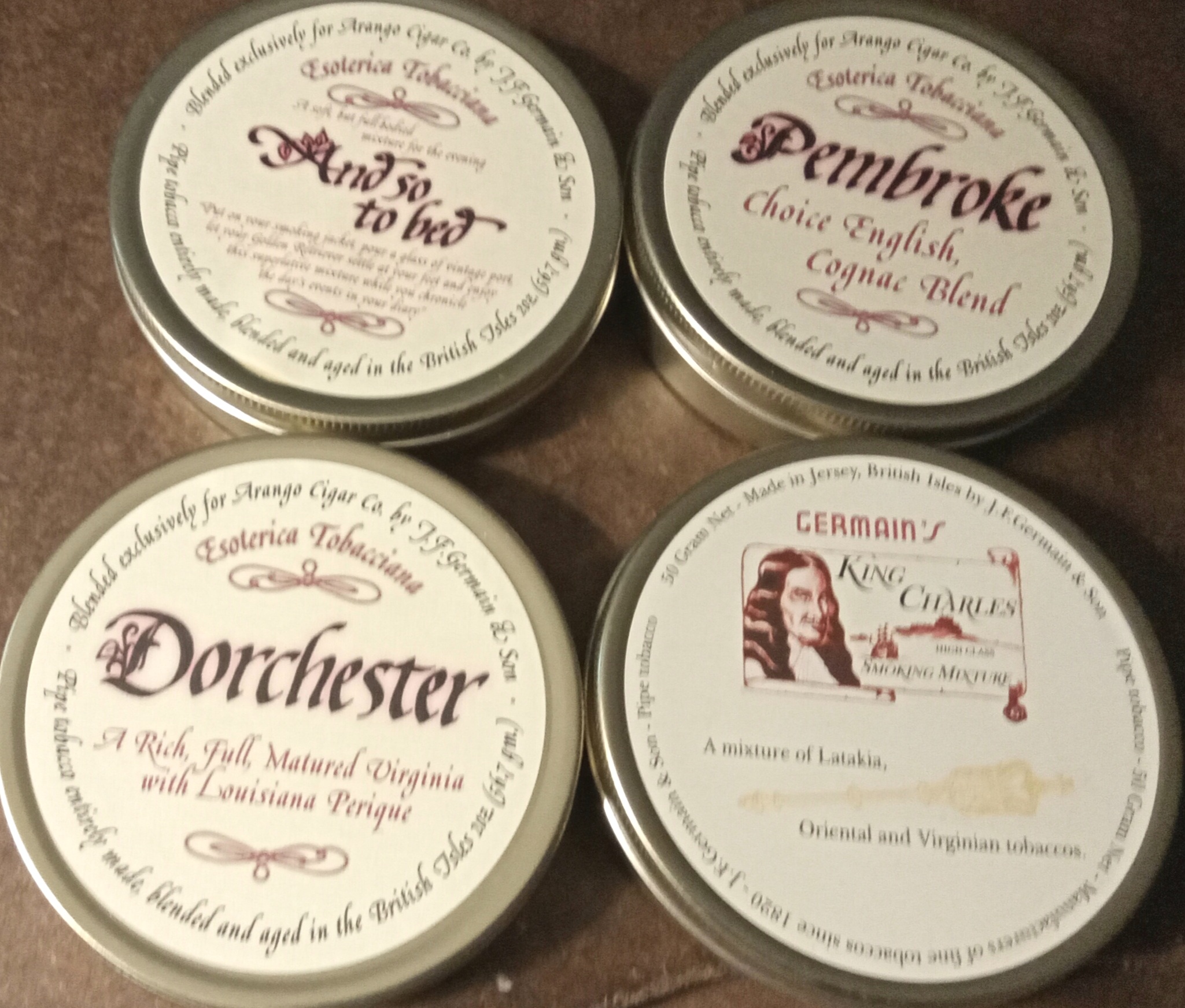 You are bidding on one tin each of Esoterica And So To Bed, Dorchester and Pembroke and one tin of Germain King Charles Smoking Mixture