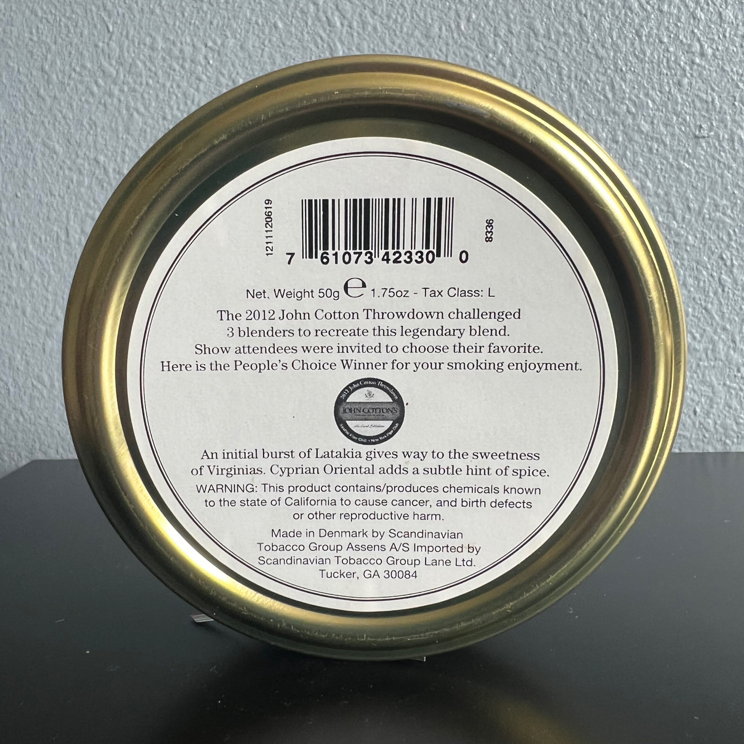 "The 2012 John Cotton Throwdown challenged 3 blenders to recreate this legendary blend. Show attendees were invited to choose their favorite. Here is the People's Choice Winner for your smoking enjoyment. "