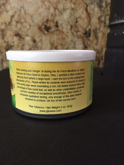 2oz tin of a blend produced by GL Pease exclusively for the 2016 NASPC Pipe and Tobacco Show. Solid seal. Slight bulging on top and bottom. Limited production of 125 tins. Imaginative description of the tobacco's discovery and analysis.