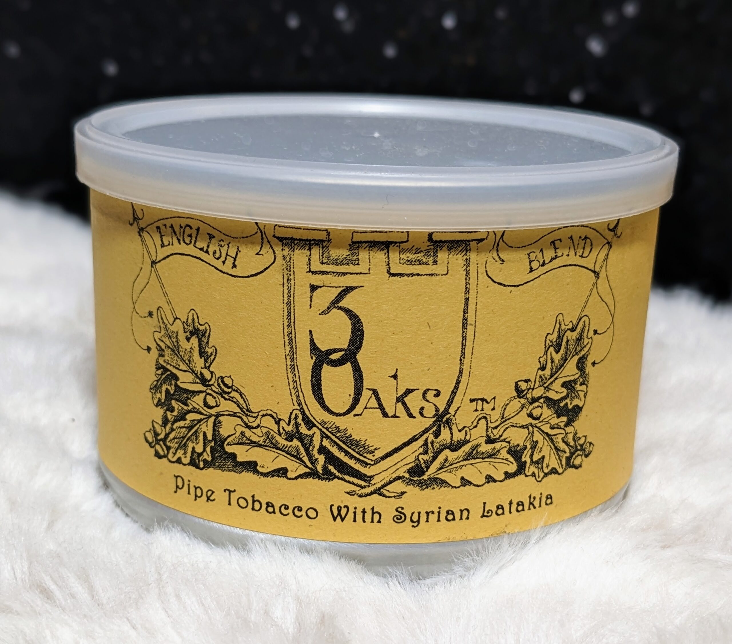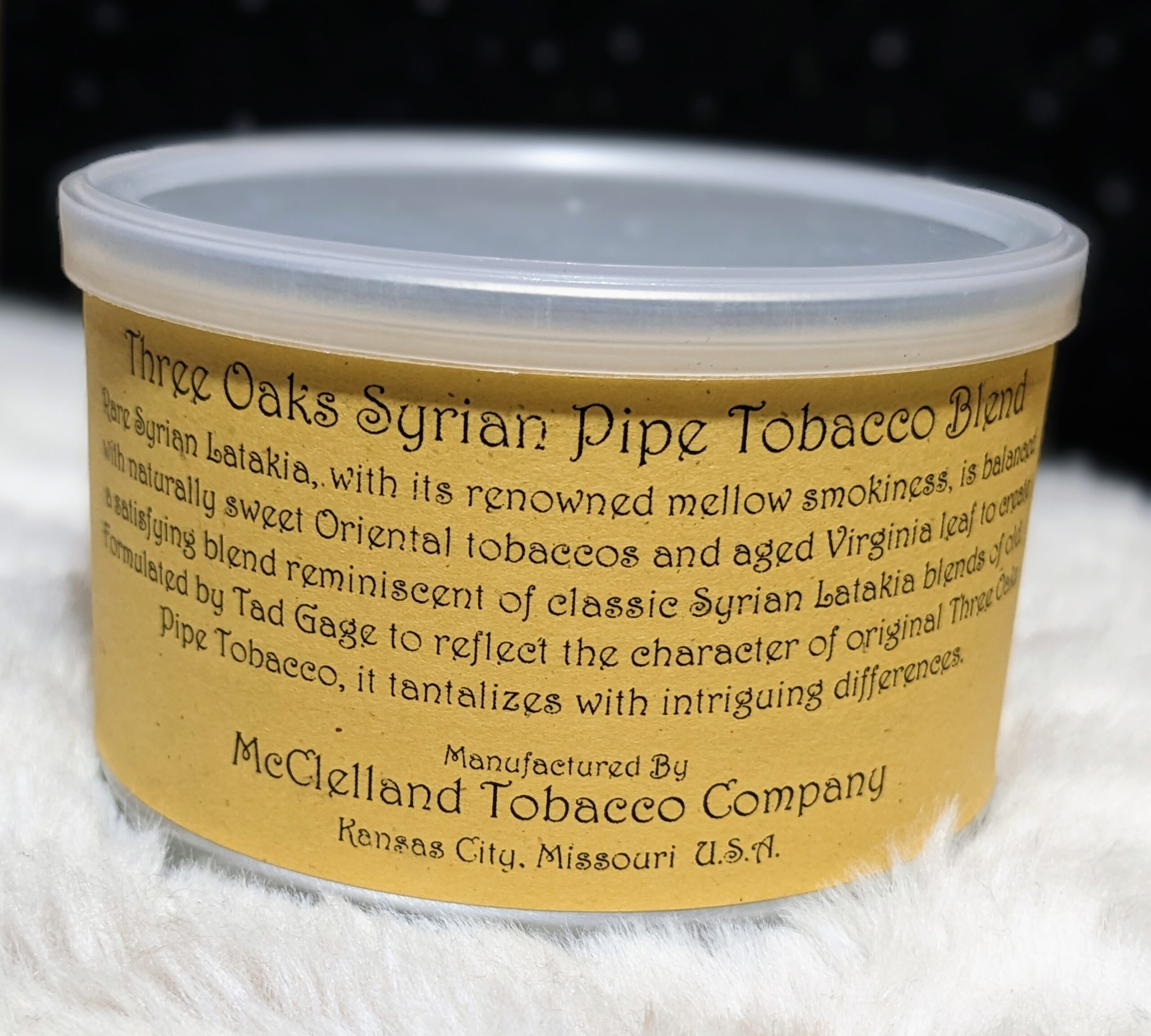 Rare Syrian latakia, with its renowned mellow smokiness, is balanced with naturally sweet Orientals and aged Virginia leaf to create a satisfying blend reminiscent of classic Syrian latakia blends of old. Formulated by Tad Gage to reflect the character of original Three Oaks Pipe Tobacco, it tantalizes with intriguing differences.