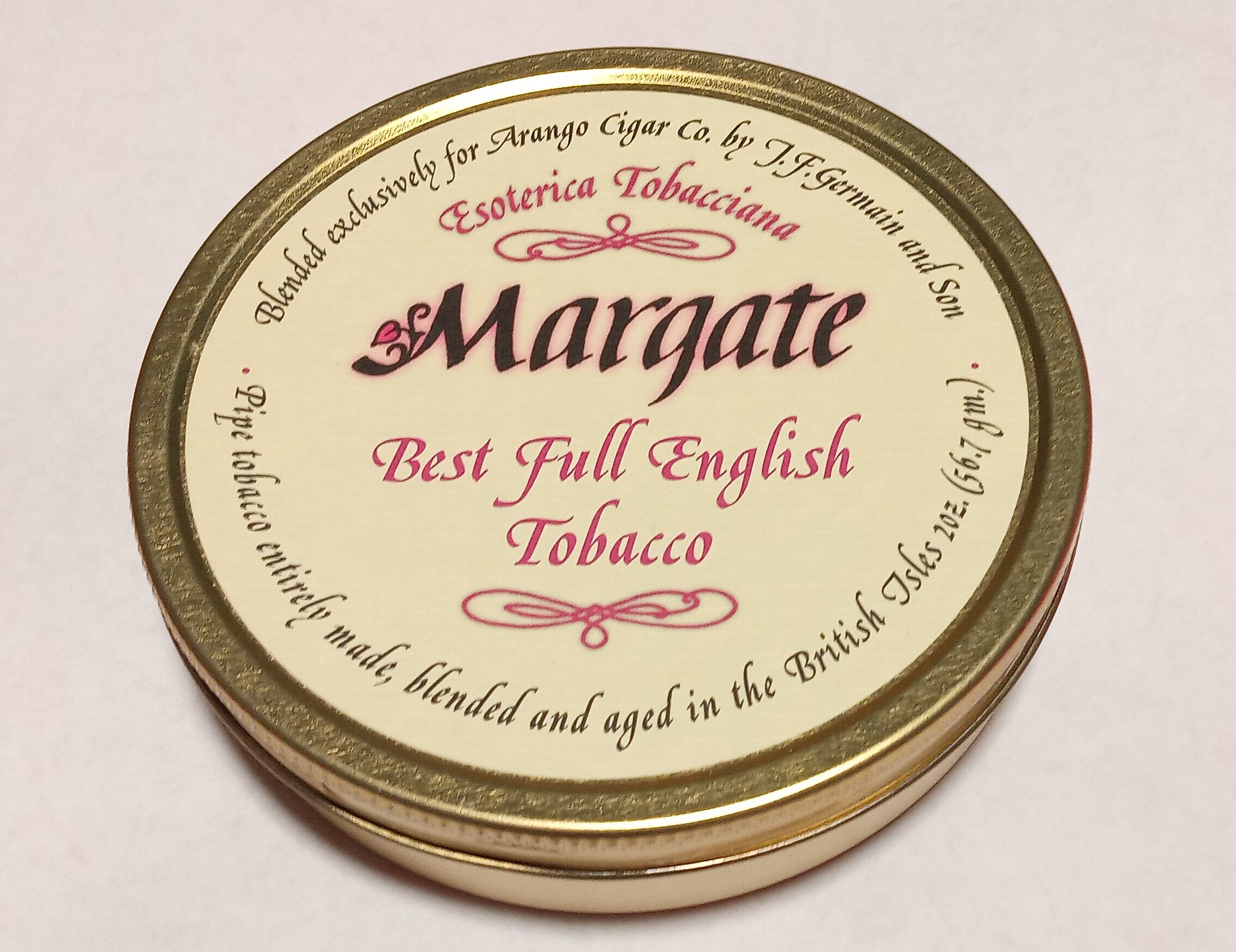 with over 4 years of aging, the tin of Margate is ready to be enjoyed. A classic English mixture done in the "old style" of many of the fine tobaccos that have now disappeared from the marketplace. Choice Orientals, matured Virginias, and generous quantities of premium Cyprian latakia keynote this rich, full-bodied blend. A well-balanced, robust, and eminently satisfying