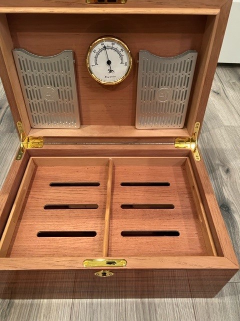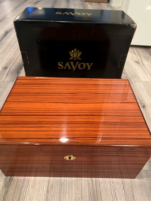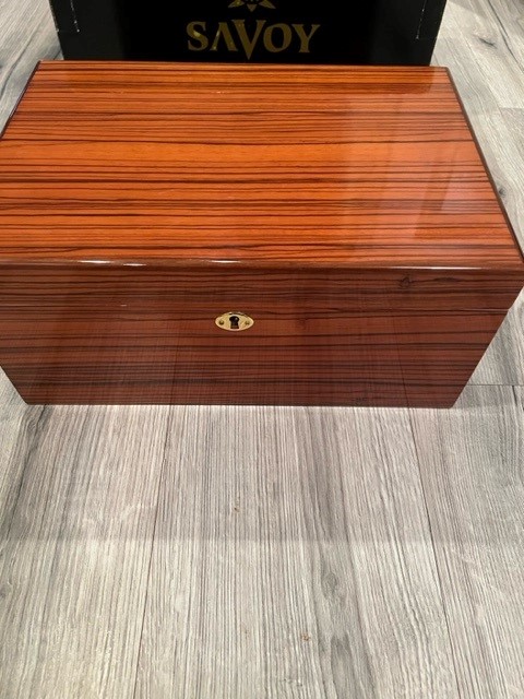 Very nice zebra wood Savoy humidor that holds up to 75 cigars. Has original box with aluminum Boveda humidity equipment. Approx size is 16x8x10 inches and approximately 4 pounds.