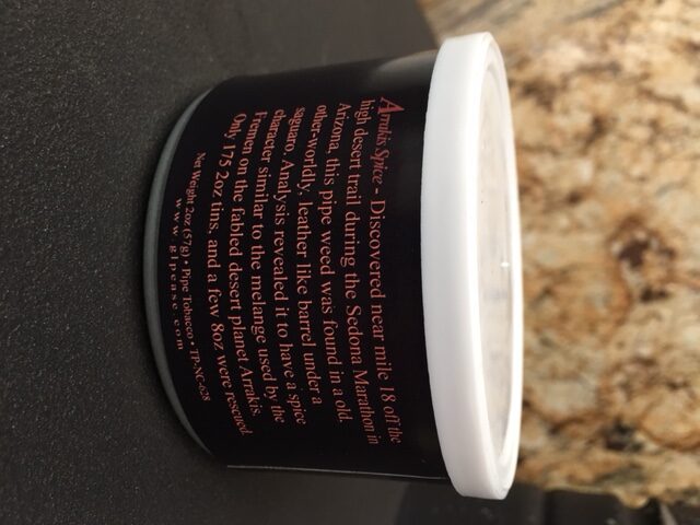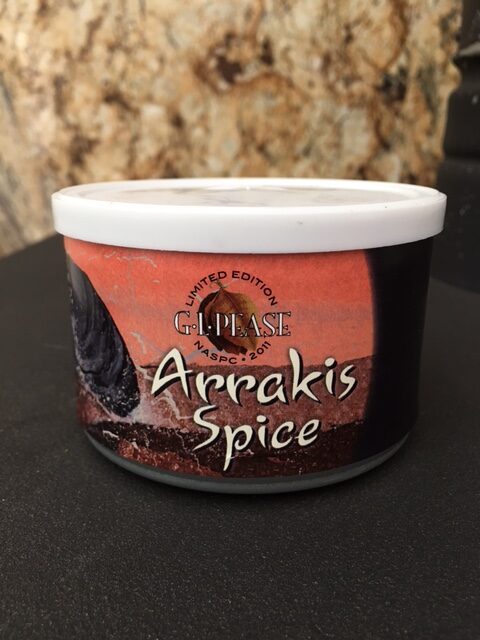 2oz tin produced exclusively by GL Pease for the 2011 NASPC Pipe and Tobacco Show. Limited production of 175 tins. Reputed to be similar to the infamous Spice mined on the desert planet Arrakis in Dune.