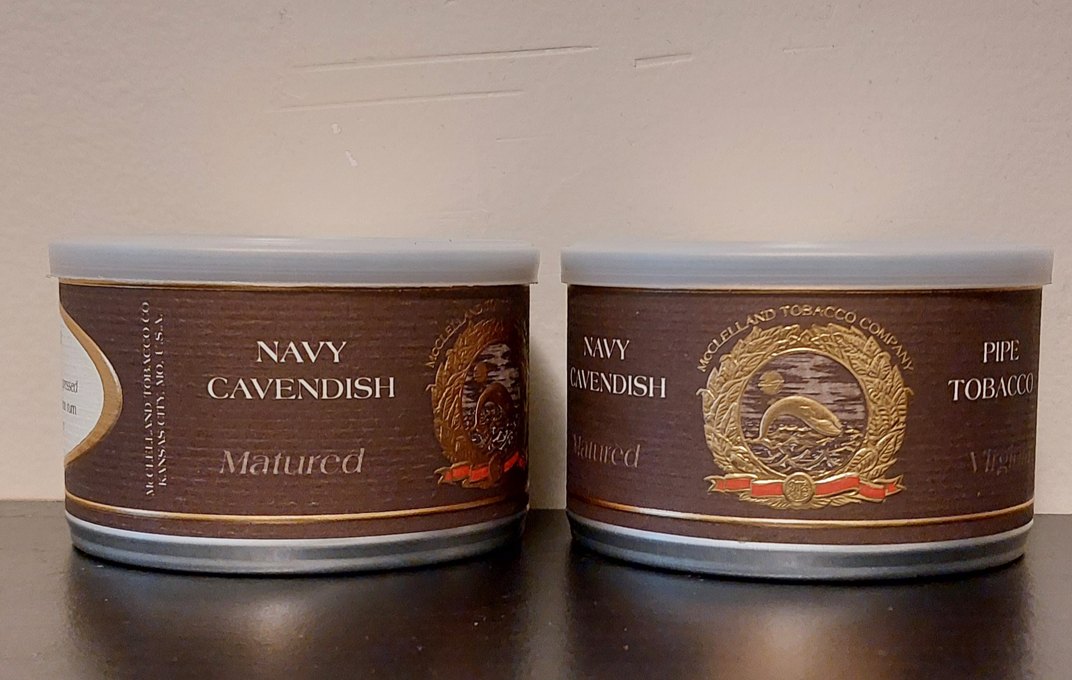 Here are two 50g tins of McClelland's Navy Cavendish, a Virginia based blend, pressed and aged with dark Jamaican Rum. Rich and deep, no one else has come close.