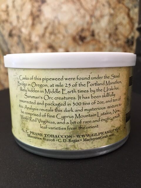 2oz tin, blended by GL Pease exclusively for the 2008 NASPC Pipe and Tobacco Show. Middle Earth themed. Production limited to 300 tins. It was the only blend offered at the show that year.