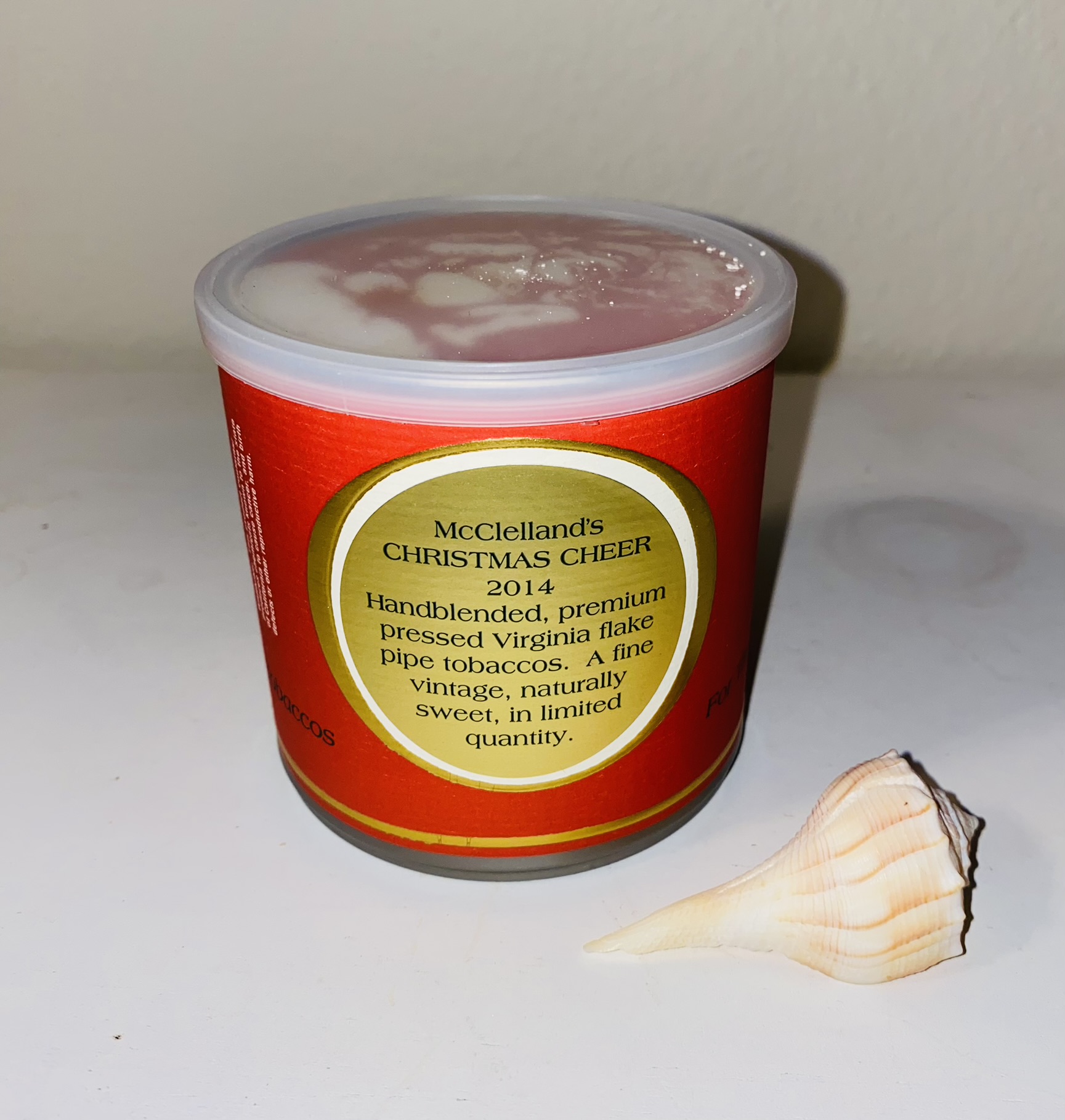 Notes: From tin insert: We are proud to offer our 2014 Christmas Cheer pipe tobacco, an exceptionally fine vintage tobacco, hand blended and aged in pressed cakes to develop natural mellowness. This 2014 blend is made with a special selection of red flue-cured Virginia from an outstanding 2009 crop near Snow Hill, North Carolina. Superb sun-dappled leaf picked at peak ripeness, it is high in natural sugars, rich in oils. It should age extremely well in the tin. Each buying session, we look for tobaccos of exceptional quality and distinctive character. In various combinations their flavors, aromas, textures contribute to the overall excellence of all our products.