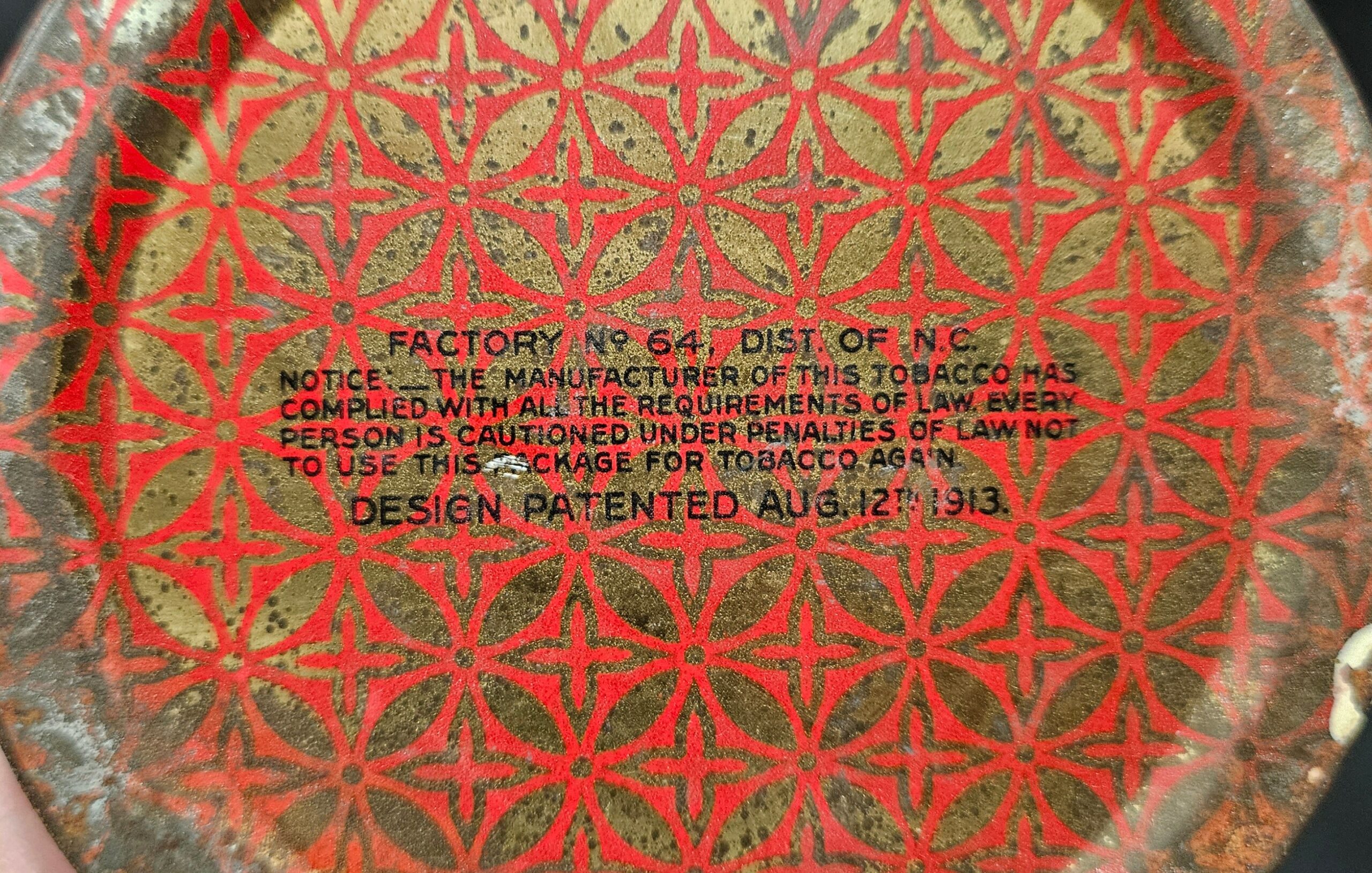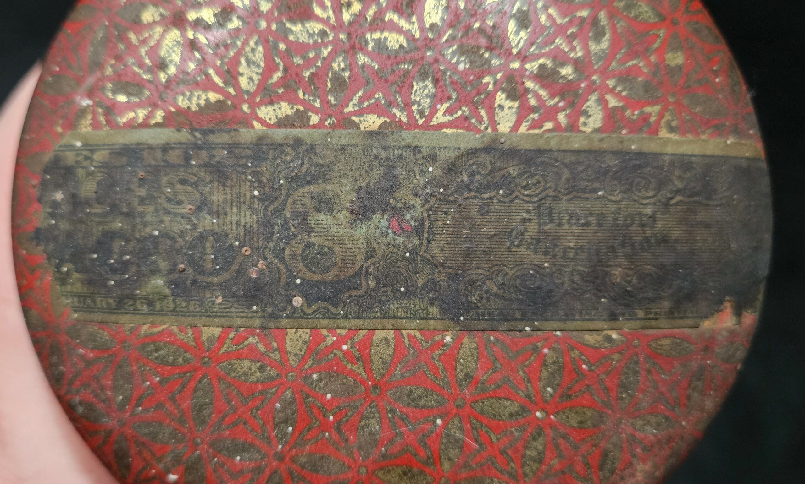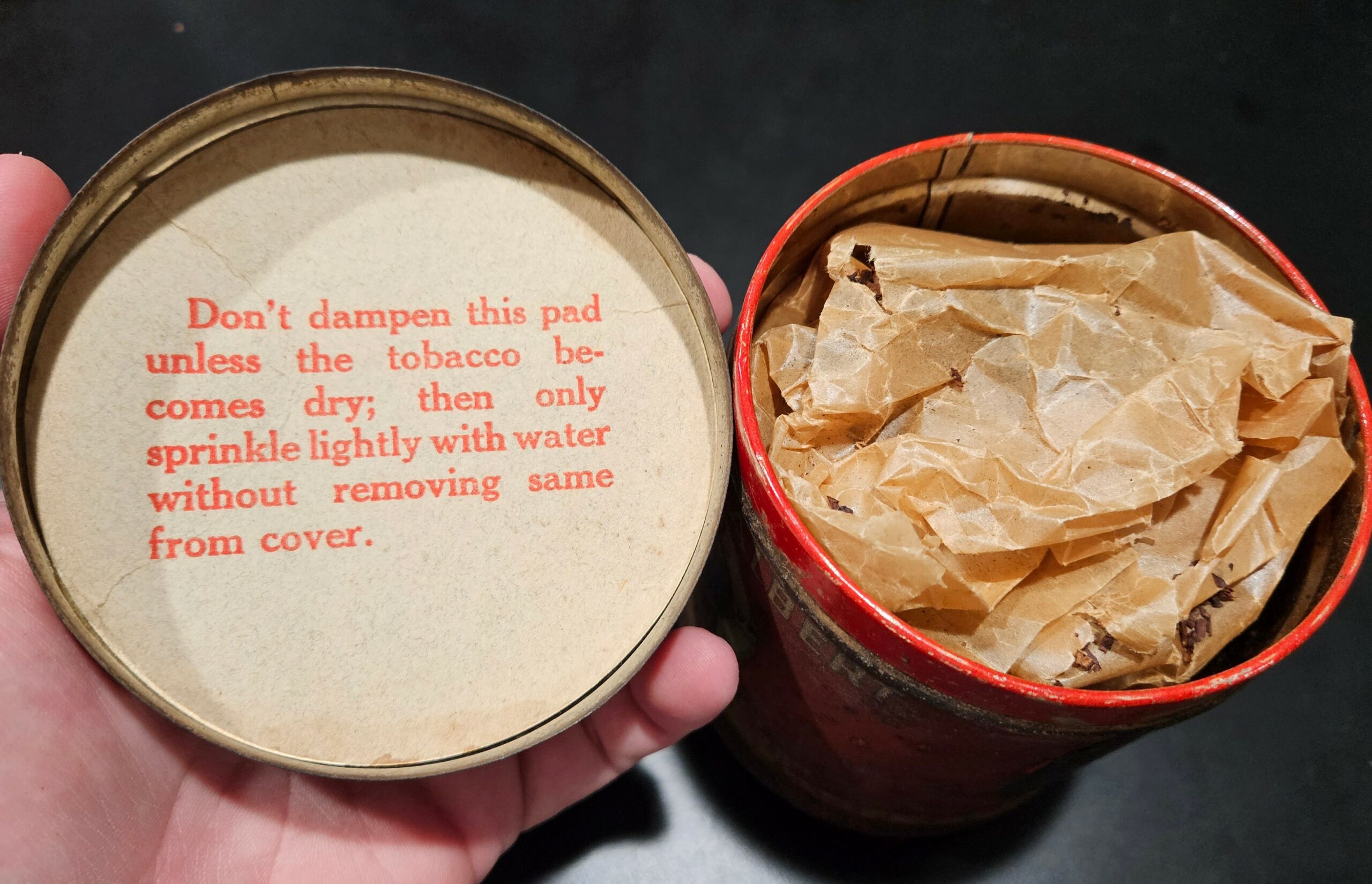 Very old tin with 1926 tax stamp over 3/4 full of old dry tobacco.