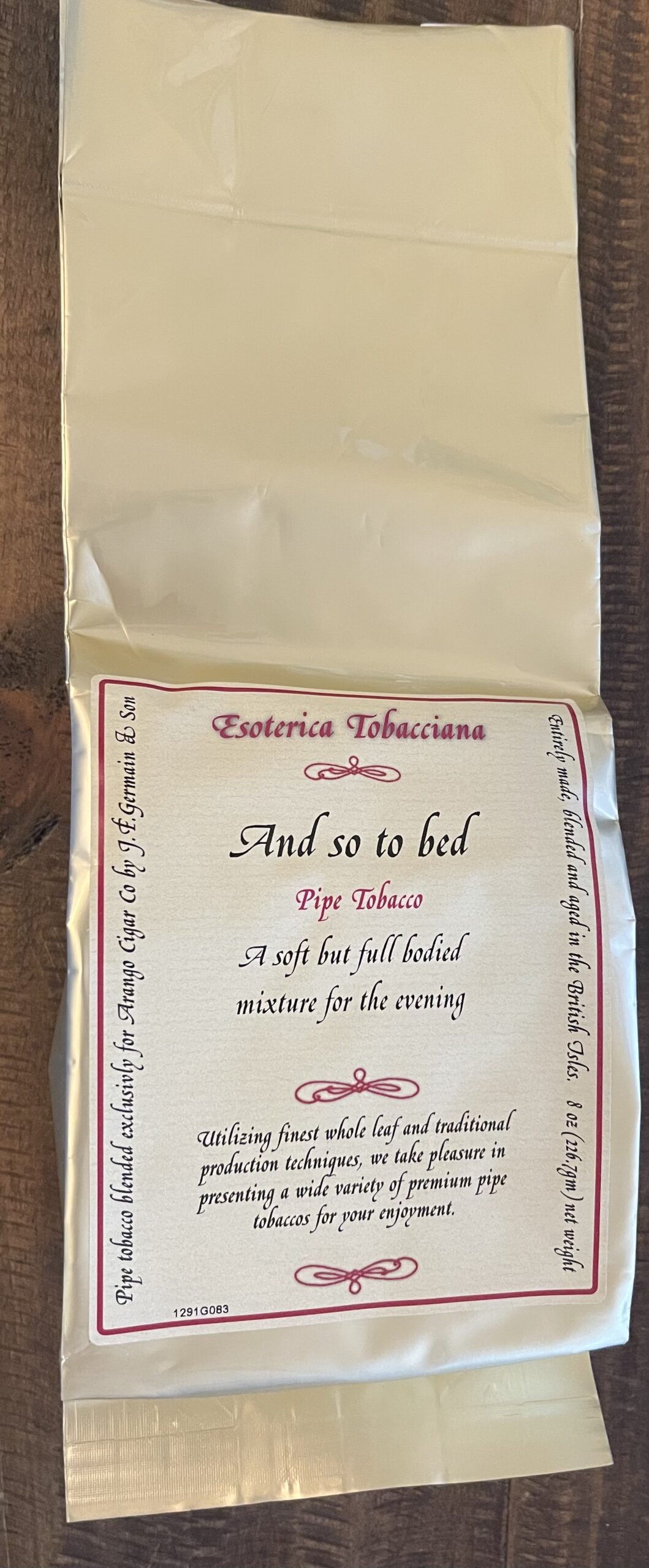 Esoterica And So To Bed is a marriage of high-grade Virginia and Maryland leaf, Greek Orientals and top shelf Cyprian Latakia. The blend is specially processed and matured to produce a mellow, full-strength smoke with rich flavor and a unique aroma.