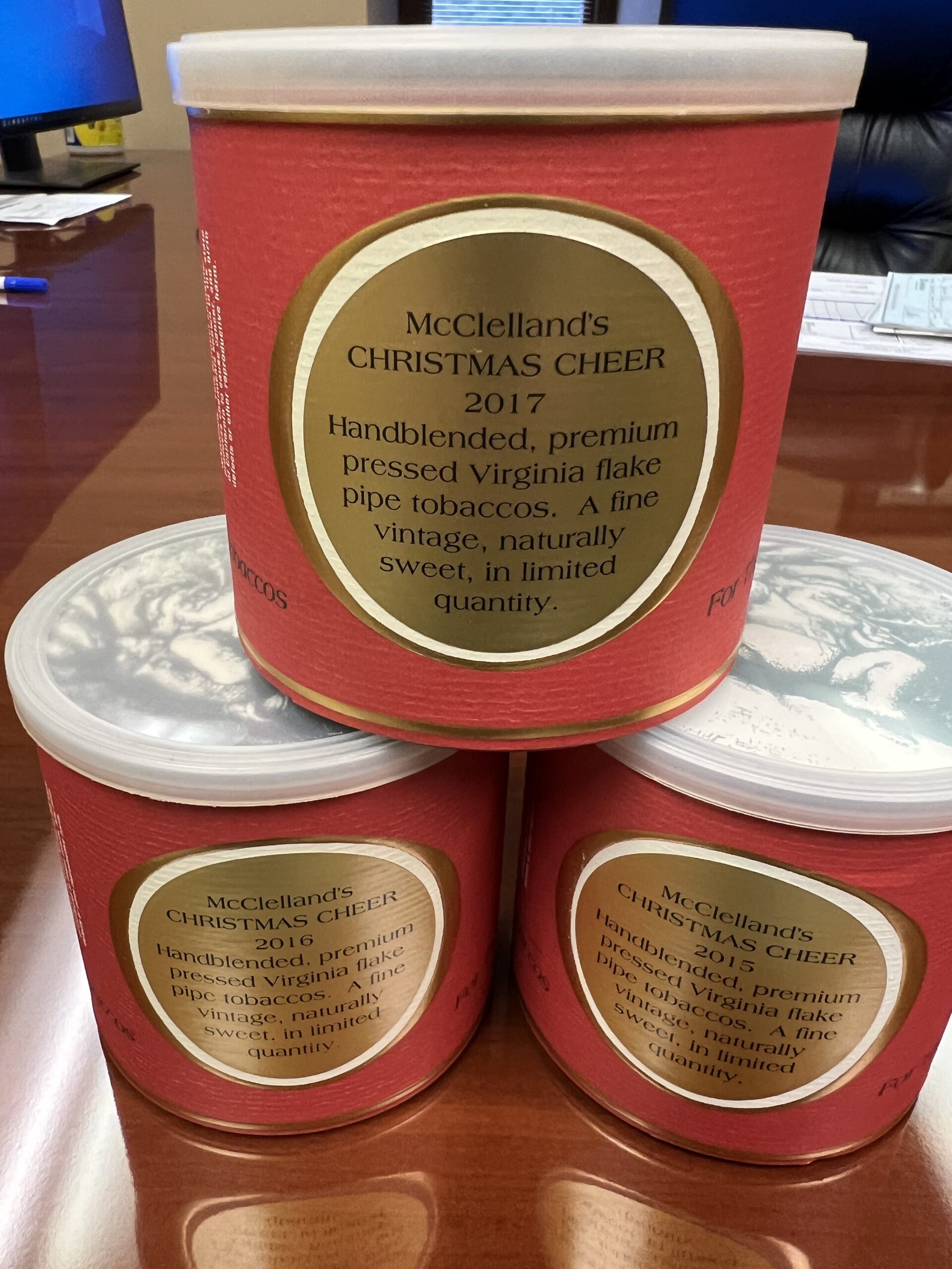 This auction is for three (3) tins of McClellandâs Christmas Cheer Flake, one tin from 2015, 2016 and 2017.