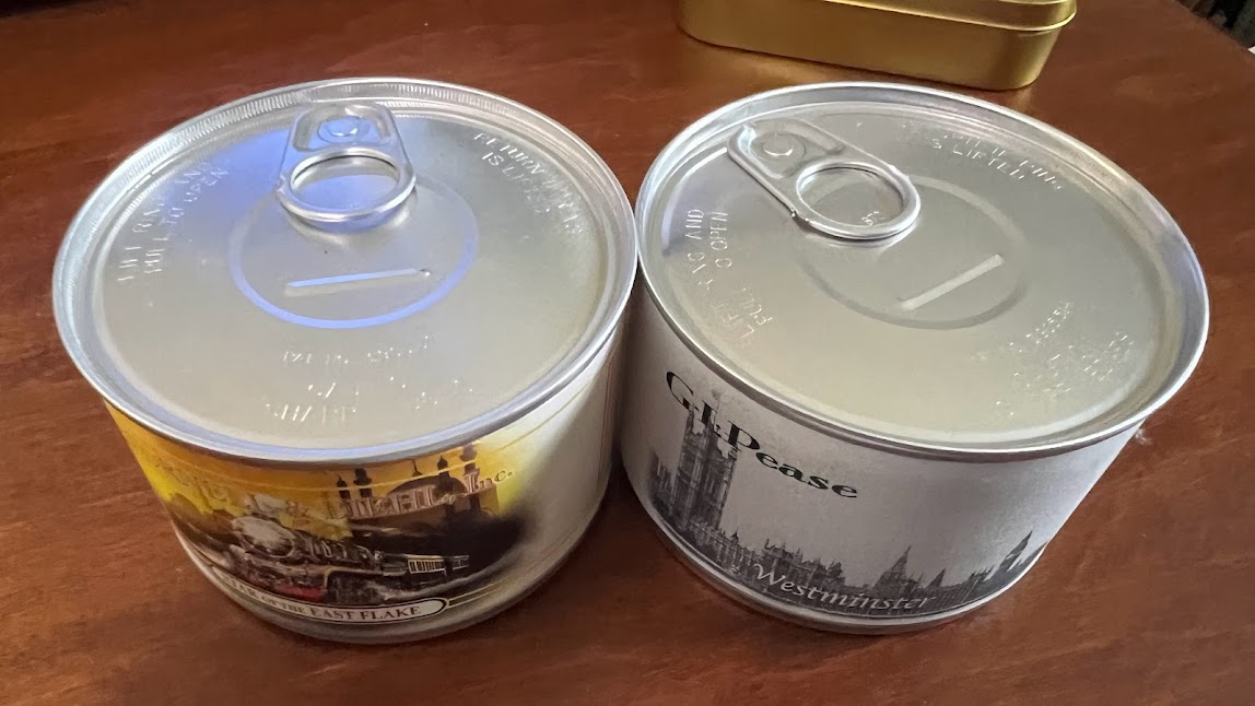 One 2 ounce tin of G.L. Pease Westminster blend with Red Virginias enhanced with bright leaf, Orientals, and Cyprian Latakia. A great interpretation of the classic English blend. Tin is dated March 2010.