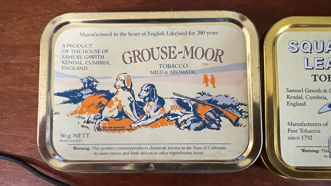 One 50 gram tin of Samuel Gawith Grouse-Moor, a “Mild & Aromatic” Lakeland blend, with Virginia tobaccos and floral and citrus flavoring in a ribbon cut. Cellared in 2013.