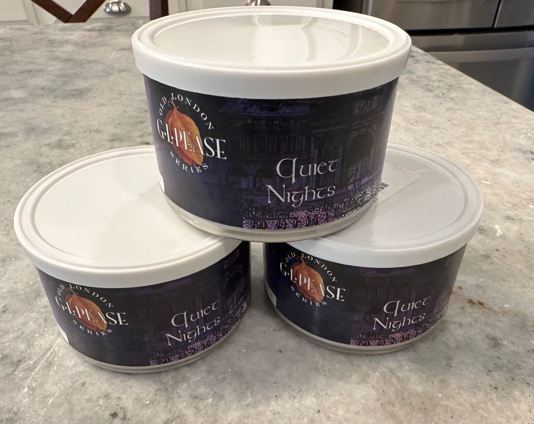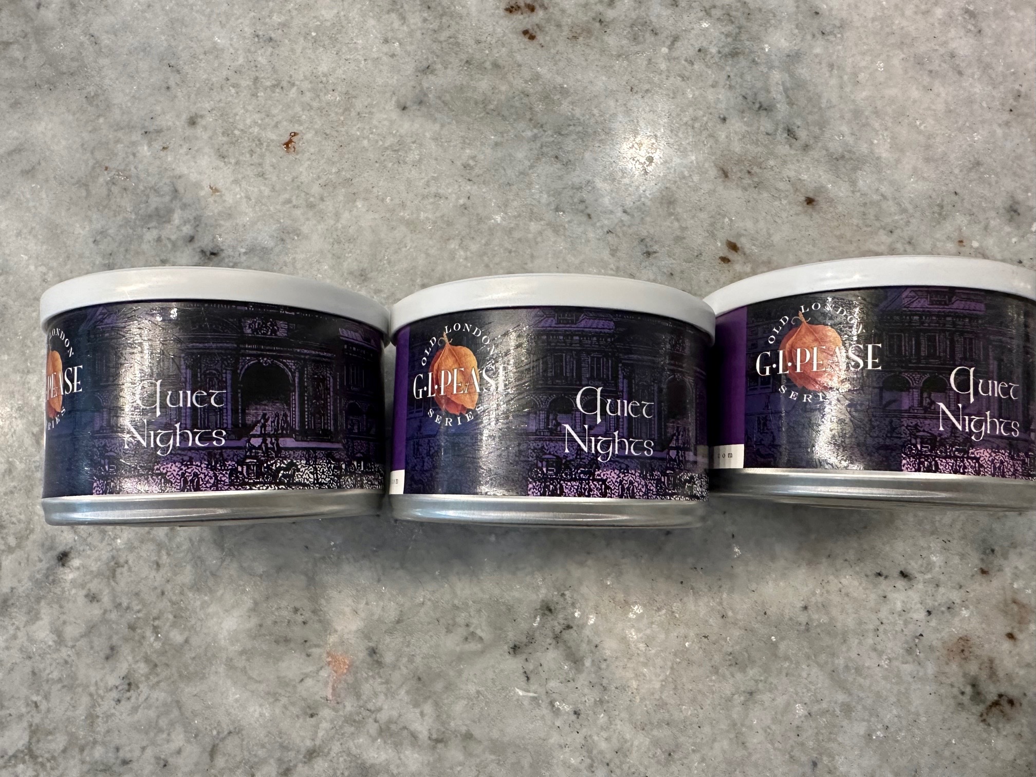 Hello, this 3-day auction is for three (3) sealed 2-ounce tins of GL Pease Quiet Nights. Two of the tins are 2017 production and one tin is 2018 production.