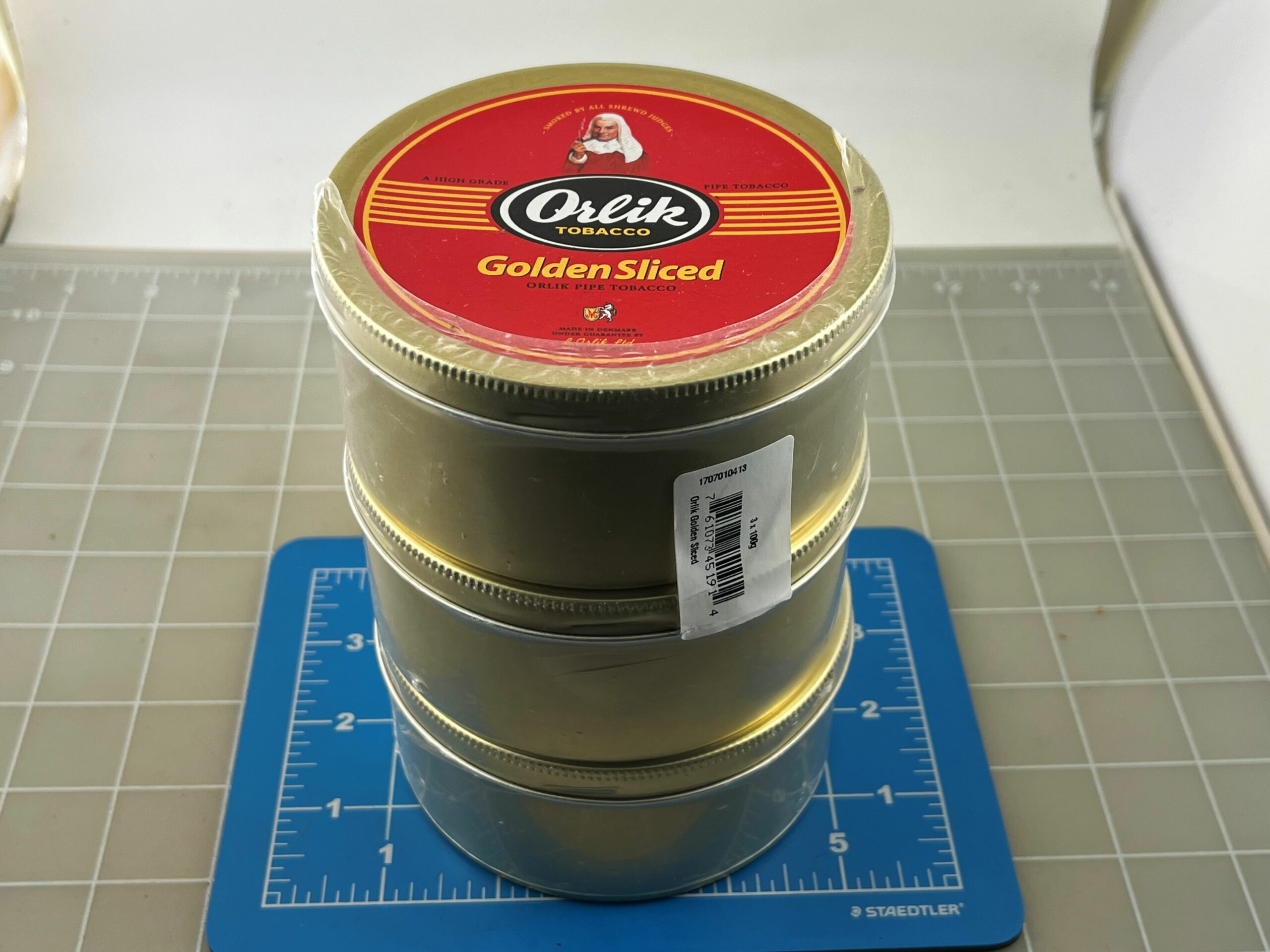 3 Excellent Sealed Orlik Golden Sliced 100g Tins in Original Seal Wrap.