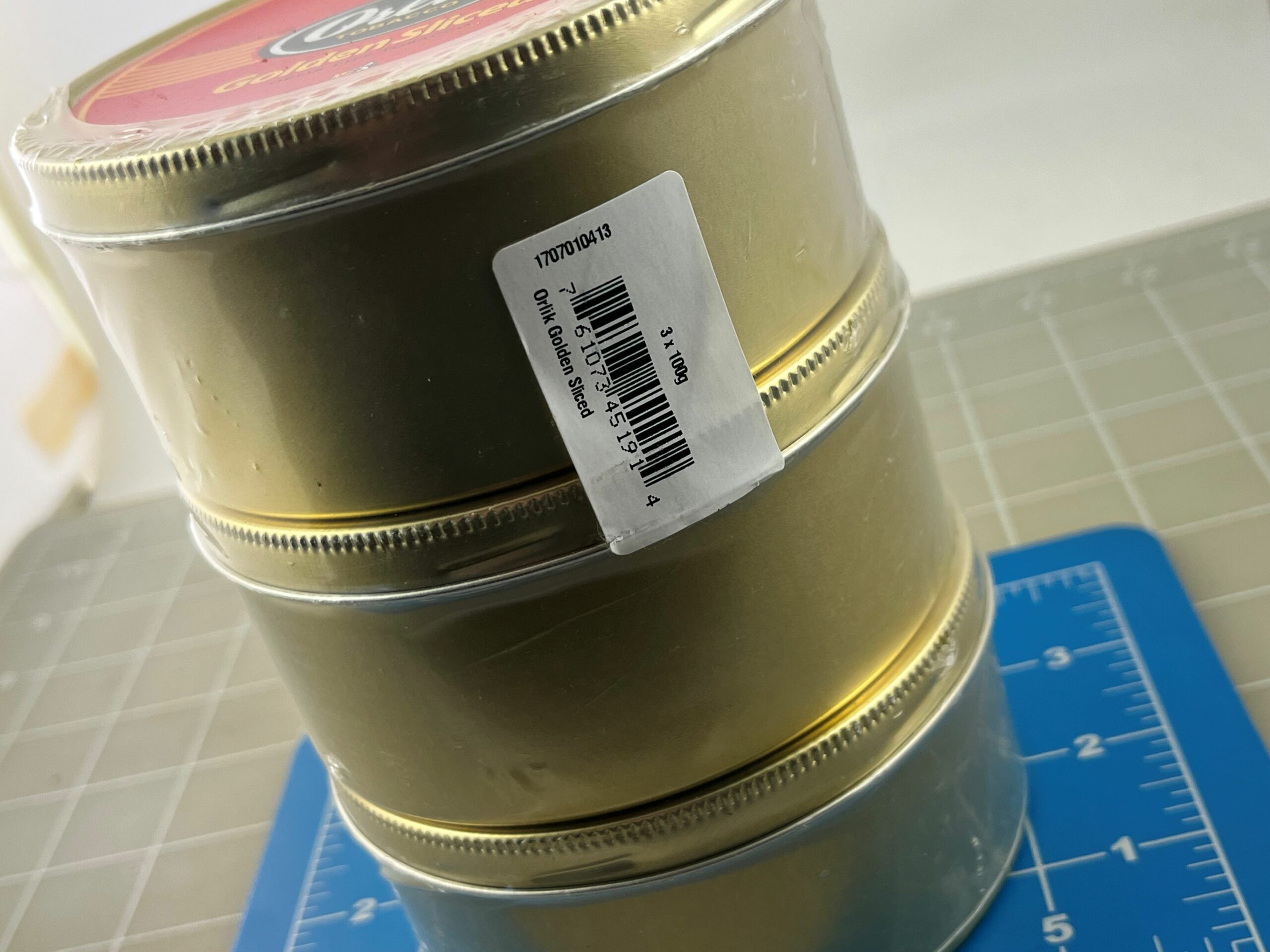 3 Excellent Sealed Orlik Golden Sliced 100g Tins in Original Seal Wrap