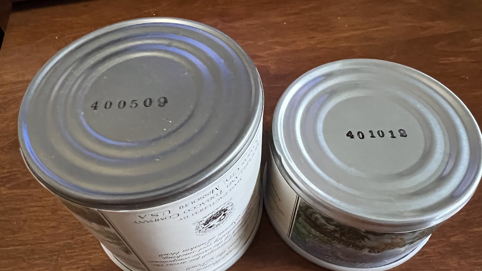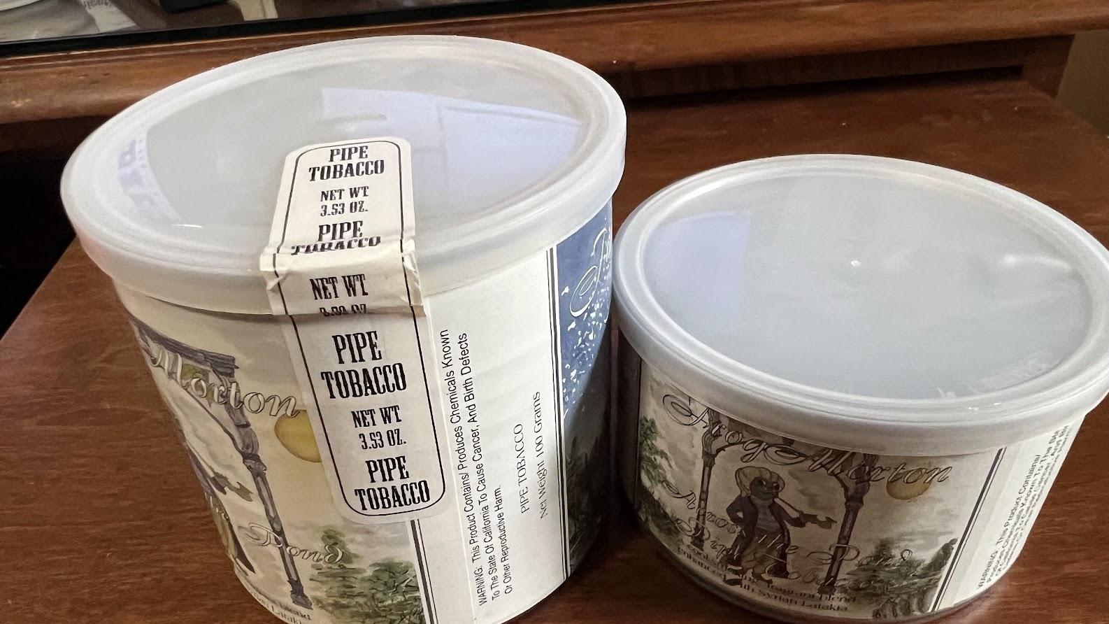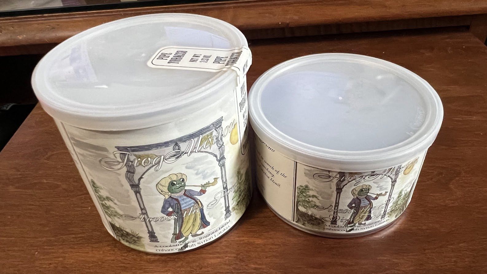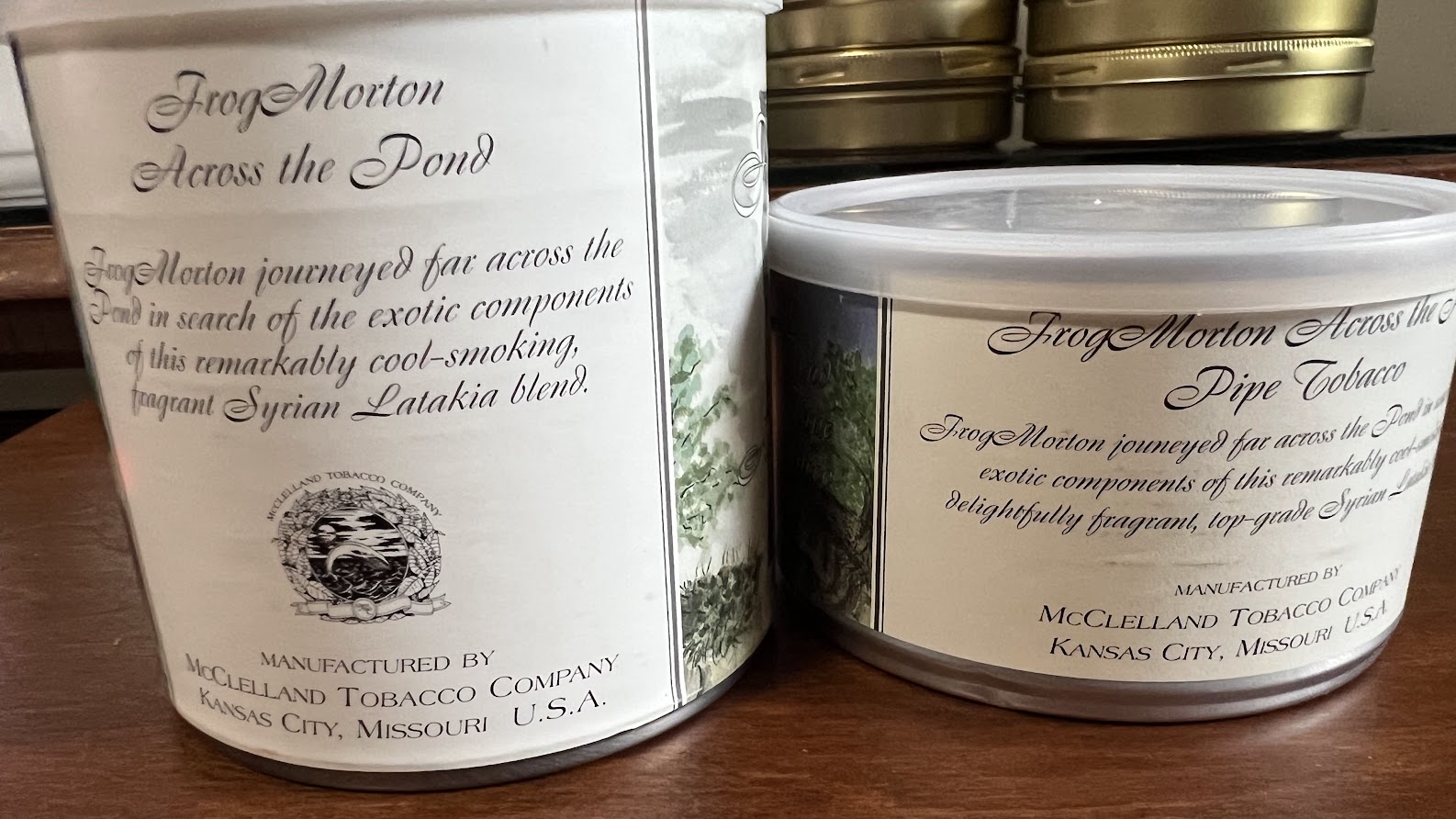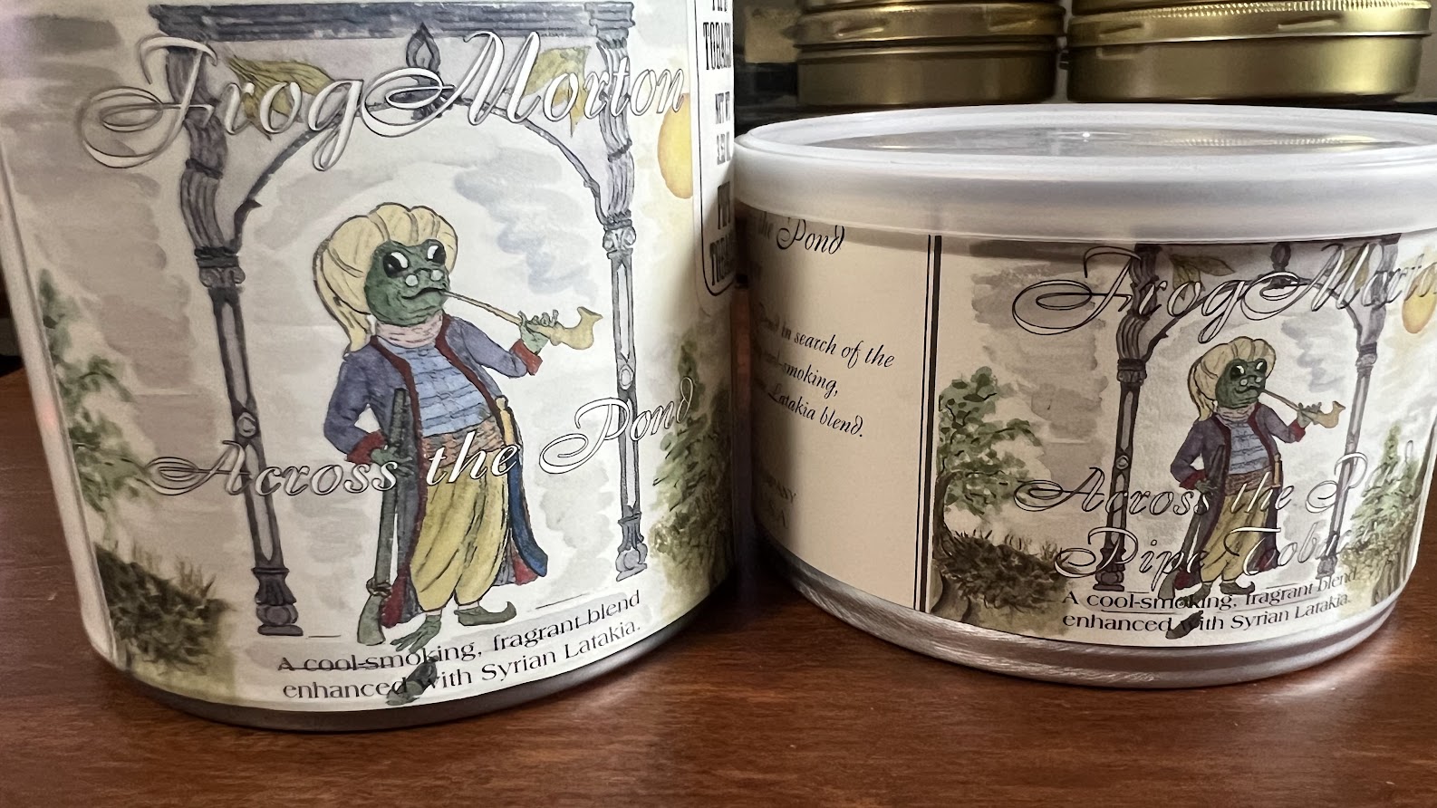 One 100-gram tin and one 50-gram tin of McClelland's Frog Morton Across the Pond, with Syrian Latakia, The 100-gram tin is from 2009. The 50-gram tin is from 2012.