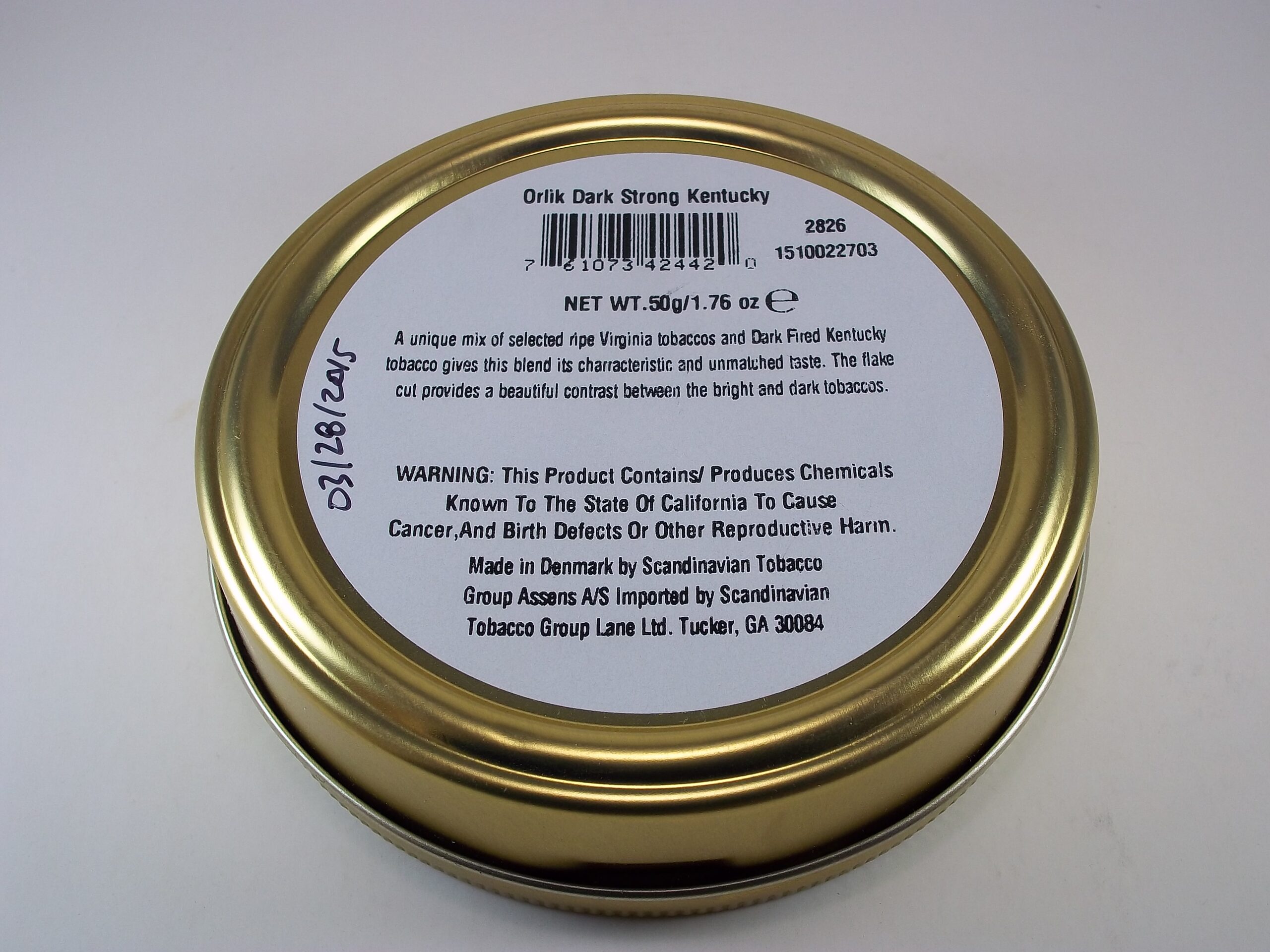 Sealed tin of Orlik Dark Strong Kentucky. Purchased in March 2015. Date code is 1510022703, so if I got it right it was produced on Feb 3, 2015.