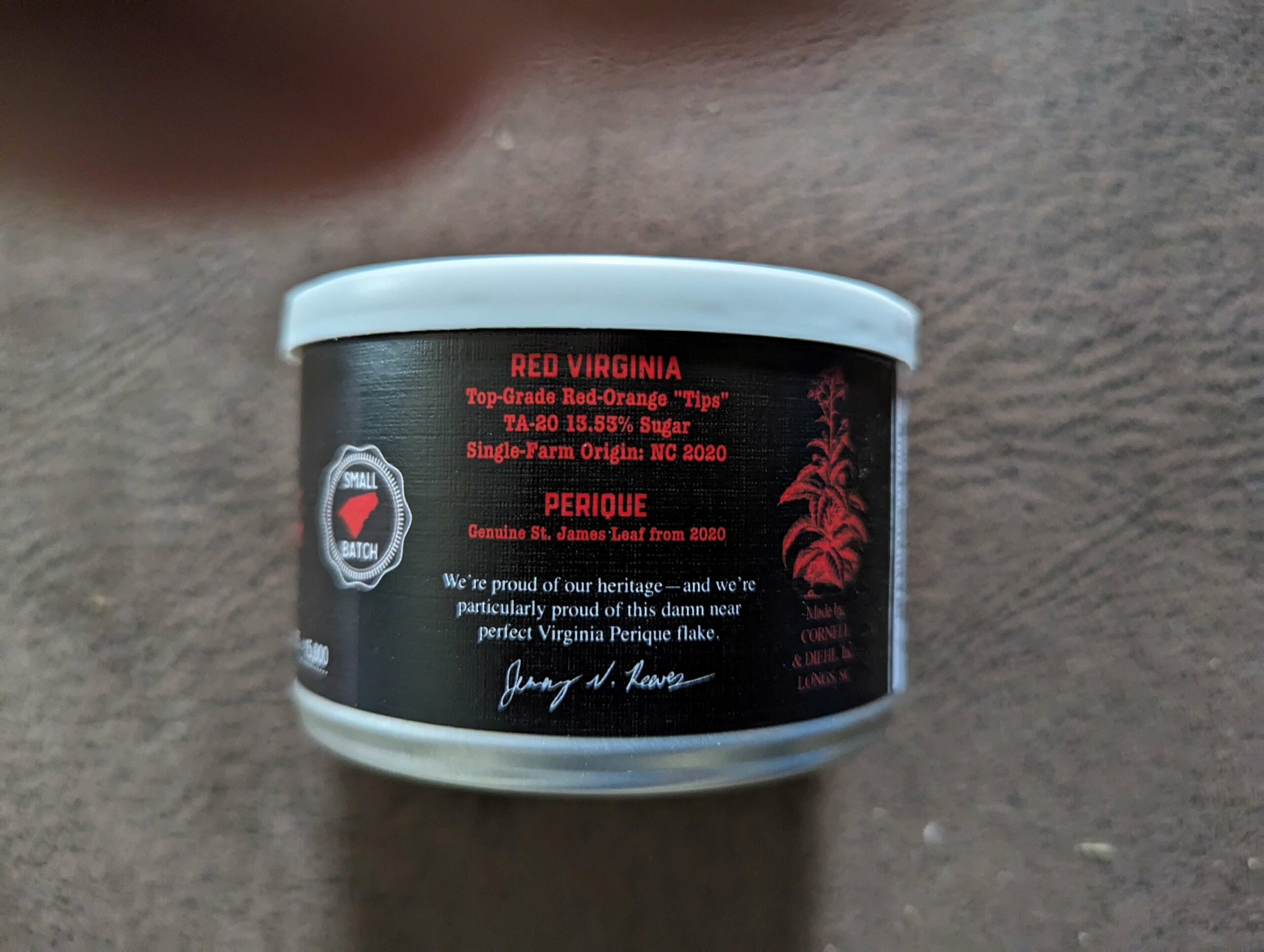From the tin: "We created Carolina Red Flake as a tribute to the Old Belt, to the traditional harvesting and processing of Carolina tobacco straight from Carolina soil. Building on that tradition, Carolina Red Flake with Perique elevates equal measures of stoved and unstoved, single-farm, North Carolina Red-Orange Virginia tips from 2020 with a generous portion of genuine St. James Perique. The resulting flavor balances pepper and spice with undertones of port wine, stone fruits, and citrus. it's rich, deep and complex. It's how a Virginia/Perique flake should be."