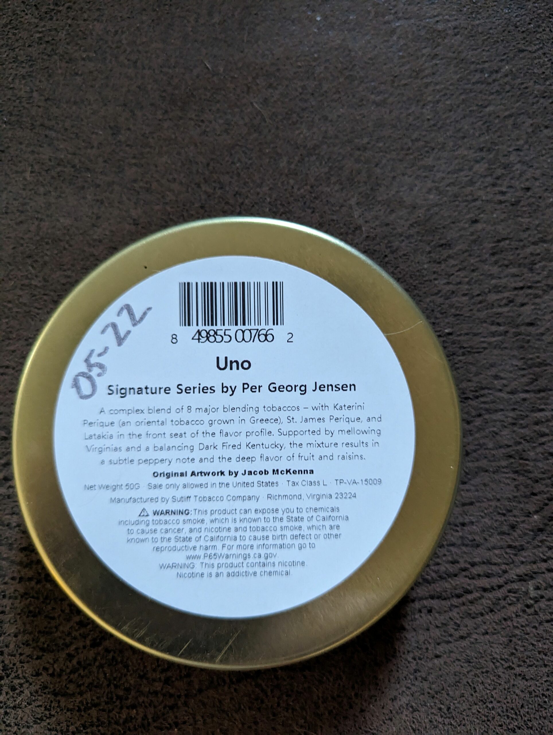 From the tin: "A complex blend of 8 major blending tobaccos - with Katerini Perique (an oriental tobacco grown in Greece), St. James Perique, and Latakia in the front seat of the flavor profile. Supported by mellowing Virginias and a balancing Dark Fired Kentucky, the mixture results in a subtle peppery note and the deep flavor of fruit and raisins."