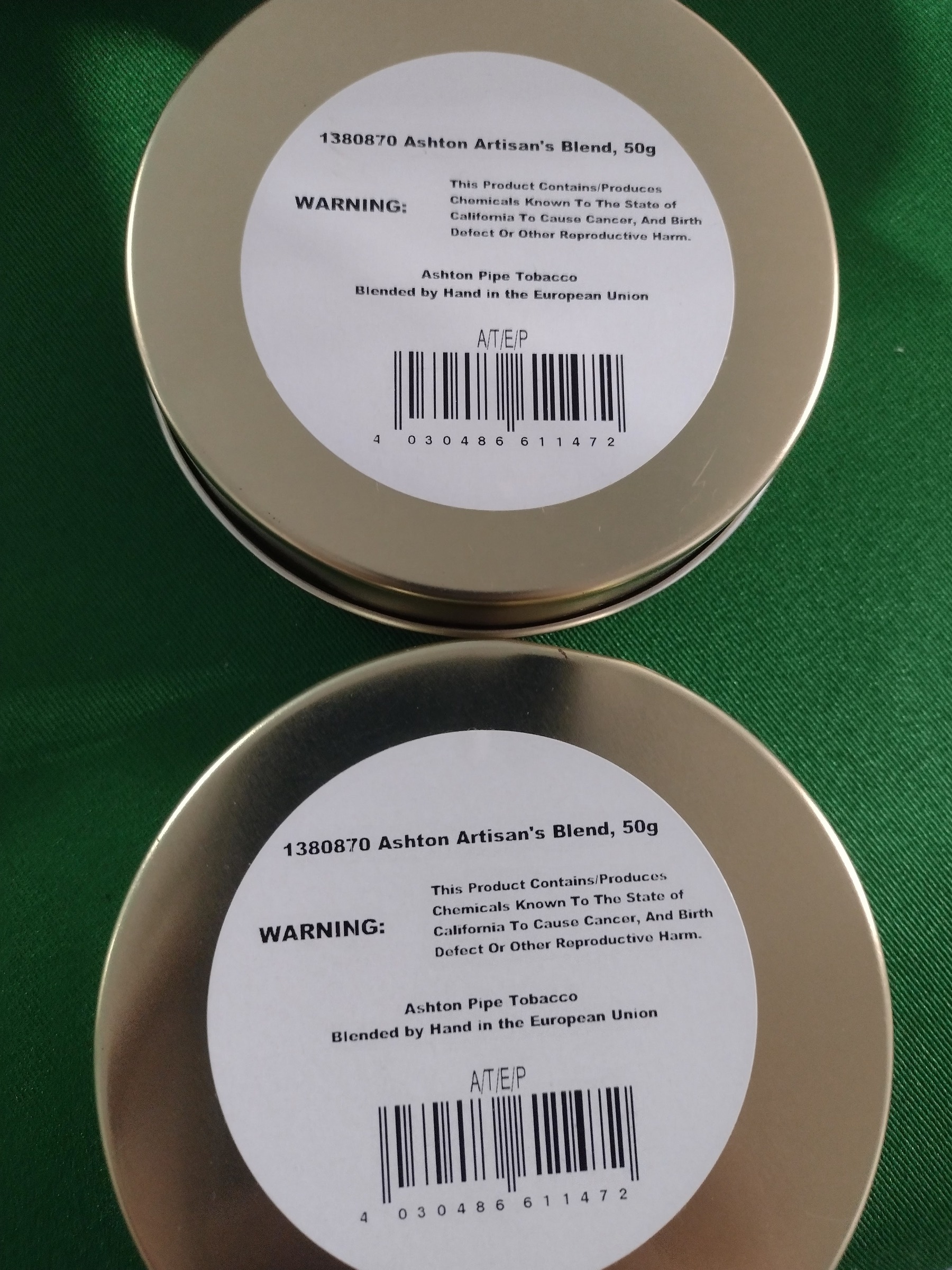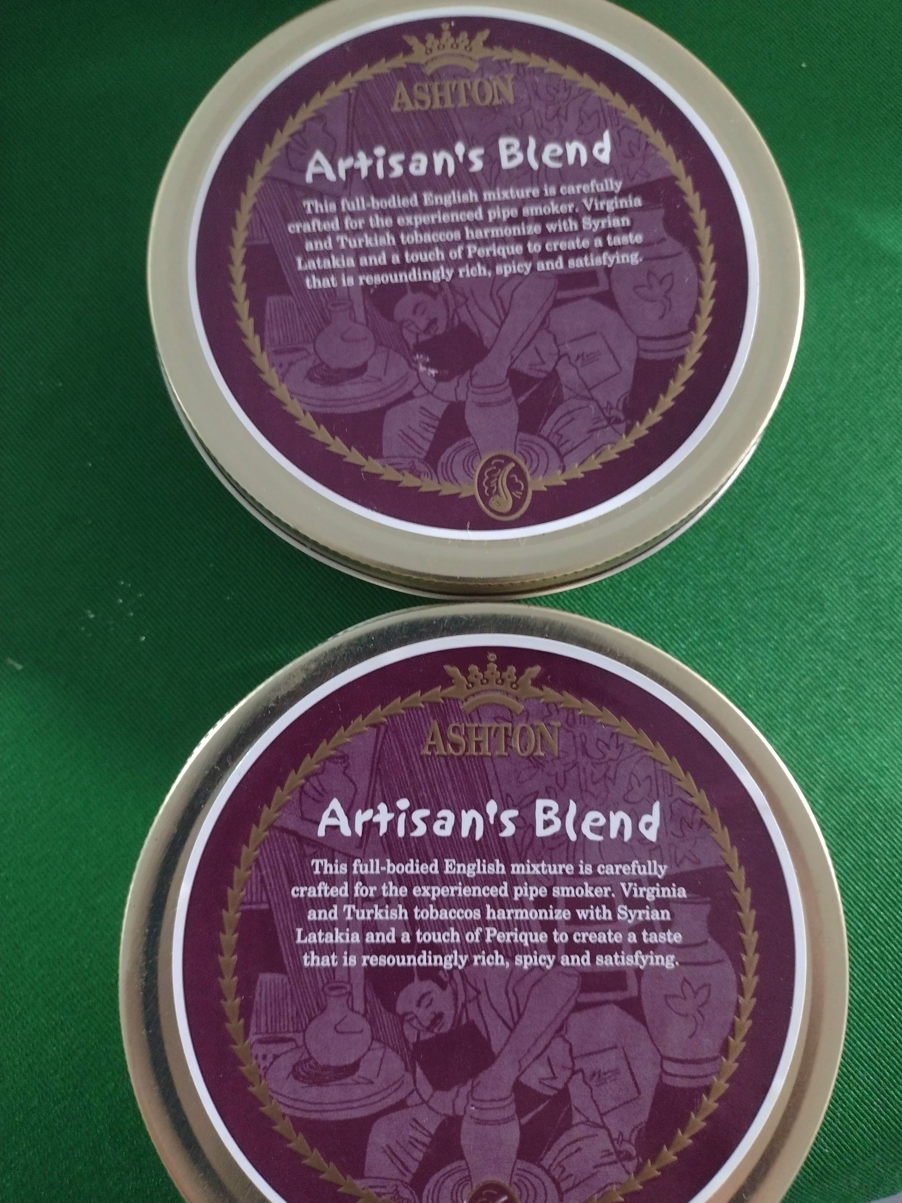 Two 50g tins of Ashton's Artisan's Blend with Syrian Latakia. I'm guessing the date at 2018. Quick 3 day auction.