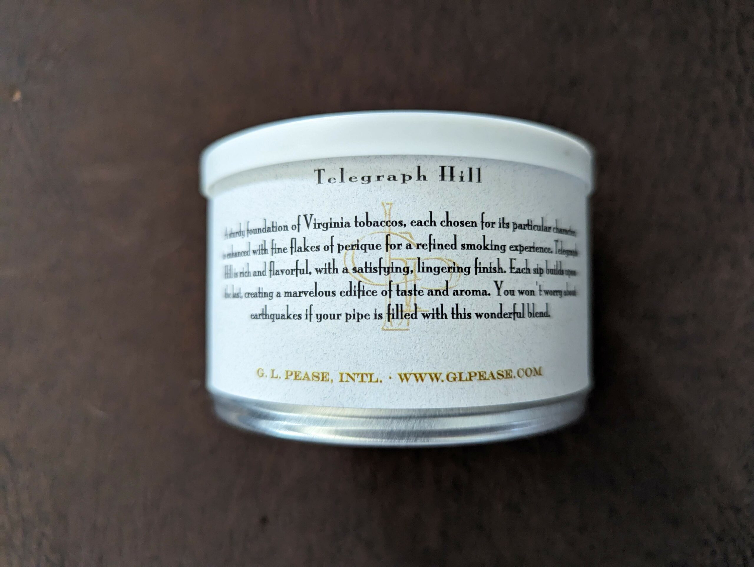 From the tin: "A sturdy foundation of Virginia tobaccos, each chosen for its particular character, is enhanced with fine flakes of perique for a refined smoking experience. Telegraph Hill is rich and flavorful, with a satisfying, lingering finish. Each sip builds upon the last, creating a marvelous edifice of taste and aroma. You won't worry about earthquakes if your pipe is filled with this wonderful blend."