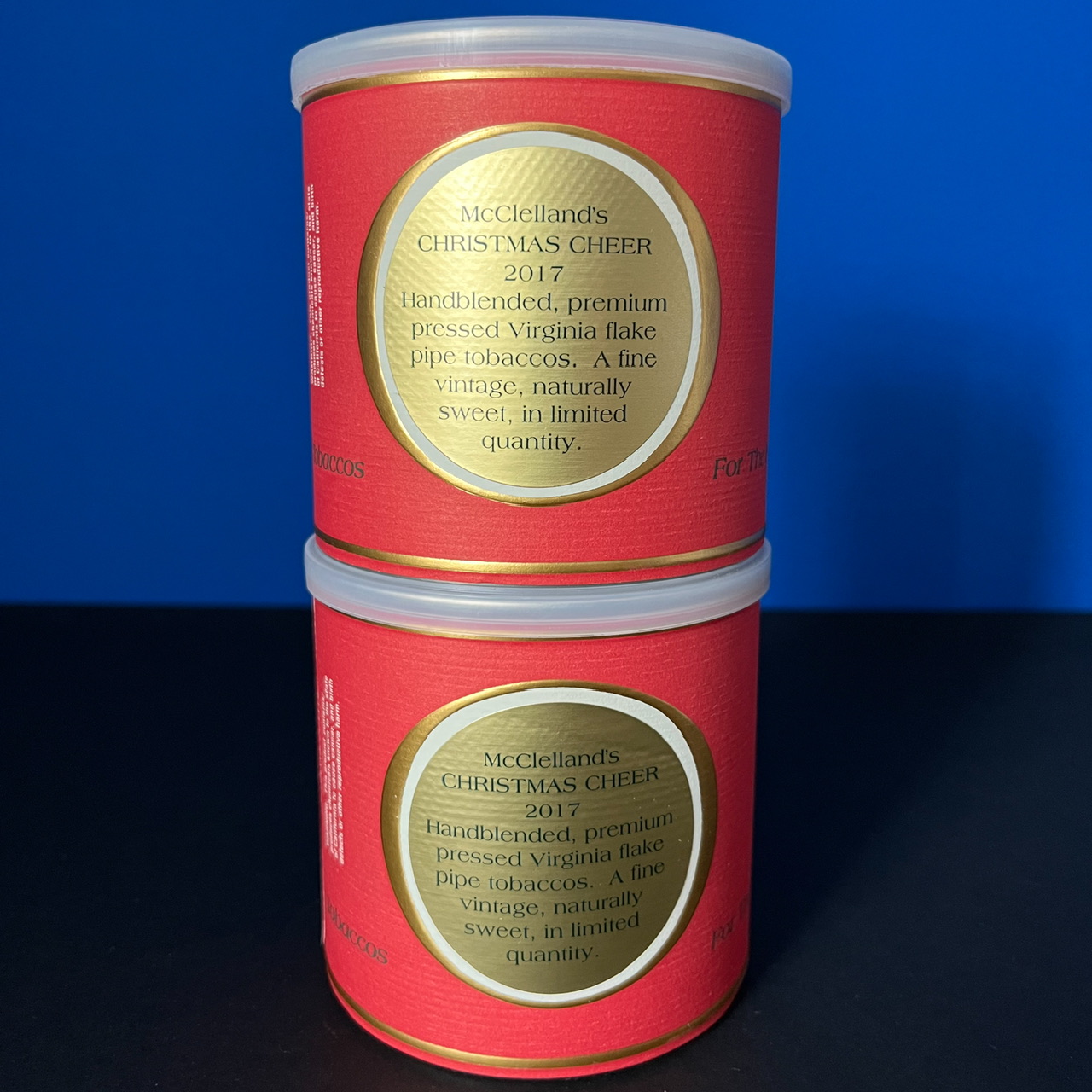 You are bidding on two (2) tins of McClelland’s famous Christmas Cheer red Virginia flake from 2017. Tins have typical shake for McClelland tins (they do not vacuum seal) and seals appear intact.
