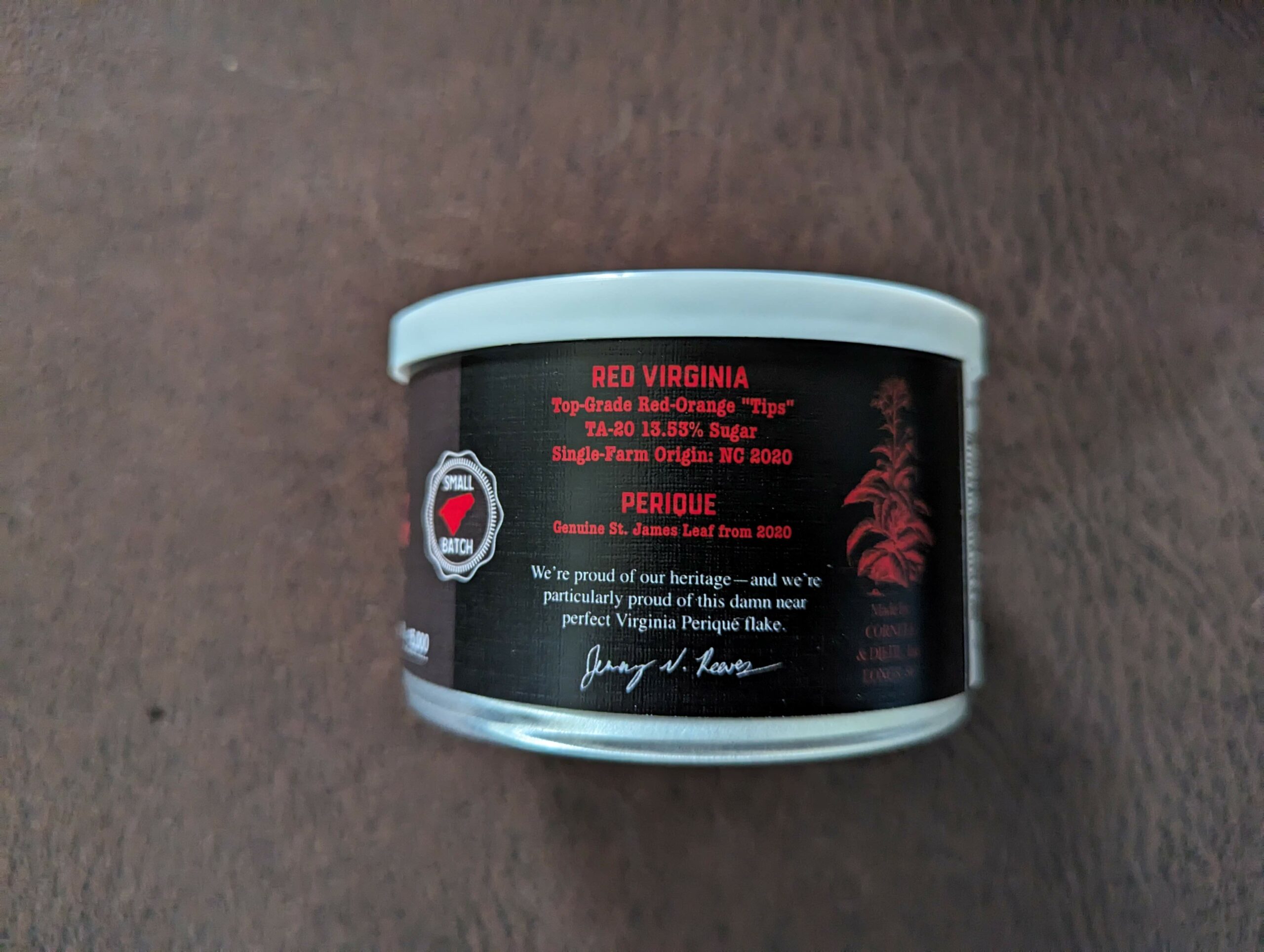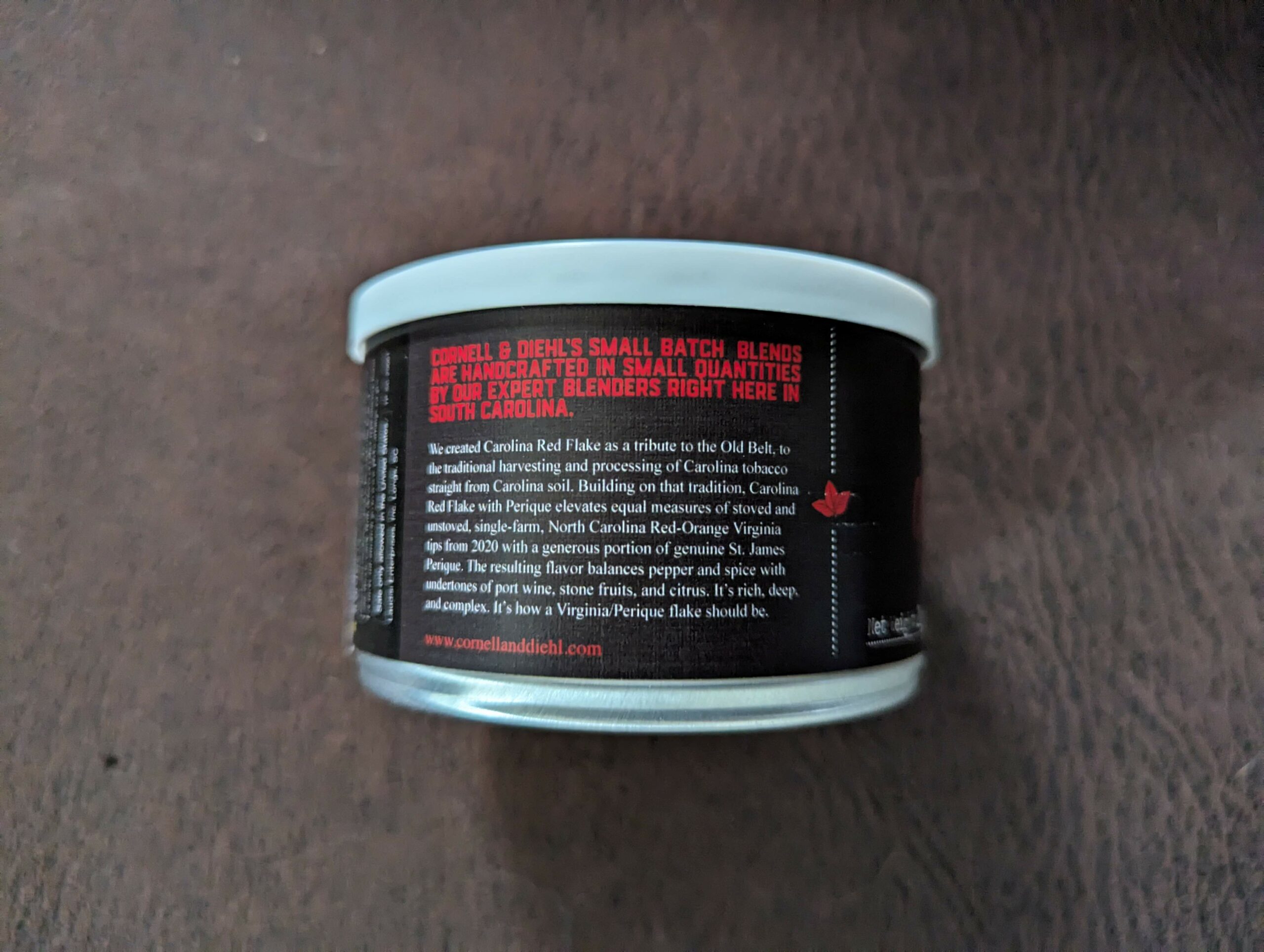 From the tin: "We created Carolina Red Flake as a tribute to the Old Belt, to the traditional harvesting and processing of Carolina tobacco straight from Carolina soil. Building on that tradition, Carolina Red Flake with Perique elevates equal measures of stoved and unstoved, single-farm, North Carolina Red-Orange Virginia tips from 2020 with a generous portion of genuine St. James Perique. The resulting flavor balances pepper and spice with undertones of port wine, stone fruits, and citrus. It's rich, deep, and complex. It's how a Virginia/Perique flake should be."
